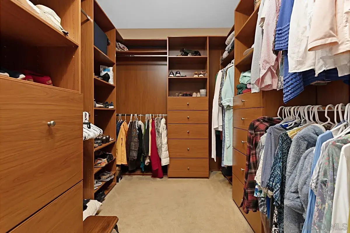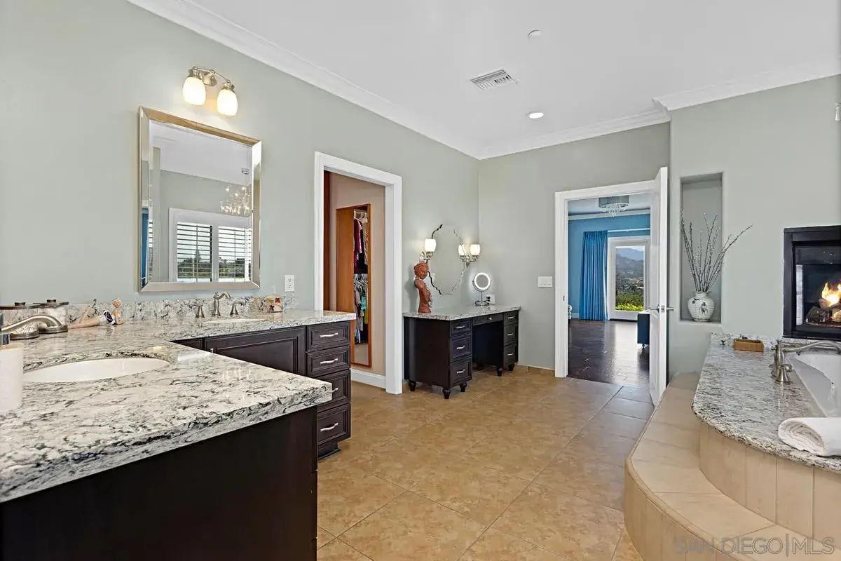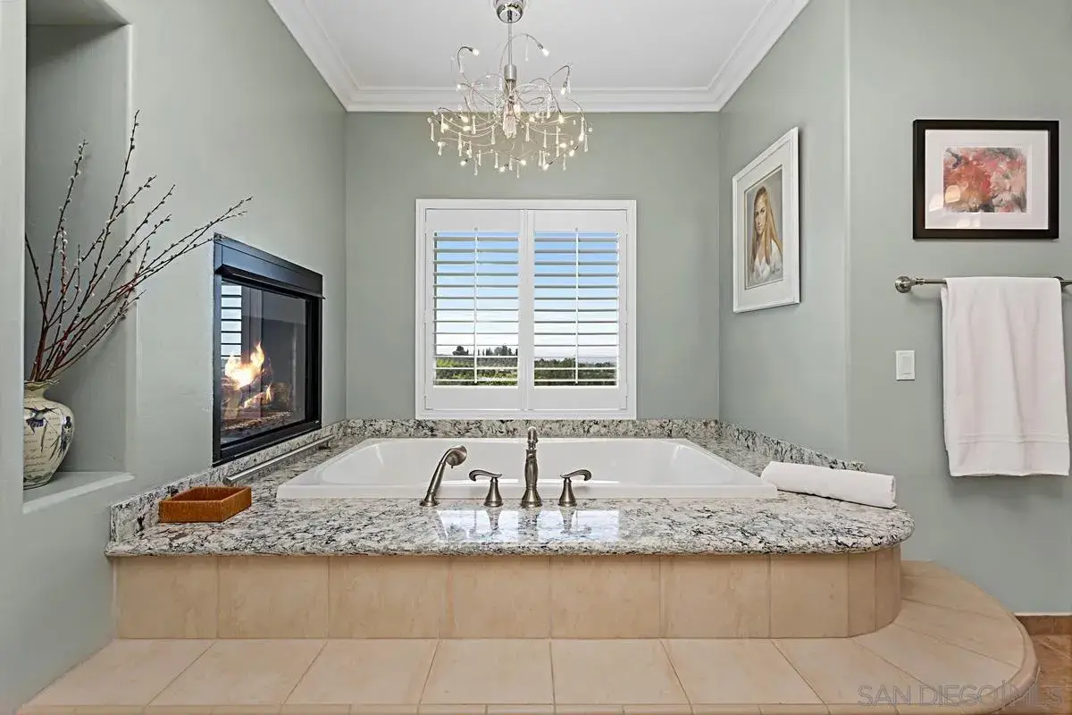 Spa-like primary suite with jetted tub and dual-sided fireplace