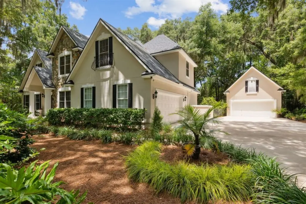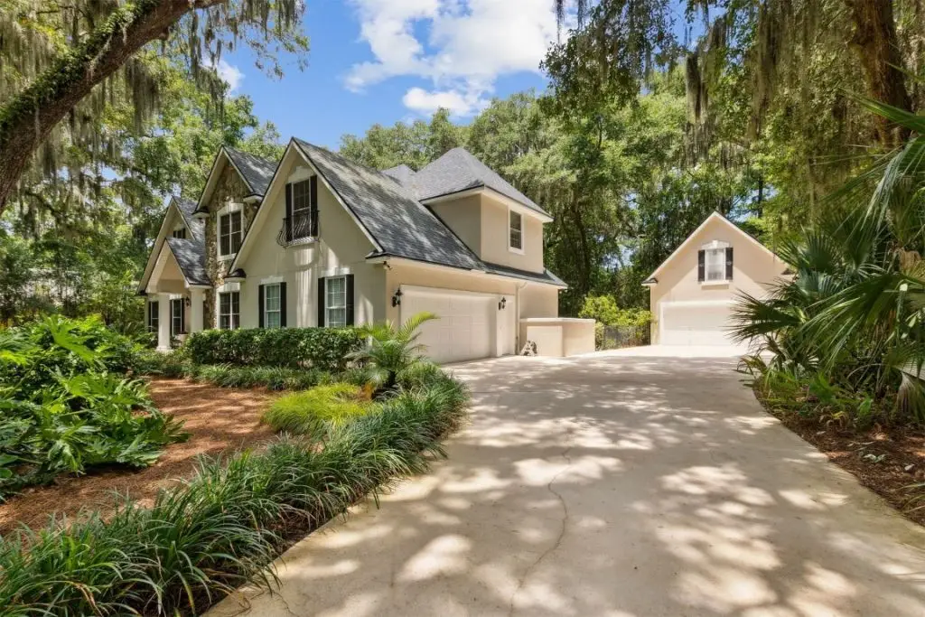 SERENE ELEGANCE, COMBINED WITH MODERN LUXURY. Nestled on an estate-sized lot, this beautiful custom-built home is located in the tranquil neighborhood of PALM BLUFF. Gracious living abounds...glass entry doors lead to a great room with gas fireplace and vaulted ceilings soaring 20 feet; flowing seamlessly into the gourmet kitchen with gleaming granite countertops and stainless-steel appliances, custom cabinetry, and large pantry. Separate formal dining room for entertaining. Breakfast area with bay window overlooking expansive back yard. Large, airy screened porch for enjoying nature. Main level master bedroom suite with 10-foot ceilings; master bathroom with double sinks, soaking tub and separate shower. Upstairs there are 3 additional bedrooms, and a large bathroom. Both the house and screened porch have built-in surround sound speakers. Quality materials throughout, including Anderson windows and doors. Extensive landscaping has been integrated with the existing native trees and foliage, creating a magical, secret garden, and walking paths tucked into the maritime forest. A stone wood-burning firepit is ready for those chilly evenings. Separate carriage house apartment with full bathroom and bedroom; perfect for guests, in-laws, teenagers, man-cave, or rental income. 4 car garage parking. Freshly painted; new roof 2021; irrigation system. Extensive outdoor lighting creates magic at night, enhancing the canopy of mature oak trees and other foliage. Only 10 minutes to the pristine beaches of Amelia Island and just a few more minutes to historic downtown Fernandina Beach with its shops, restaurants, art galleries, festivals, farmer's market, and other activities. Claim your treasure in beautiful Fernandina Beach.