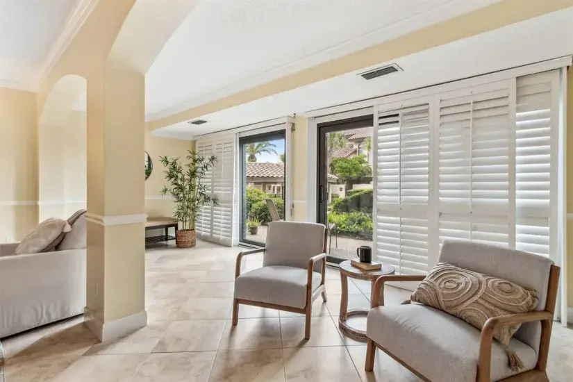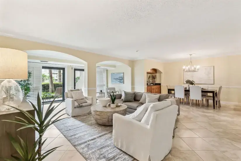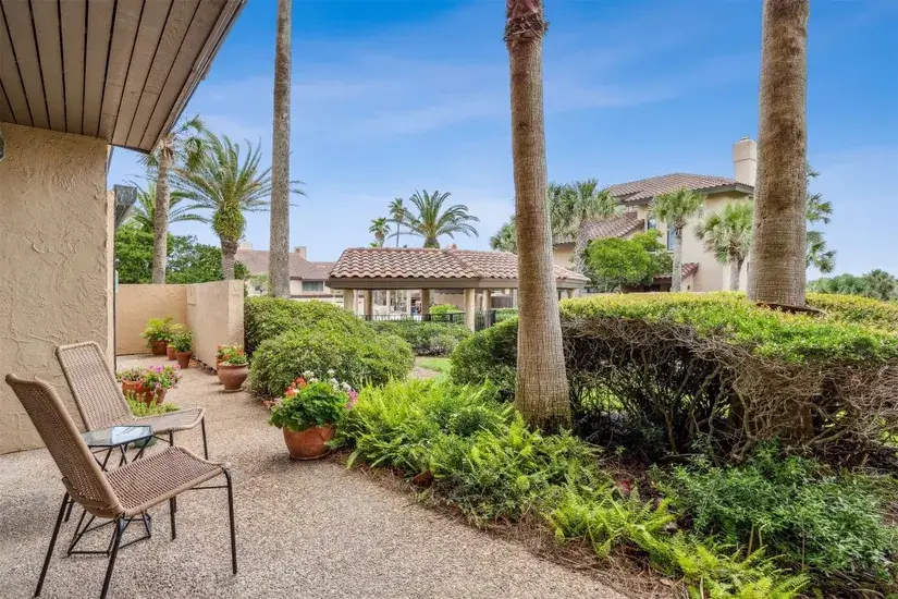 Rare opportunity in Windsong Villas, a premier oceanfront community located on the southeastern side of Amelia Island Plantation. This spacious 2-bedroom, 2.5-bath, 1960 sq. ft. ground-floor villa is ideally situated near the heated community pool and only steps to pristine beach and sparkling Atlantic Ocean. This beautiful end unit with ample windows and abundant natural light, features a peek-a-boo ocean view from the expansive patio. The interior blends Mediterranean Charm and Coastal Elegance with graceful archways ways, crown molding, and an open-concept layout. The custom kitchen with stainless appliances and tiled backsplash flows into the open dining area with a large wet bar, making it ideal for entertaining. The large inviting living area extends seamlessly to the patio, creating a serene indoor-outdoor retreat. The large primary suite with direct patio access has a bonus sitting area that can be used as an office or reconfigured for a third bedroom. The one-car open garage with a private storage closet for your convenience. Weekly rentals allowed. Schedule your showing today!