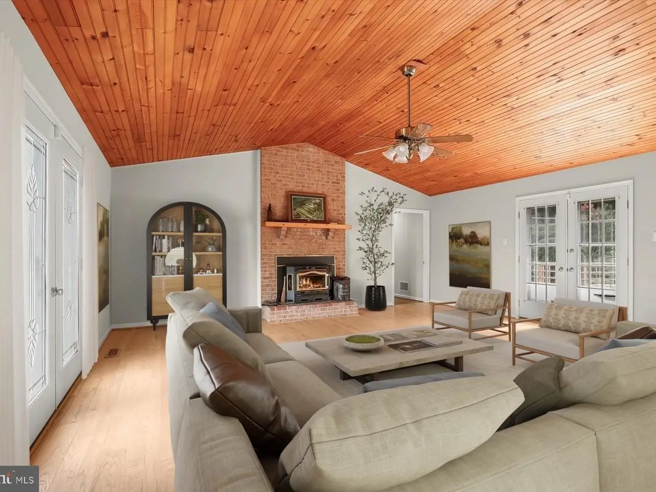 Spacious great room with vaulted wood ceilings