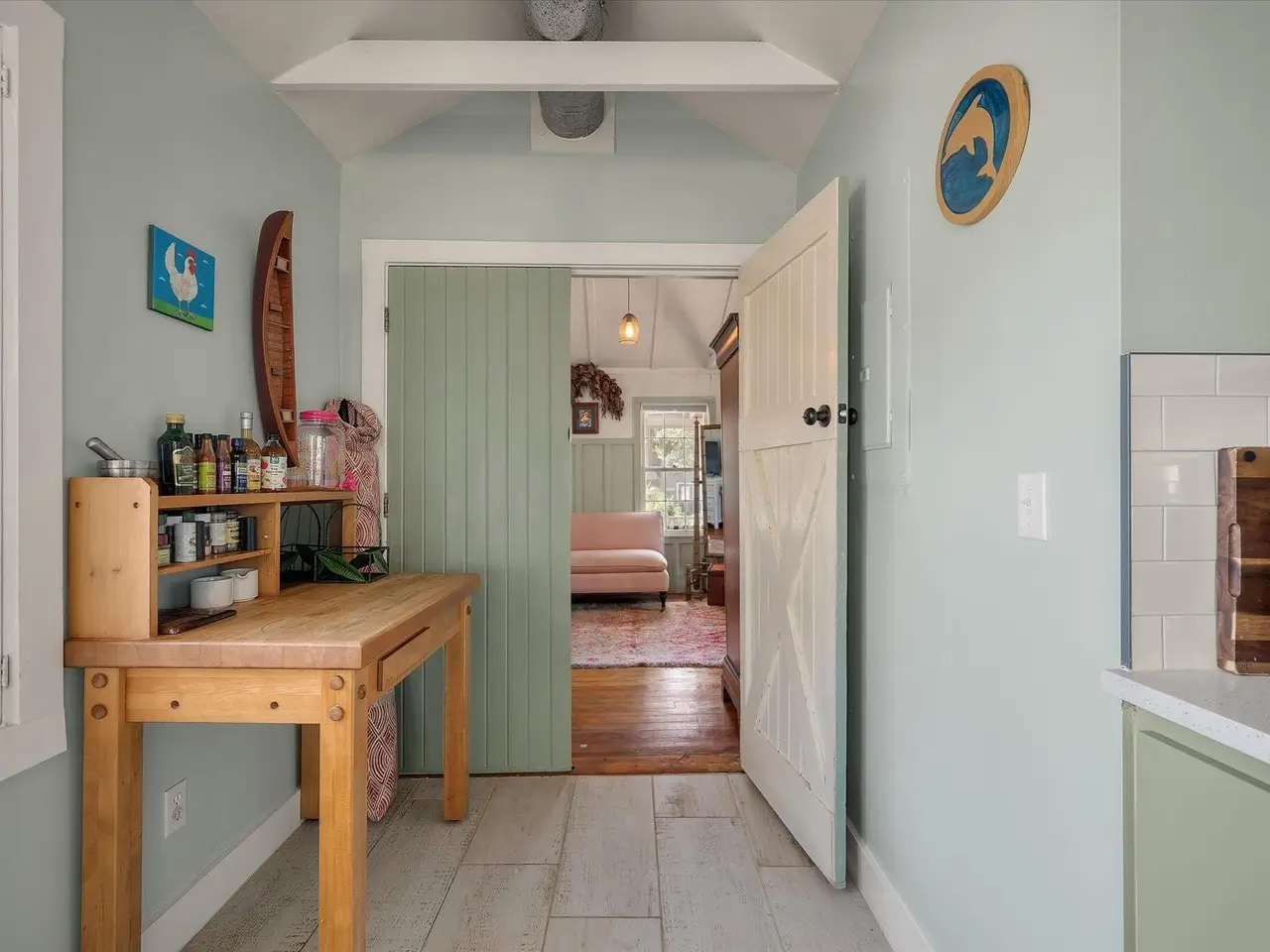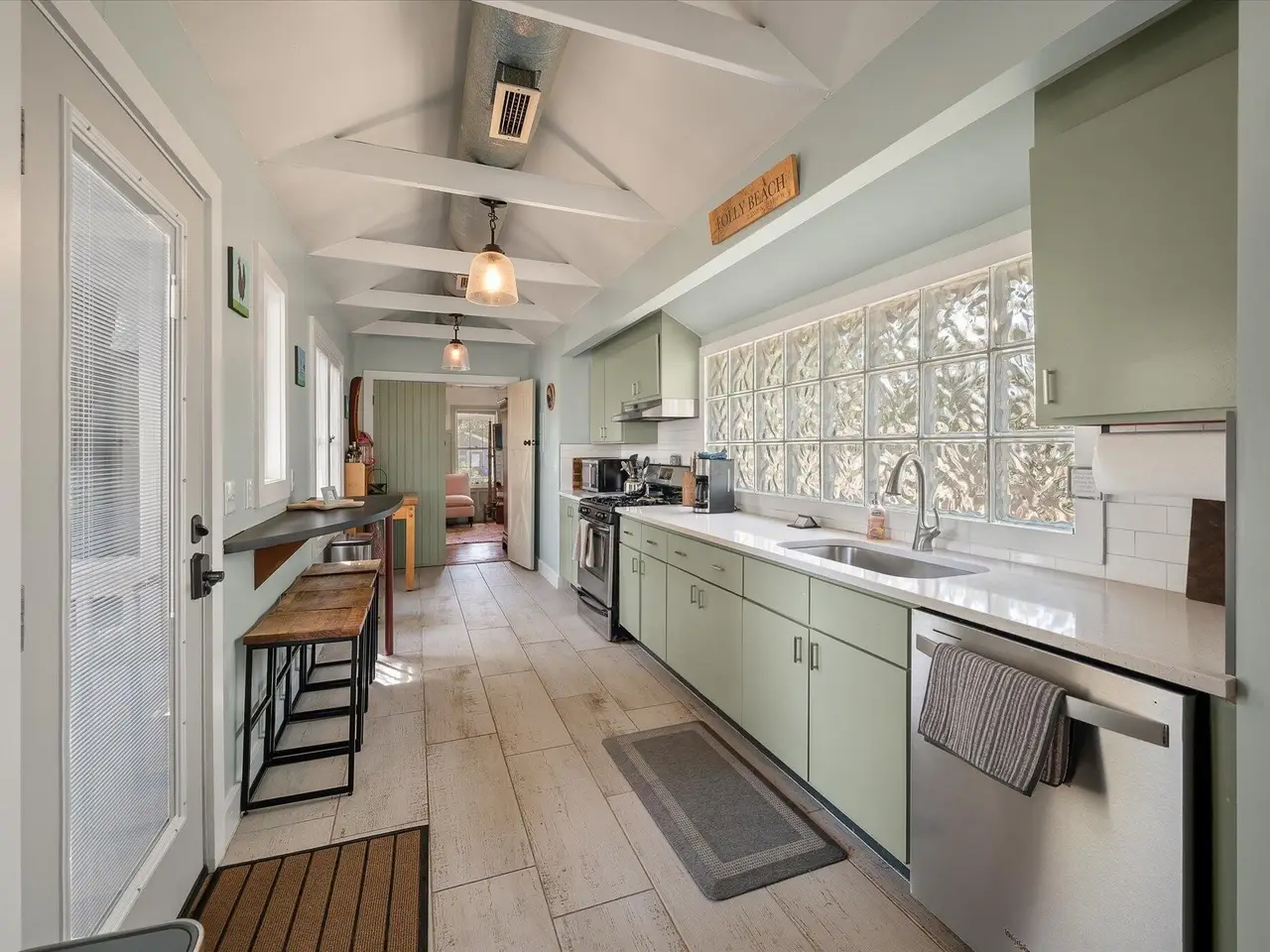 - Stainless steel appliances and mint green cabinets