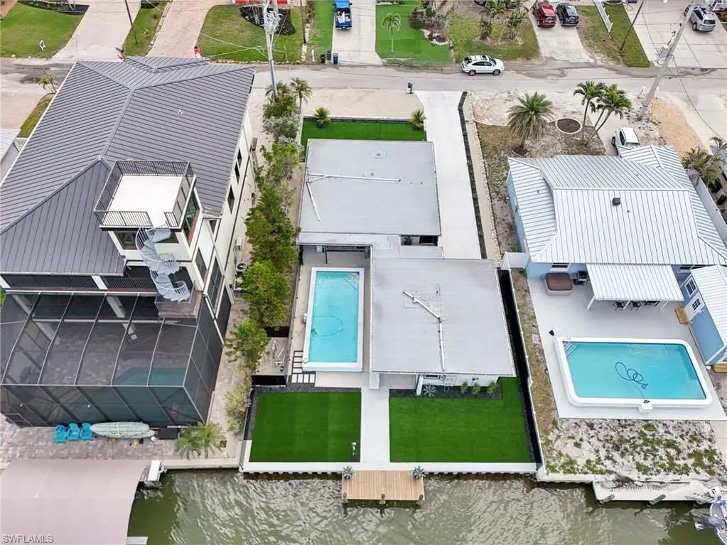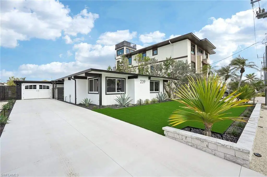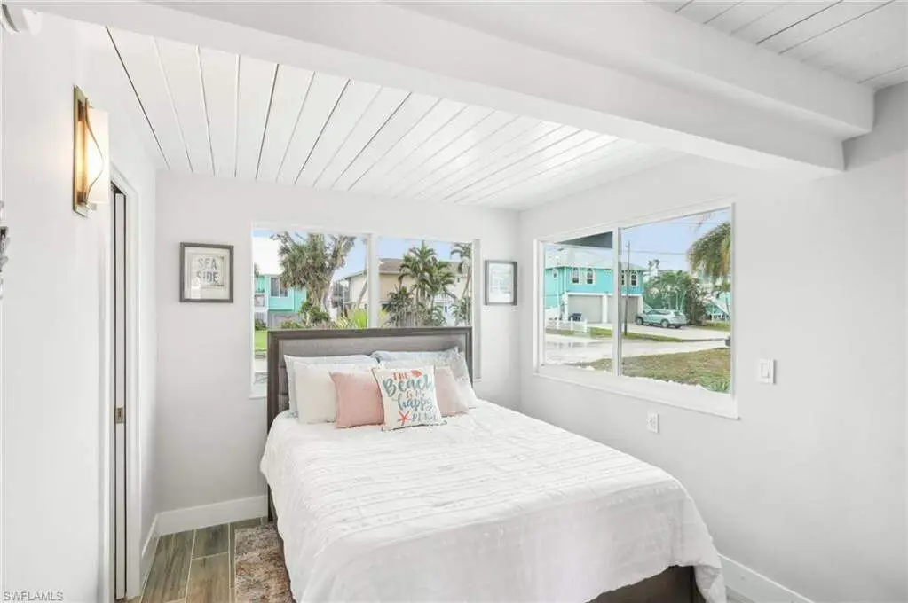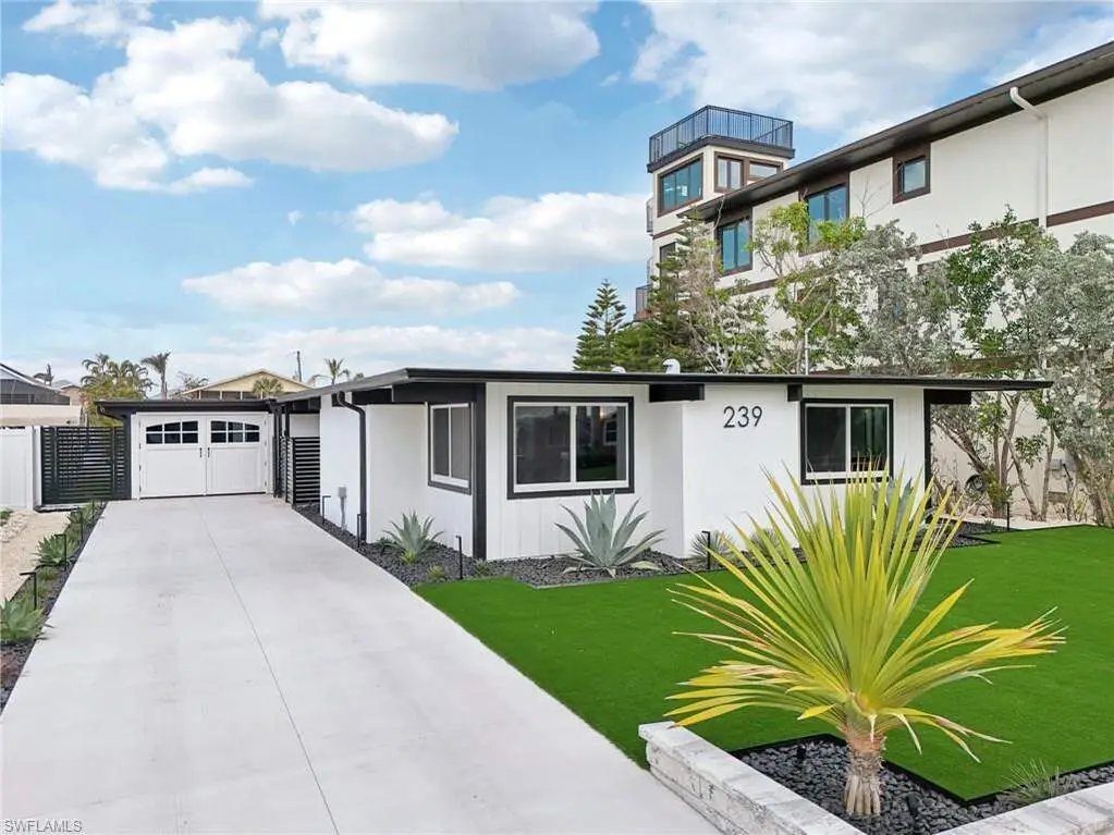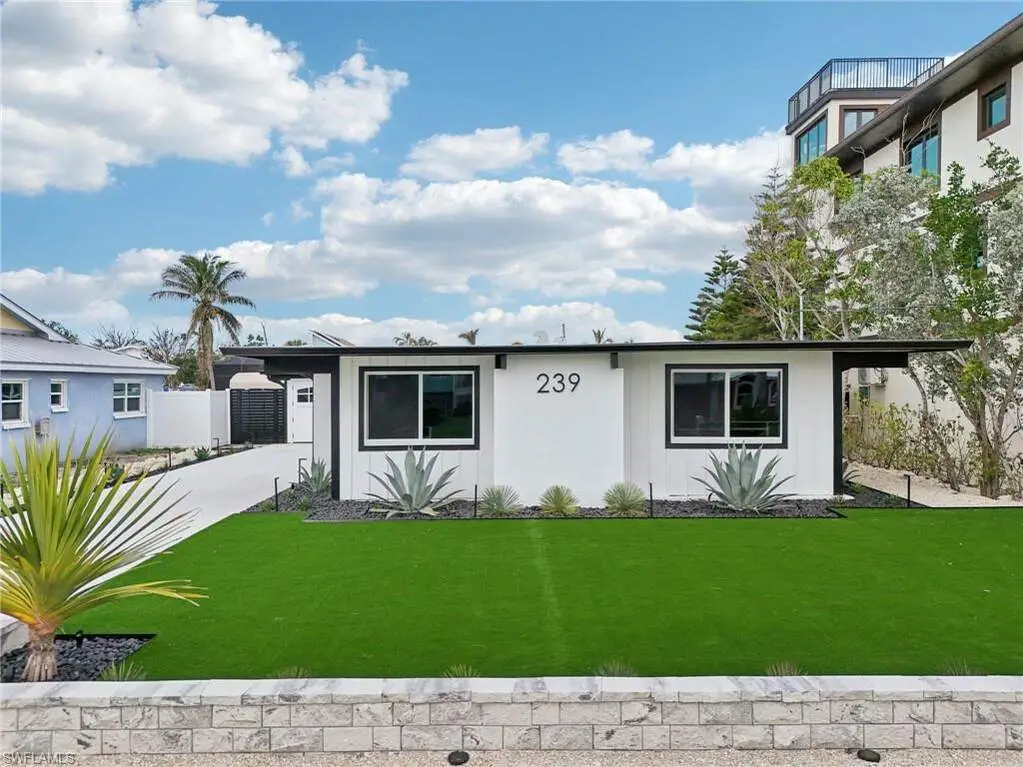 Modern elegance best describes this newly remodeled direct gulf access pool home with detached bonus guest house on Fort Myers Beach. With a total of four bedrooms and three full bathrooms, there is plenty of room for your extended family. The main home features custom cabinetry and tile work throughout the entire residence. The kitchen features not only stunning quartz counters, but a quartz wall, designer Bosch appliances, and ample size breakfast bar. While you relax in the living area, you can open your panoramic sliding doors to enjoy the breezes off the water. As you step into your detached one-bedroom guest home, you can enjoy the same level of workmanship and detail, inclusive of custom cabinetry, tile work, and modern finishings. In addition to a one and a half car garage, custom aluminum fencing and additional parking, the exterior has been meticulously zero scaped with fresh stone and a beautiful synthetic lawn for ease of maintenance and a sleek appearance. As you relax by your pool, you can enjoy Bay views and watch the Dolphin and the Manatee as they play right in your backyard complete with a brand-new seawall and dock. Why wait for new construction when everything here was fully permitted, inclusive of plumbing, electrical, impact doors and windows, roof, and so much more. Jump on your boat right in your backyard or take a short stroll to the white sands to explore all that southwest Florida has to offer!