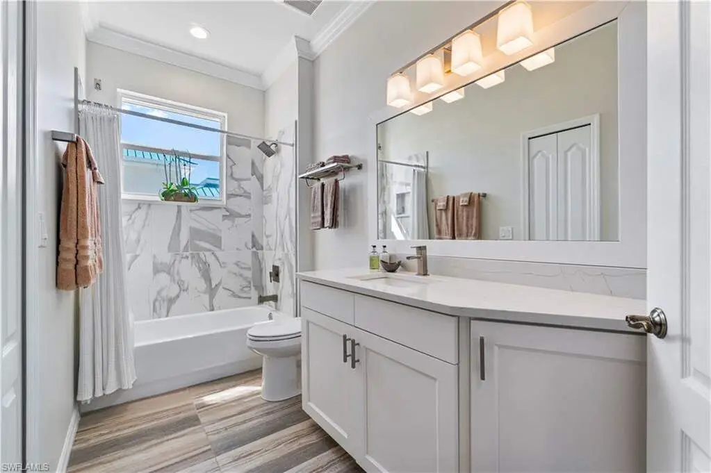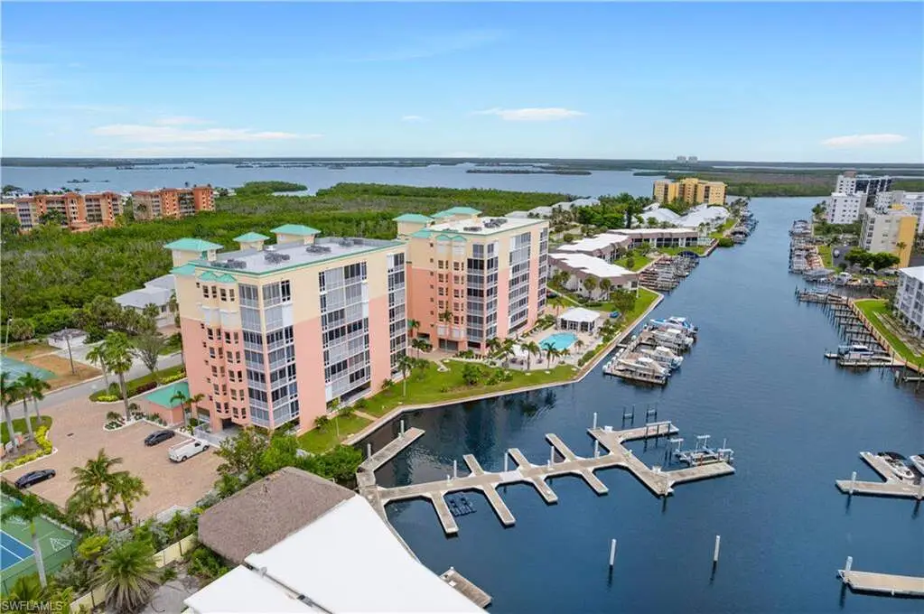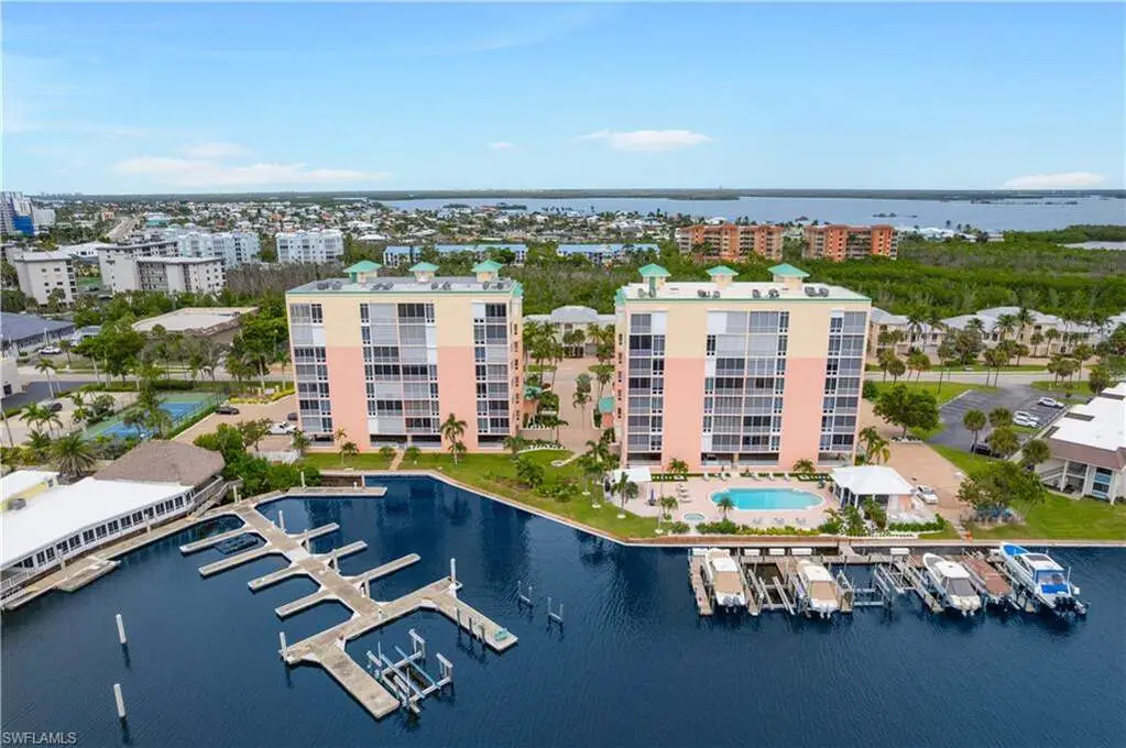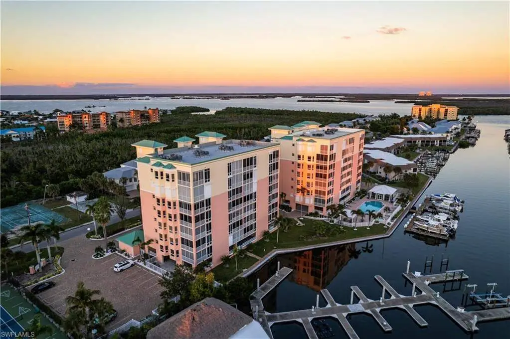 Beautifully renovated PENTHOUSE END-UNIT with spectacular BAY and GULF views nestled on the peaceful South End of Estero Island! INCLUDES A RARE PRIVATE 1-CAR GARAGE! RARE OPPORTUNITY TO PURCHASE A BOAT DOCK WITH A 27,000 LB LIFT SEPARATELY! Perfectly situated less than half a mile from Fishtale Marina, where you can store your boat with ease, and the Freedom Boat Club, offering no-maintenance boat rental memberships, this location caters to all your maritime desires. This condo is truly a beach and boater's haven, providing unmatched access to the vibrant boating lifestyle and is just steps from the pristine sugar sands of Fort Myers Beach. This 3 bed/2 bath coastal contemporary retreat is finely appointed with an open floor plan, hurricane impact windows/sliders, electric hurricane shutters, hardwood and tile flooring throughout, light and bright interior with gorgeous natural lighting, and high ceilings exclusive to penthouse units. Step out onto the spacious lanai-the perfect place to unwind as boats glide by on the bay or as you take in the breathtaking sunset views over the Gulf. The beautifully updated kitchen features quartz countertops, white cabinetry, breakfast bar seating, an eat-in area, and spectacular water views. The well-designed split floor plan offers privacy and convenience, with guest bedrooms and bath situated at the front, while the serene primary suite is positioned on the waterfront side. The primary suite boasts direct lanai access, bay and gulf views, and a spa-like bathroom with dual vanities, a soaking tub, and spacious dual shower. Additional highlights include an on-demand water heater and motorized shades in the kitchen, dining, and primary bedroom. Palm Harbor Club allows for weekly rentals, creating a fantastic opportunity for potential rental income! Residents can also enjoy resort-style amenities such as a large pool, spa, clubhouse, and tennis/pickleball courts.