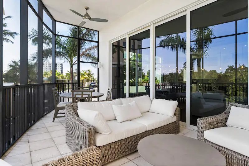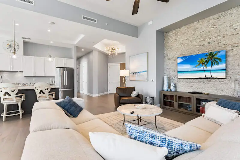 This is ONE-OF-A-KIND! This is the ONLY condo in the sought-after development of Grandview at Bay Beach with the wraparound lanai with 1,694 square feet of outdoor space! This lanai is so large it has its own zip code! The possibilities are endless with this space!!! This rare three bedroom plus den, 3.5 bath is being sold TURNKEY! There are only 58 condos in this exclusive high rise on Ft. Myers Beach. Boasting 2923 square feet of living area totaling 4,617 square feet with all of your outdoor space! There is no other condo like this one! 12-foot soaring ceilings! So much natural light spills in from every window! Newly installed electric sunshades throughout and of course, hurricane impact windows and sliders for piece of mind! Your culinary kitchen is outfitted with Bosch appliances, full island with granite countertops, two toned cabinetry, soft close doors and drawers, 42-inch custom cabinetry. Your living area has a stacked stone feature wall and awe inspiring custom lighting. All bedrooms have en suite full baths. Your open concept is perfect for entertaining large groups or intimate gatherings. Your master wing has an en suite bath with auto cabinet underlighting, walk-in shower with floor to ceiling tile, extended dual vanities with quartz countertops. Private water closet. Your two additional enjoyably sized bedrooms have full access to your outdoor lanai. 2nd bedroom has shower/tub combination while your 3rd bedroom has a walk-in shower with seamless glass enclosure. You office/den/reading/relaxing room has access to the enormous lanai as well. Carpet in all bedrooms. There are two guest suites that owners can secure for additional family or friends if needed. No need to find a hotel room on the island! First class luxury accommodations flow seamlessly in these fine guest suites. Be a part of Grandview at Bay Beach, on the Southern tip of Estero Island next to Lover's Key. Many amenities that are included are a community pool, hot tub, two BBQ grills, two firepits, yoga room, TRX, full athletic facility, Pickle Ball, Tennis, Bocce Ball, Deeded beach access, beach parking. There are future plans for a putting green in the park. There is a 60-foot boat slip in Waterside for a separate purchase. MLS #224034904. Walking distance to Santini Plaza and a quick drive off the south bridge to Lovers Key State Park, RSW international airport and Bonita/Naples for the best in shopping and dining that southwest Florida has to offer. Amazing video to watch!