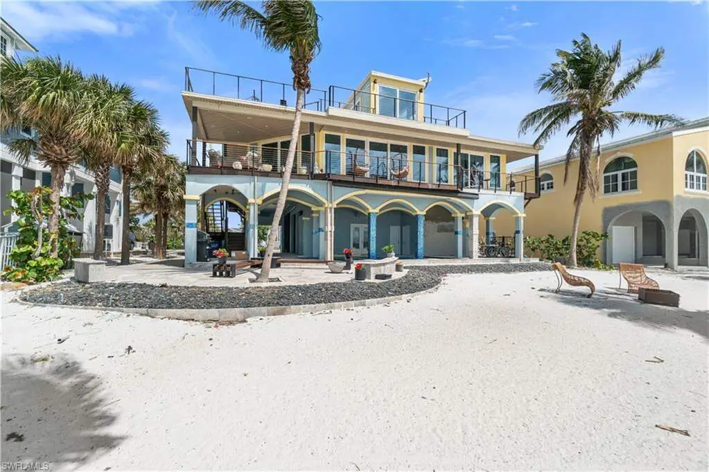 Beautifully renovated direct beachfront home on South Estero Island with breathtaking Gulf views! Sits on a rare stretch of beach with an ultra-private backyard with no passersby to be seen, providing optimal privacy. This 4 bed/4.5 coastal delight has been completely remodeled and features a NEW METAL ROOF, Generac whole house generator (2021), 2 new HVACS (2020), new instant water heater (2020), hurricane impact windows/sliders throughout, and new interior staircase. Step outside onto your open-air wraparound balcony and enjoy endless views of the turquoise waters of the Gulf of Mexico. Stunning chef's kitchen contributes to the wide-open floor plan and offers custom-built white cabinetry, gorgeous white quartz countertops, waterfall island, walk-in pantry, and new high-end Jenn-Air appliances (2020) including double ovens and induction cooktop. The spacious primary bedroom is a tranquil haven with floor to ceiling windows/slider to fully indulge in the Gulf views and has a spa-like bath with dual vanities, large jetted soaking tub, and separate walk-in shower with multiple shower heads. The top floor is perfect for a private guest wing or an extra bonus room with an ensuite bathroom and top floor sun deck for picture-perfect sunsets over the Gulf. Just steps from the beach, your outdoor oasis awaits - featuring a fenced-in heated saltwater pool and spa, along with a brand-new summer kitchen ideal for poolside dining and sunset entertaining. Other features include a Lutron lighting system, Savant sound system upstairs, tile flooring, and coffered ceiling details. This is a fantastic vacation home or investment opportunity located in a weekly rental zone allowing for maximum rental income if desired! Perfectly situated on the coveted South-end of Estero Island near Lovers Key, Bonita Beach & the South bridge to the mainland with dining and shopping walking distance.