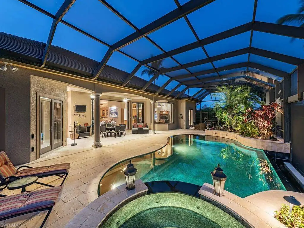 Pool with sun deck and spa overlooking Shadow Wood Preserve