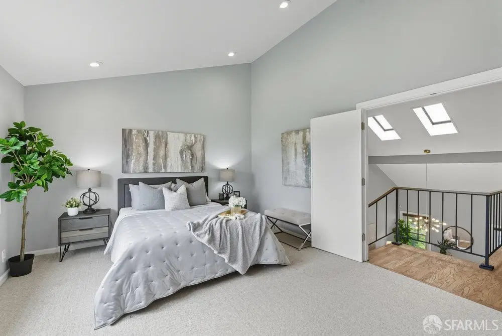 Tastefully remodeled, this residence blends modern upgrades with everyday comfort. Offering 3 bedrooms, 2.5 bathrooms, and a private side-by-side 2-car garage, it sits within one of Foster City's most desirable communities. The bright living room features dramatic double-height ceilings, skylights, and windows overlooking the serene greenbelt. A versatile main-level bedroom doubles as a home office or guest room. Luxury wood flooring flows through the open layout to a private landscaped patio with pergolaideal for morning coffee, entertaining, or evening relaxationwith direct access to the garage for added convenience. The remodeled chef's kitchen boasts marble-style quartz counters, sleek cabinetry, and new stainless-steel appliances, complemented by a spacious dining area. A half bath and side-by-side washer/dryer complete the main level. Upstairs, the primary suite and guest room are enhanced by upgraded bathrooms, plush carpeting, and custom closet shelving. Tucked at the quiet end of the community near the pool and guest parking, this home offers exceptional privacy and easy access to scenic trails, open greenbelts, community parks, and Highways 101 & 92, perfectly nestled between SF & Silicon Valley tech hubs.