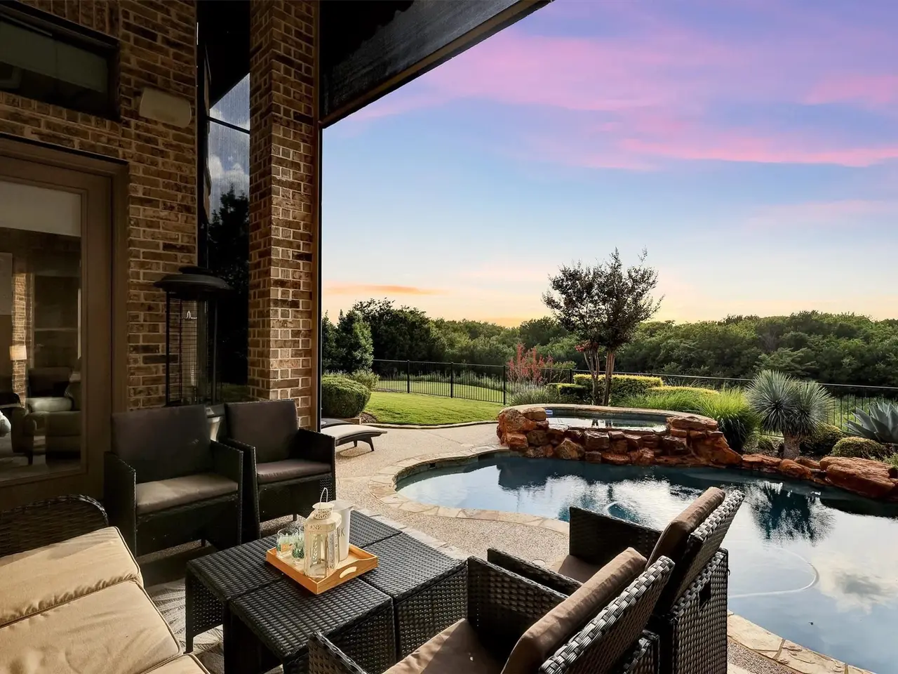 Welcome to luxury living in the prestigious 5-star neighborhood of The Trails of West Frisco! This stunning 5BR, 4BA masterpiece is perfectly situated on a premier golf course lot, offering breathtaking sunset views that will leave you in awe. Spanning over 5000 square feet, this meticulously designed home boasts an open-concept layout. The gourmet chefs kitchen features top-of-the-line stainless steel appliances, a spacious island, and custom cabinetry, seamlessly flowing into the expansive living area with a cozy fireplace. The primary suite is a true retreat, complete with a spa-inspired ensuite, dual vanities, and a walk-in closet. Each additional bedroom is generously sized, with ample natural light and access to beautifully appointed bathrooms. The home has automatic roller shades throughout, a large game room with a bar and sink, and a theater for those stay-at-home movie nights! Step outside to your private oasis, where a sparkling pool awaits, perfect for entertaining or relaxing while overlooking the lush fairways of the championship golf course. With a retractable awning, weather will not prevent the good times by the pool! The meticulously landscaped backyard offers ample space for outdoor dining and soaking in those unforgettable sunsets. Home features 2 newer hot water heaters and HVAC systems. The roof is less than 3 years old. Three-car garage with high-end, insulated garage doors and epoxy flooring. Located in a coveted community with sidewalks and beautiful trails, top-rated schools, and proximity to fine dining and shopping, this home is the epitome of elegance and comfort. Don't miss the opportunity to own this extraordinary property in one of the most sought-after neighborhoods!