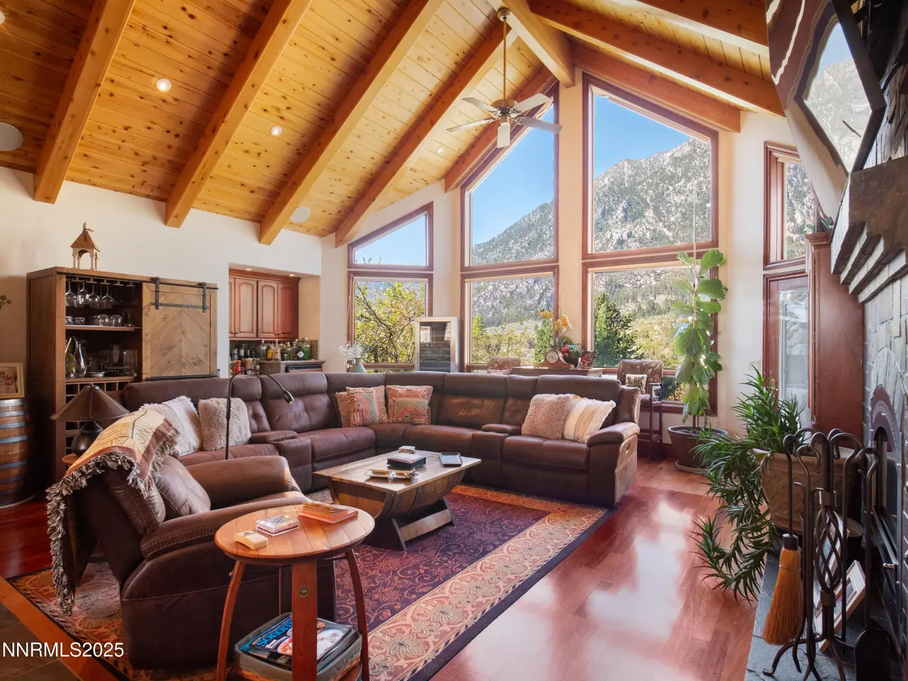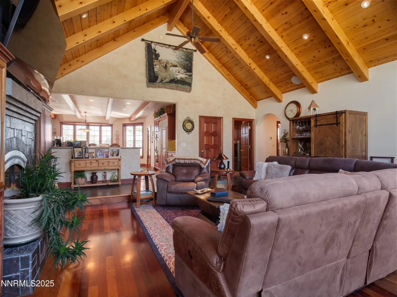 Cedar tongue-and-groove cathedral ceilings with exposed beams