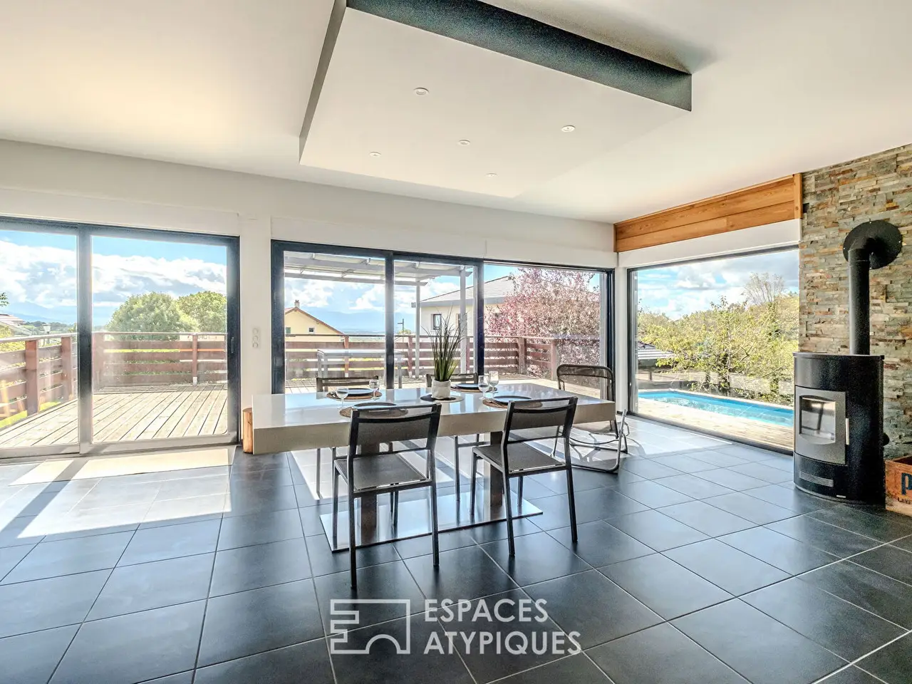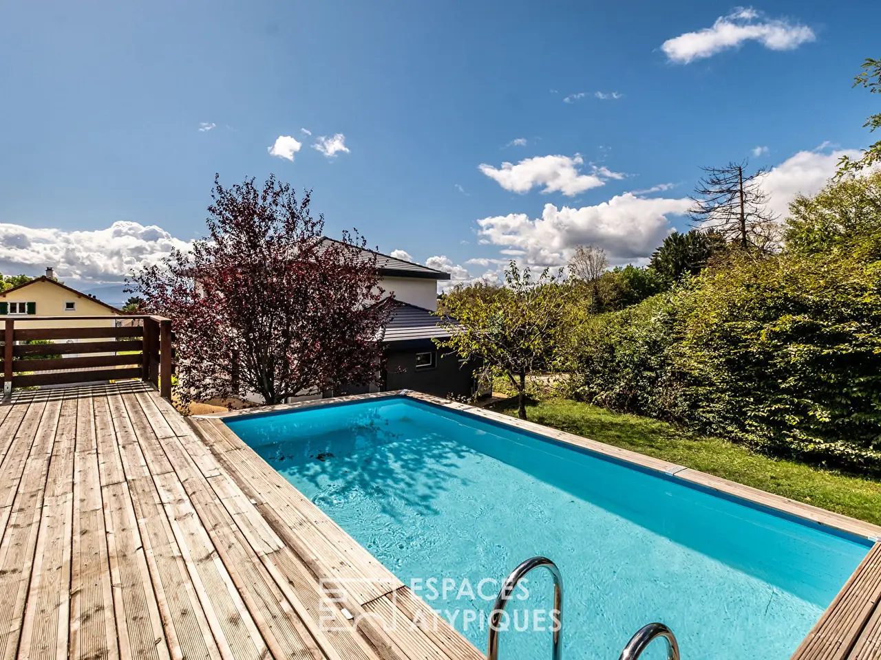 Magnificent contemporary villa of 212 sqm, ideally located a few steps from the center of Gex, in a peaceful and green setting, in the heart of a sought-after residential area.Upon entering, you will be seduced by a vast living room of 80 sqm, bathed in natural light thanks to large bay windows, offering a feeling of volume and openness to the outside.This bright living space consists of a modern kitchen, open to a convivial living room with dining room and lounge, equipped with a pellet stove for a warm atmosphere. From this living room, you directly access a generous terrace, ideal for your outdoor meals, with a breathtaking view of the majestic Alps.A second living room, with a cozy atmosphere thanks to its fireplace, invites you to relax and serenity. The ground floor also houses two bedrooms, one with a private shower room, the other with a whirlpool bathtub for moments of absolute relaxation. A laundry/boiler room completes this floor.Upstairs, a true haven of peace awaits you: a dressing room, a modern shower room, and a large air-conditioned master bedroom, offering the possibility of being modulated into two separate spaces. This master suite opens onto a panoramic 70 sqm terrace, providing an idyllic setting to enjoy the breathtaking view of the Alps.The basement, meanwhile, houses a cellar, a workshop, and a games room, thus offering multiple layout possibilities. Outside, you will appreciate a double carport as well as two rooms dedicated to bicycles and motorcycles. In the summer season, the above-ground swimming pool will complete this picture of life, for moments of relaxation with family or friends.This villa, combining elegance, modernity, and comfort, is a rare and privileged place to live. Its location, a few minutes from the Swiss border, will allow you to benefit from an exceptional living environment, while being close to all amenities.Estimated average annual energy costs for standard use, based on 2022 energy prices: between 2,113 Euros and 2,993 Euros.Information on the risks to which this property is exposed is available on the Georisques website for the areas concerned: www.georisques.gouv.fr.REF. 1947EAAdditional information* 4 rooms* 3 bedrooms* 1 bathroom* 2 shower rooms* Outdoor space : 1518 SQM* Parking : 3 parking spaces* Property tax : 1 600 €* Provision for charges : 4 100 €Energy Performance CertificatePrimary energy consumptionc : 148 kWh/m2.yearHigh performance housing*A*B*148kWh/m2.year29*kg CO2/m2.yearC*D*E*F*GExtremely poor housing performance* Of which greenhouse gas emissionsc : 29 kg CO2/m2.yearLow CO2 emissions*A*B*29kg CO2/m2.yearC*D*E*F*GVery high CO2 emissionsAgency feesThe fees include VAT and are payable by the vendorMediatorMediation Franchise-Consommateurswww.mediation-franchise.com29 Boulevard de Courcelles 75008 ParisInformation on the risks to which this property is exposed is available on the Geohazards website : www.georisques.gouv.fr