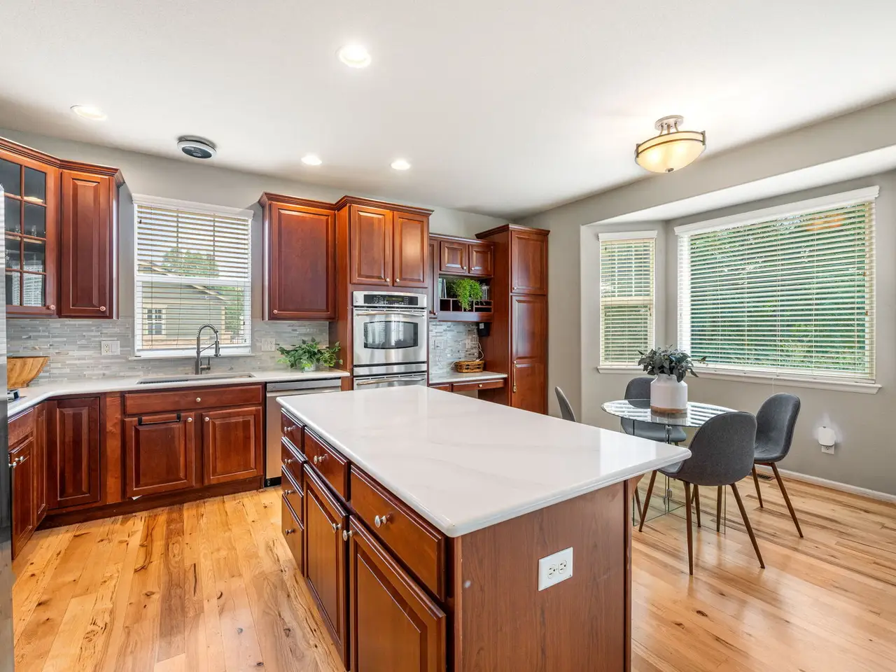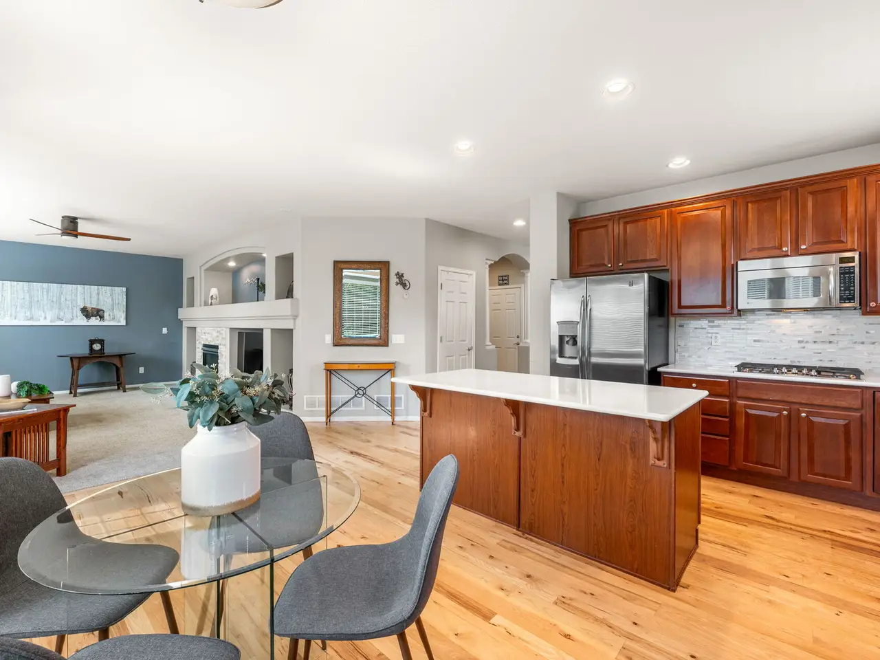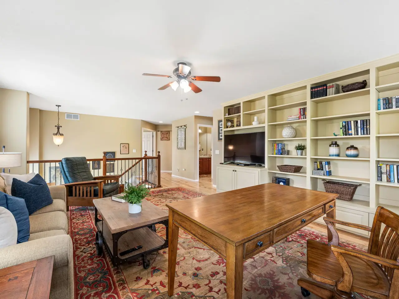 Fabulous corner-lot home in highly desirable Ryan Ranch, with stunning views of Table Mountain and the Rockies! Step inside to an open, light-filled floor plan featuring a gourmet kitchen with granite countertops, a large center island with seating, stainless steel appliances, and rich cherry wood cabinets. Hardwood floors flow throughout the main level, connecting the spacious family room, formal living and dining rooms, and a private main-floor study. Enjoy year-round outdoor living on the expansive mahogany deck with a covered pergola and powered shade awning. The private backyard is fully fenced, beautifully landscaped with mature plantings, and perfect for pets. A 3-car garage includes newer polyurea flooring plus upgraded storage. Upstairs, you'll find a large great room with hardwood floors, custom floor-to-ceiling bookshelves, generous bedrooms, and soaring ceilings. The professionally finished garden-level basement offers incredible flexibility with a convenience bar, recreation room with pool table, fitness area, large bedroom, full bath, and a spacious storage room. This home offers endless gathering spaces-including a family room, great room, loft, and entertainment areas-making it perfect for both everyday living and hosting. Recent upgrades include outdoor lighting, kitchen counters and cooktop, new mahogany deck, pergola, powered awning, new windows in kitchen and dens, ceiling fan and whole house fan, Generac whole-house generator, new carpet, and more. Ideally located on the Golden/Arvada border, this home is just steps from two recreation centers, shopping, and offers easy access to both downtown Denver and the mountains. With no neighbors on three sides, privacy abounds. The HOA covers common area maintenance, trash, fencing, and snow removal for truly low-maintenance living. This one-of-a-kind home is ready to impress-schedule your showing today!