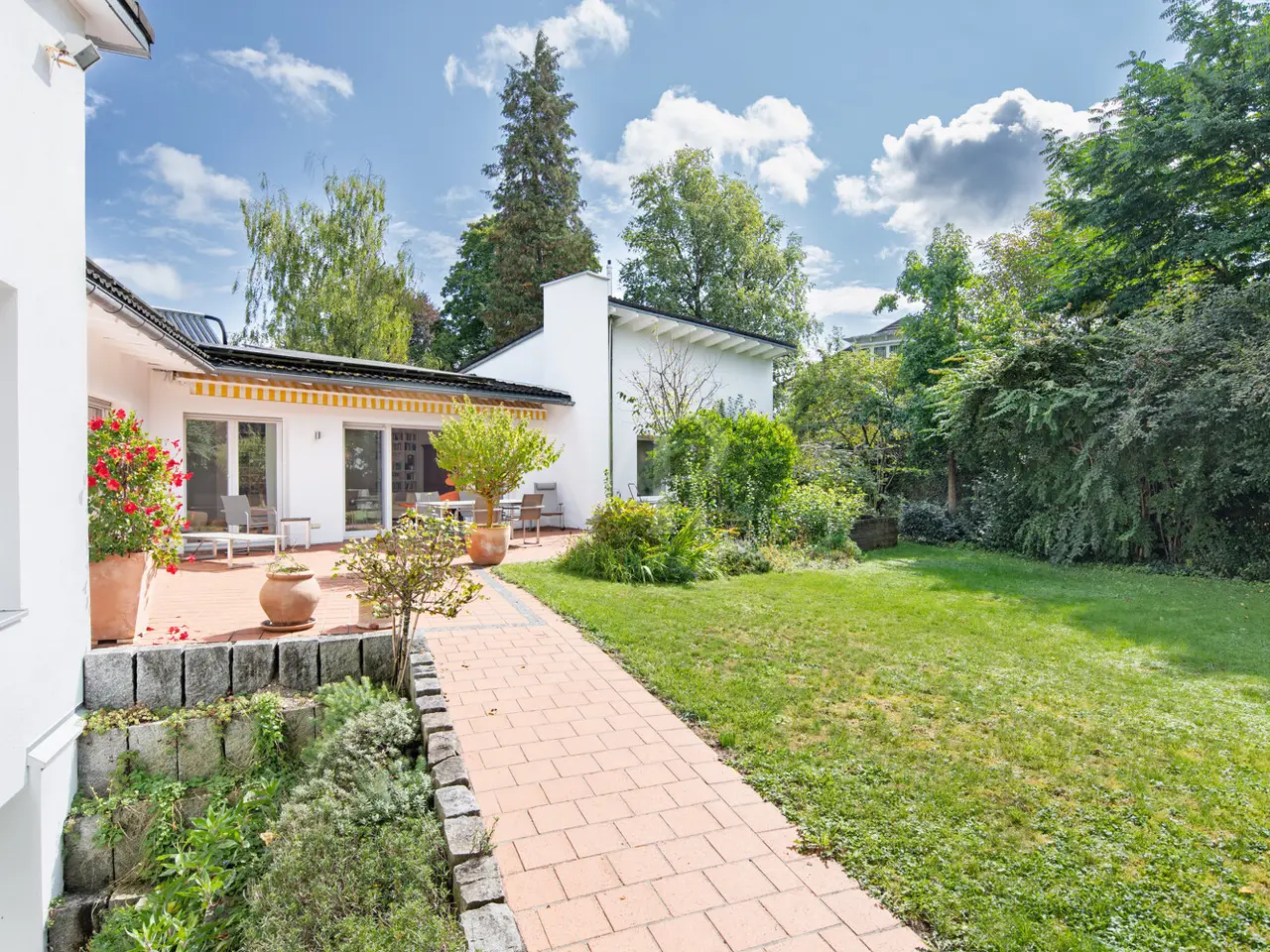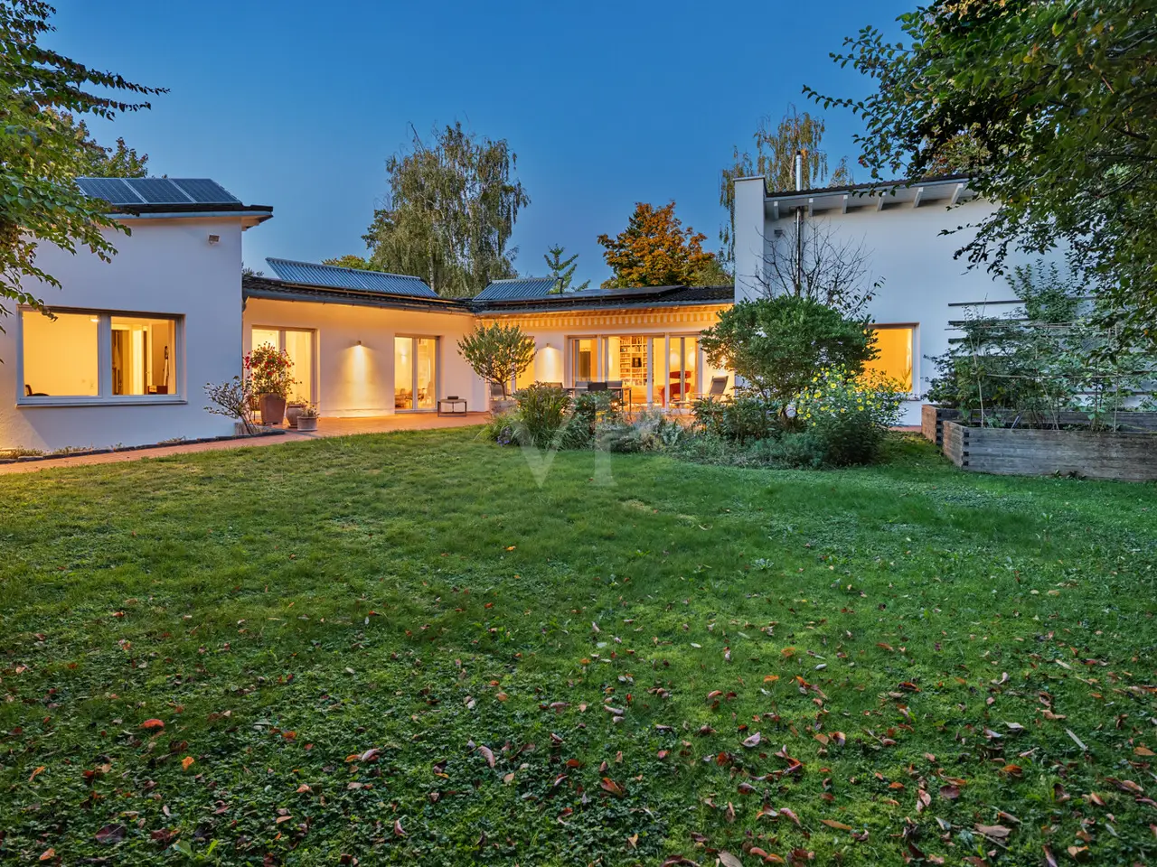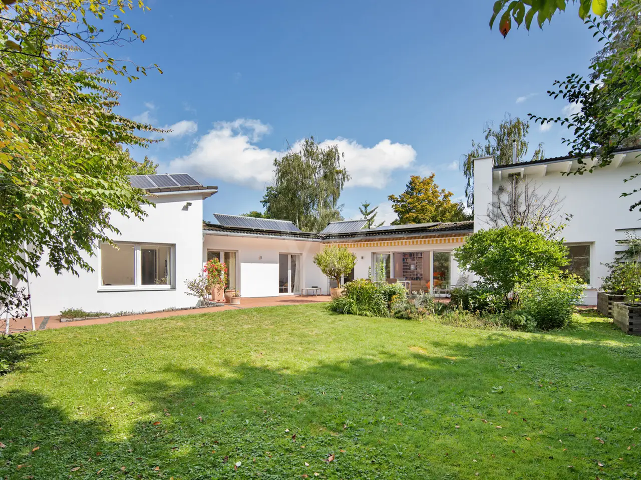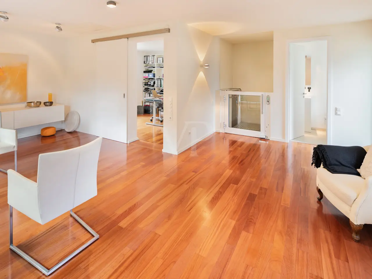 Living spaces with character: As soon as you enter, you are greeted by a spacious entrance area that makes the open and well thought-out architecture of the house tangible. The private retreats with bedrooms open up to the right, while the kitchen and the spacious living and dining area are to the left. High-quality Doussie parquet flooring, atmospheric Occhio lighting systems and pleasant underfloor heating lend the entire area a warm and inviting atmosphere. The heart of the house is the light-flooded living and dining area with floor-to-ceiling windows, a large sliding door and a stylish fireplace - a room that becomes the focal point of family life. The sunny south and west orientation ensures a bright, friendly ambience throughout the day. The adjoining kitchen, equipped with appliances from Gaggenau and Miele, combines design and functionality and becomes a meeting place for cooking and enjoying meals together. Garden idyll & outdoor areas: A large south-west-facing terrace, the lovingly landscaped garden and a covered outdoor seating area connecting the garage and house make the outdoor area a private retreat. Here you can enjoy summer evenings, relax and spend sociable hours with family and friends. Barrier-free living without compromise: This bungalow is designed to be fully wheelchair accessible - from access via a ramp to each floor. Electric sliding doors, lowered light switches, generous movement areas and wheelchair-accessible fixtures ensure a comfortable, barrier-free living experience without losing the charm of a classic home. The master bathroom impresses with a wheelchair-accessible designer washbasin, a floor-level shower with integrated bench and towel radiators that also serve as sturdy grab rails. The kitchen was also designed to be wheelchair-accessible so that all work areas are easily accessible. A platform lift connects the ground floor and basement and is designed for large electric wheelchairs - meaning that the home cinema, guest room and bathroom in the basement are also completely barrier-free. Wheelchair-accessible ramps at the entrance to the house and practice, an electric door opener, electrically controlled screens in the bathrooms and an electric garage door control system round off this comfort concept. Pioneering energy efficiency: This house is also technically impressive: a gas condensing boiler from Paradigma together with a 1,000 l solar storage tank and three solar thermal modules provide hot water and backup heating. Two photovoltaic systems - one with 4.8 kWp for full feed-in and a single-phase self-consumption system (4.9 kWp) with a total of 6 kWh of energy storage, including 3 kWh as emergency power storage - ensure maximum energy efficiency and self-sufficiency. Underfloor heating and radiators ensure a pleasant indoor climate. Water pipes and all installations were renewed in 2002, the practice toilet and two other bathrooms were modernized in 2015/2016. The electrics were completely replaced in 2002 and optimized in 2015. The windows, walls and roof have modern full thermal insulation and guarantee low operating costs. Separate living and working area: This separate area is perfect as an office, practice or studio - or as an exclusive guest area. A separate, prestigious entrance with large windows lets in plenty of light and gives this area an open, inviting atmosphere. An elegant guest WC and the elevator, which connects both floors of the house barrier-free, are located here. The adjoining study opens up to the living area with electric sliding doors, creating a seamless transition between working and living.