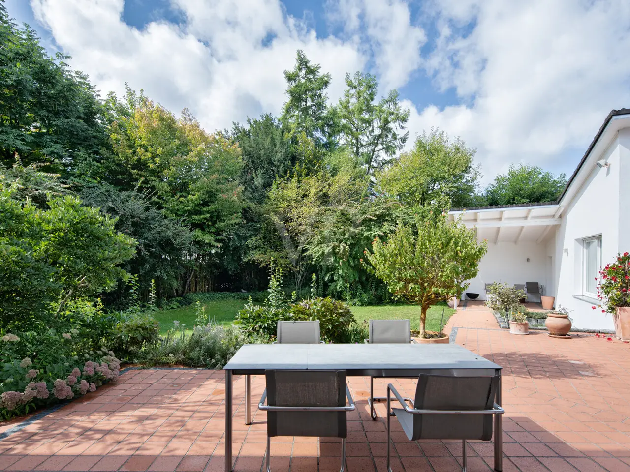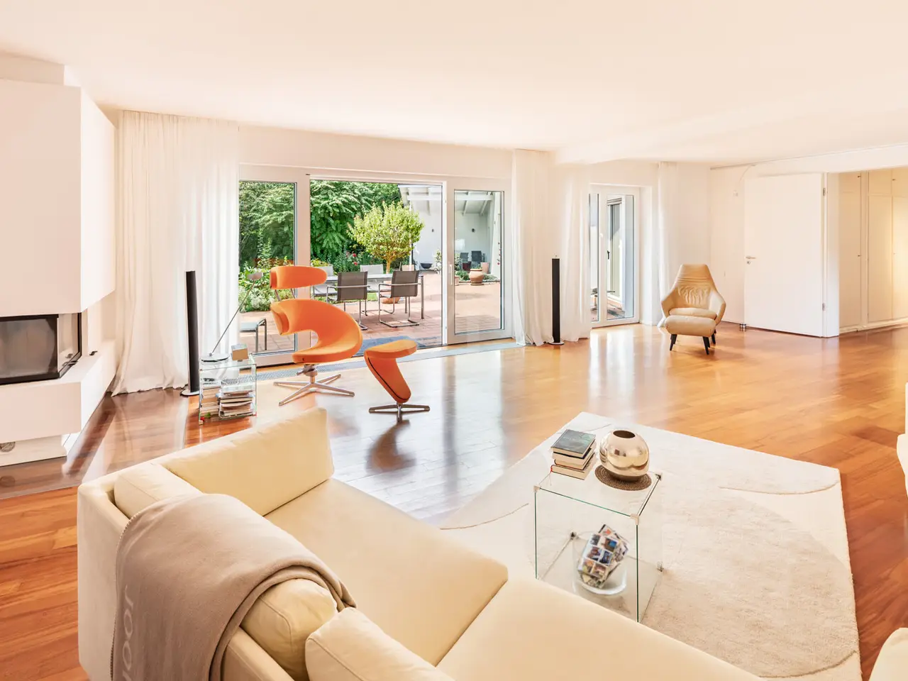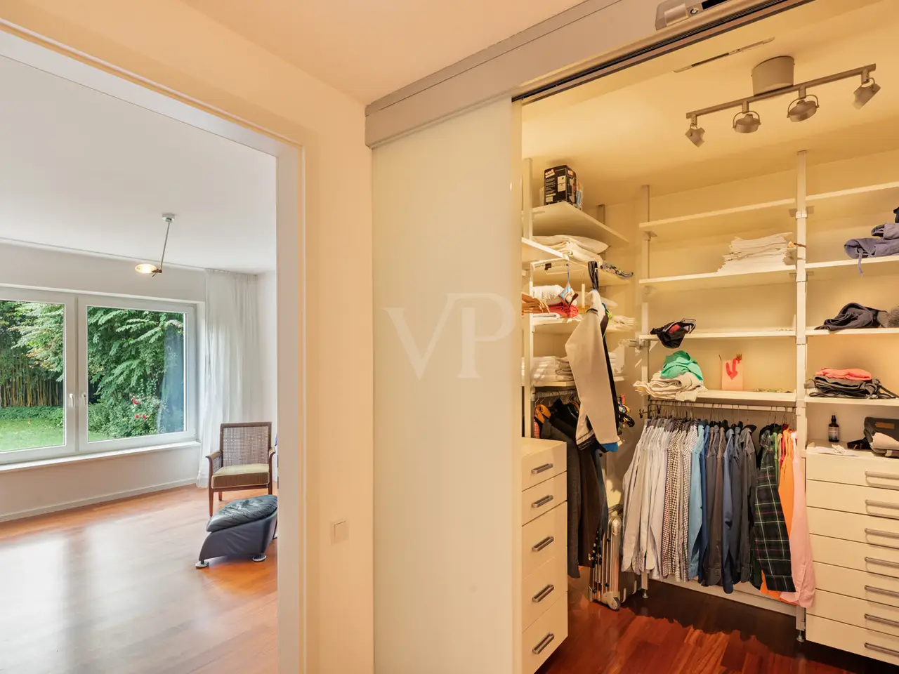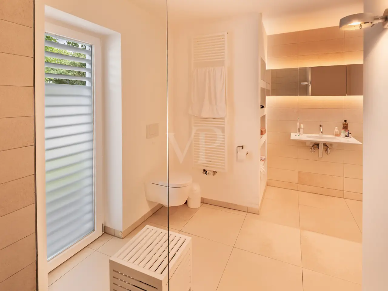 Living spaces with character: As soon as you enter, you are greeted by a spacious entrance area that makes the open and well thought-out architecture of the house tangible. The private retreats with bedrooms open up to the right, while the kitchen and the spacious living and dining area are to the left. High-quality Doussie parquet flooring, atmospheric Occhio lighting systems and pleasant underfloor heating lend the entire area a warm and inviting atmosphere. The heart of the house is the light-flooded living and dining area with floor-to-ceiling windows, a large sliding door and a stylish fireplace - a room that becomes the focal point of family life. The sunny south and west orientation ensures a bright, friendly ambience throughout the day. The adjoining kitchen, equipped with appliances from Gaggenau and Miele, combines design and functionality and becomes a meeting place for cooking and enjoying meals together. Garden idyll & outdoor areas: A large south-west-facing terrace, the lovingly landscaped garden and a covered outdoor seating area connecting the garage and house make the outdoor area a private retreat. Here you can enjoy summer evenings, relax and spend sociable hours with family and friends. Barrier-free living without compromise: This bungalow is designed to be fully wheelchair accessible - from access via a ramp to each floor. Electric sliding doors, lowered light switches, generous movement areas and wheelchair-accessible fixtures ensure a comfortable, barrier-free living experience without losing the charm of a classic home. The master bathroom impresses with a wheelchair-accessible designer washbasin, a floor-level shower with integrated bench and towel radiators that also serve as sturdy grab rails. The kitchen was also designed to be wheelchair-accessible so that all work areas are easily accessible. A platform lift connects the ground floor and basement and is designed for large electric wheelchairs - meaning that the home cinema, guest room and bathroom in the basement are also completely barrier-free. Wheelchair-accessible ramps at the entrance to the house and practice, an electric door opener, electrically controlled screens in the bathrooms and an electric garage door control system round off this comfort concept. Pioneering energy efficiency: This house is also technically impressive: a gas condensing boiler from Paradigma together with a 1,000 l solar storage tank and three solar thermal modules provide hot water and backup heating. Two photovoltaic systems - one with 4.8 kWp for full feed-in and a single-phase self-consumption system (4.9 kWp) with a total of 6 kWh of energy storage, including 3 kWh as emergency power storage - ensure maximum energy efficiency and self-sufficiency. Underfloor heating and radiators ensure a pleasant indoor climate. Water pipes and all installations were renewed in 2002, the practice toilet and two other bathrooms were modernized in 2015/2016. The electrics were completely replaced in 2002 and optimized in 2015. The windows, walls and roof have modern full thermal insulation and guarantee low operating costs. Separate living and working area: This separate area is perfect as an office, practice or studio - or as an exclusive guest area. A separate, prestigious entrance with large windows lets in plenty of light and gives this area an open, inviting atmosphere. An elegant guest WC and the elevator, which connects both floors of the house barrier-free, are located here. The adjoining study opens up to the living area with electric sliding doors, creating a seamless transition between working and living.