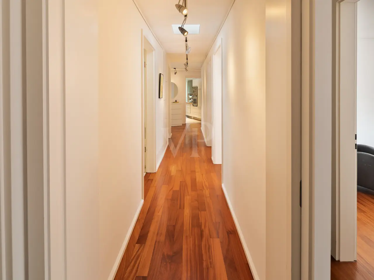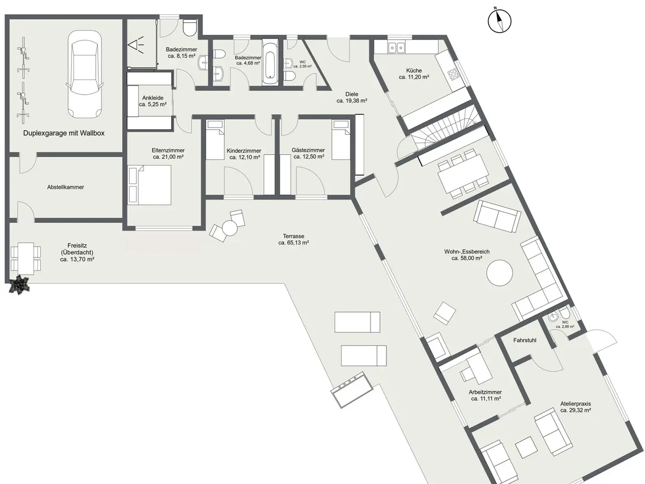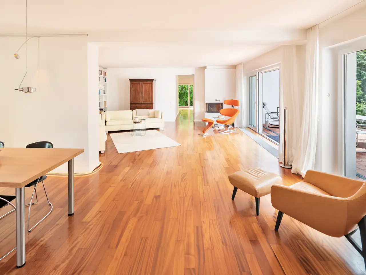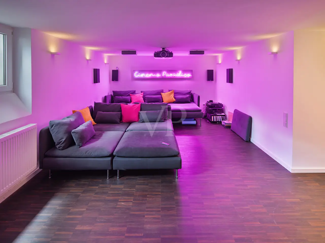 Living spaces with character: As soon as you enter, you are greeted by a spacious entrance area that makes the open and well thought-out architecture of the house tangible. The private retreats with bedrooms open up to the right, while the kitchen and the spacious living and dining area are to the left. High-quality Doussie parquet flooring, atmospheric Occhio lighting systems and pleasant underfloor heating lend the entire area a warm and inviting atmosphere. The heart of the house is the light-flooded living and dining area with floor-to-ceiling windows, a large sliding door and a stylish fireplace - a room that becomes the focal point of family life. The sunny south and west orientation ensures a bright, friendly ambience throughout the day. The adjoining kitchen, equipped with appliances from Gaggenau and Miele, combines design and functionality and becomes a meeting place for cooking and enjoying meals together. Garden idyll & outdoor areas: A large south-west-facing terrace, the lovingly landscaped garden and a covered outdoor seating area connecting the garage and house make the outdoor area a private retreat. Here you can enjoy summer evenings, relax and spend sociable hours with family and friends. Barrier-free living without compromise: This bungalow is designed to be fully wheelchair accessible - from access via a ramp to each floor. Electric sliding doors, lowered light switches, generous movement areas and wheelchair-accessible fixtures ensure a comfortable, barrier-free living experience without losing the charm of a classic home. The master bathroom impresses with a wheelchair-accessible designer washbasin, a floor-level shower with integrated bench and towel radiators that also serve as sturdy grab rails. The kitchen was also designed to be wheelchair-accessible so that all work areas are easily accessible. A platform lift connects the ground floor and basement and is designed for large electric wheelchairs - meaning that the home cinema, guest room and bathroom in the basement are also completely barrier-free. Wheelchair-accessible ramps at the entrance to the house and practice, an electric door opener, electrically controlled screens in the bathrooms and an electric garage door control system round off this comfort concept. Pioneering energy efficiency: This house is also technically impressive: a gas condensing boiler from Paradigma together with a 1,000 l solar storage tank and three solar thermal modules provide hot water and backup heating. Two photovoltaic systems - one with 4.8 kWp for full feed-in and a single-phase self-consumption system (4.9 kWp) with a total of 6 kWh of energy storage, including 3 kWh as emergency power storage - ensure maximum energy efficiency and self-sufficiency. Underfloor heating and radiators ensure a pleasant indoor climate. Water pipes and all installations were renewed in 2002, the practice toilet and two other bathrooms were modernized in 2015/2016. The electrics were completely replaced in 2002 and optimized in 2015. The windows, walls and roof have modern full thermal insulation and guarantee low operating costs. Separate living and working area: This separate area is perfect as an office, practice or studio - or as an exclusive guest area. A separate, prestigious entrance with large windows lets in plenty of light and gives this area an open, inviting atmosphere. An elegant guest WC and the elevator, which connects both floors of the house barrier-free, are located here. The adjoining study opens up to the living area with electric sliding doors, creating a seamless transition between working and living.