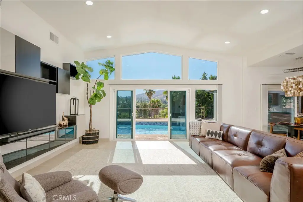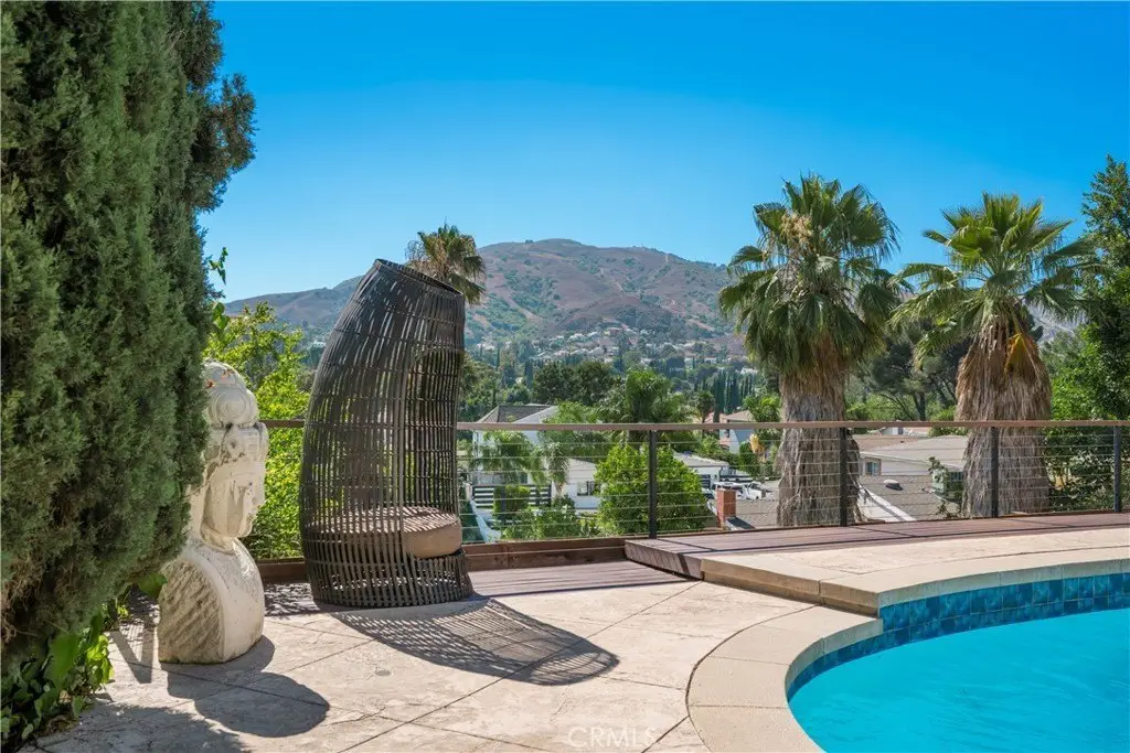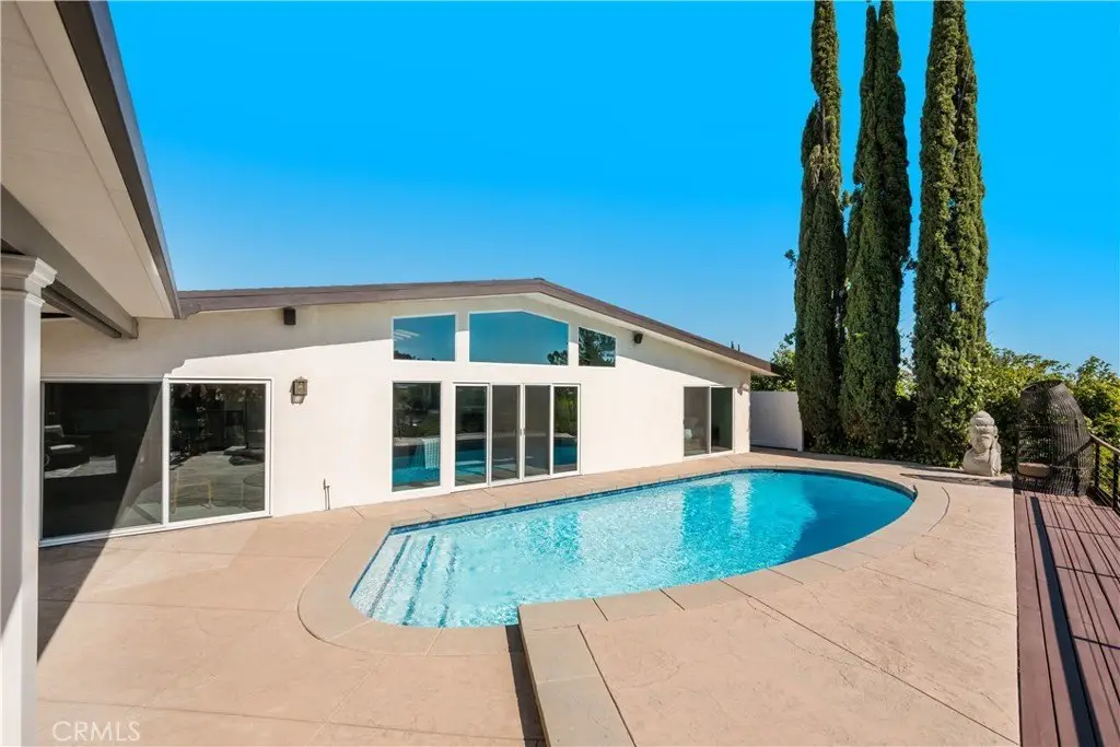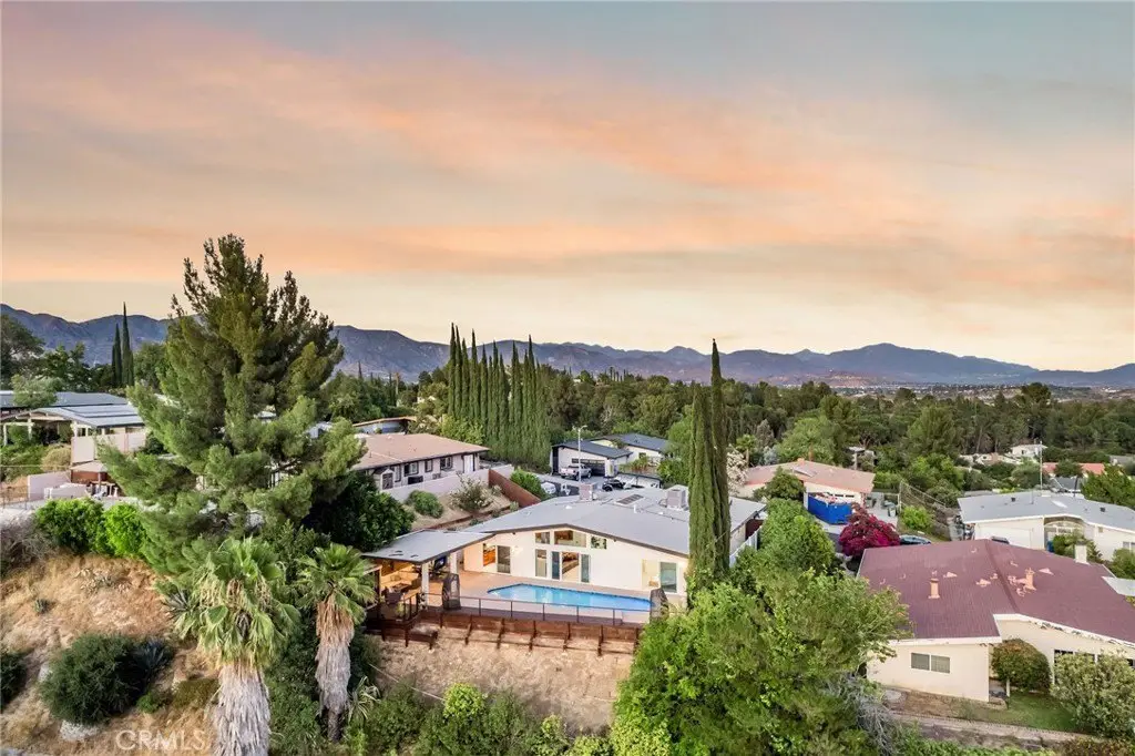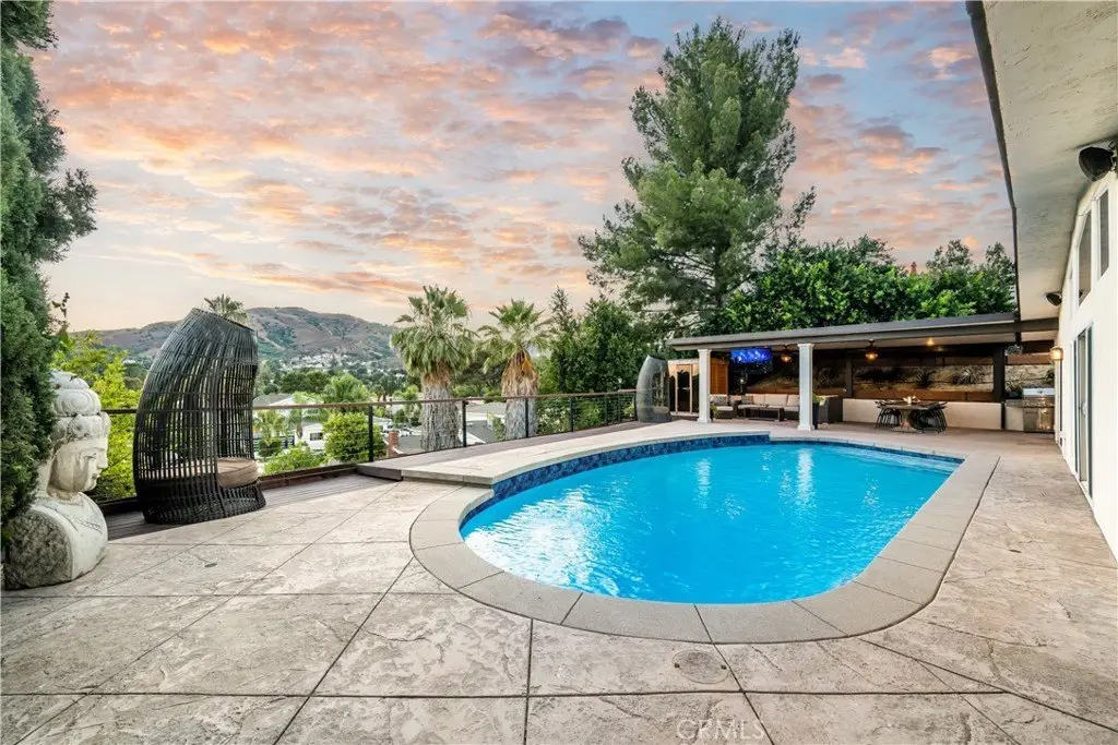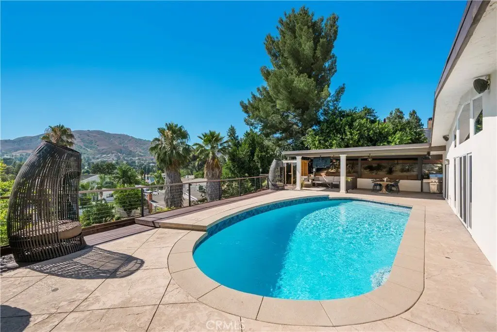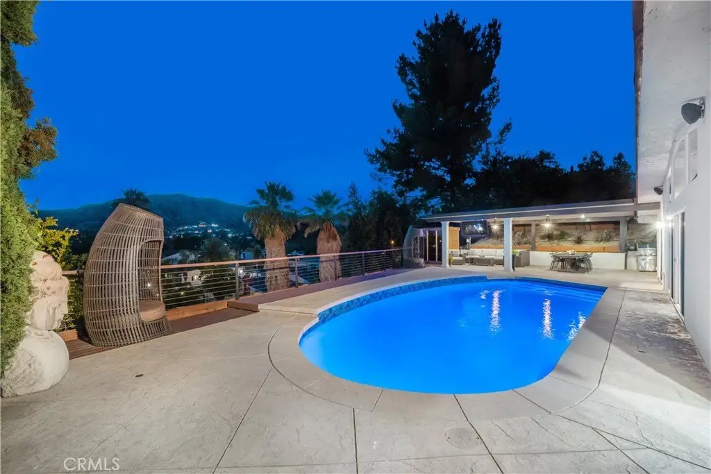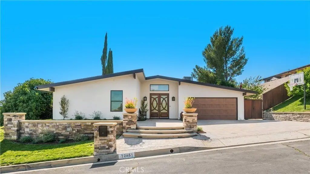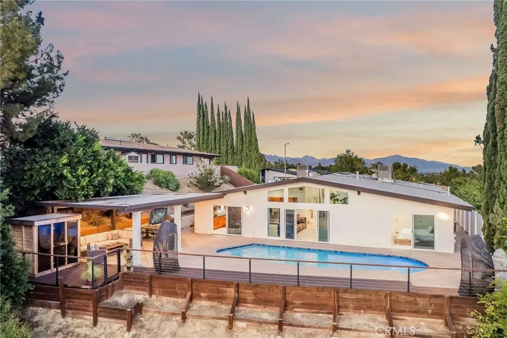 Welcome to this beautifully updated 4-bedroom, 2.5-bathroom modern View retreat located in Prime Granada Hills neighborhood North Of Rinaldi. Set on a quiet street with serene hillside views, this home blends mid-century design with luxurious indoor-outdoor living. Step inside through elegant double doors and be amazed what this true modern beauty has to offer. Natural light-filled open layout with vaulted ceilings with multiple skylights, tastefully remodeled all throughout. The spacious modern chef's kitchen with center island flows easily into the dining and living areas — perfect for family gatherings or entertaining guests. The resort-style entertainers backyard is made for California living — featuring a covered patio with a built-in TV, ceiling fans, outdoor dining and lounge area, dry sauna and a sparkling pool overlooking panoramic mountain views. Additional features include New LED recessed lights throughout, New entry chandelier and wall sconces, New interior paint throughout, Updated Central A/C & Heat, New side privacy fence, New landscaping & Sprinkler System, New Pavers and so much more. Truly A Must See!!!