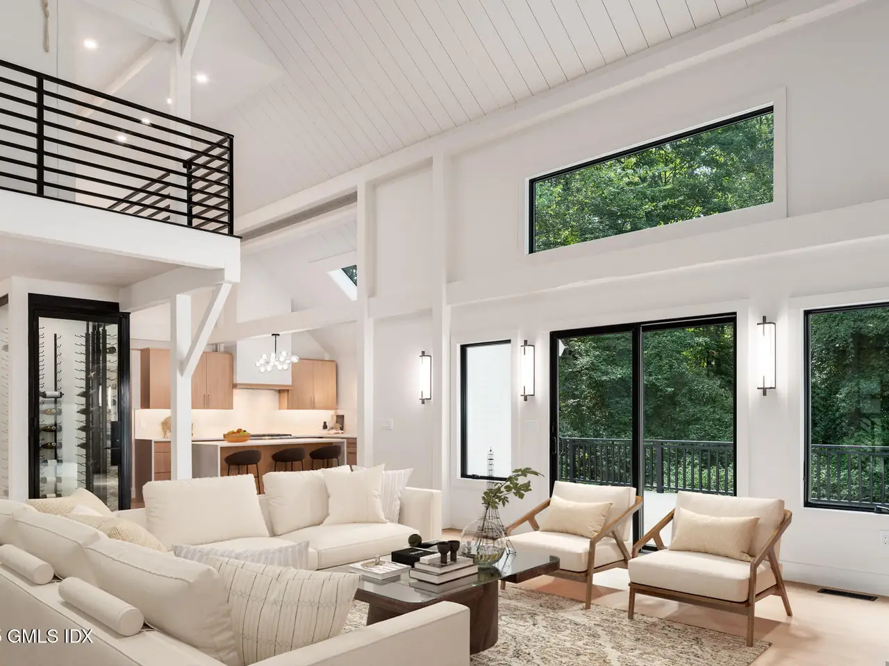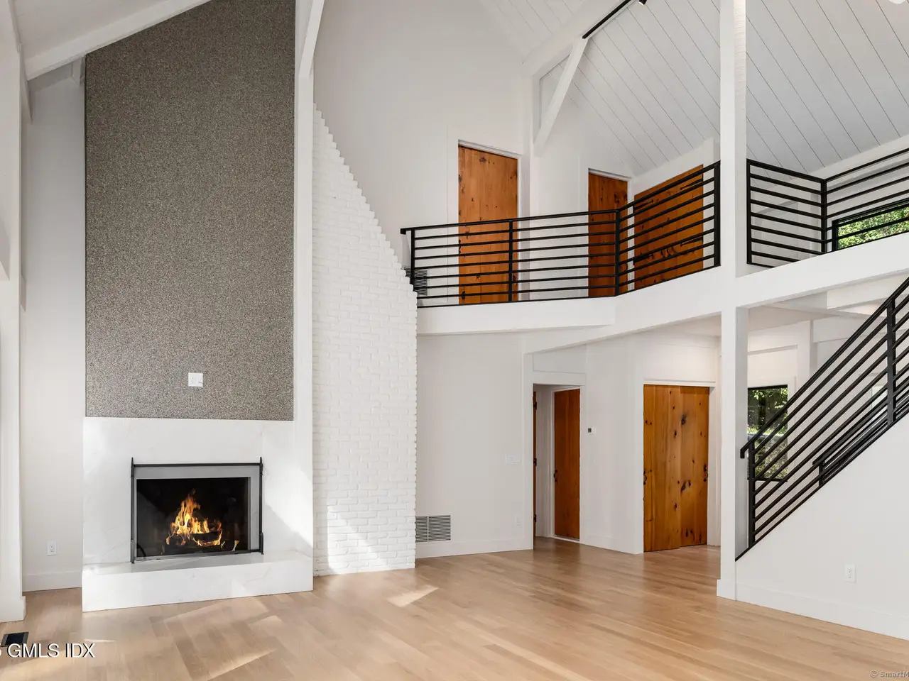 Ideally located near everything, this beautifully updated modern farmhouse-style home offers a perfect blend of comfort and elegance. Situated on a quiet cul-de-sac in Mid Country Greenwich, this private and peaceful residence features a custom design with striking architectural details. The spacious, open-concept living area boasts soaring 24-foot cathedral ceilings, a floor-to-ceiling fireplace, and an abundance of natural light. The gourmet kitchen showcases Quartz countertops with a stunning waterfall island and top-of-the-line appliances, making it ideal for entertaining and daily living. The first floor also includes a formal dining room and an oversized primary bedroom suite complete with a sitting area, fireplace, walk-in closet, and luxurious bath. Upstairs, you'll find two additional bedrooms and bathrooms, all recently updated with modern fixtures and finishes. There's also a large family or playroom, along with a second laundry room. All second-floor rooms are accessed via a spacious wrap-around hall balcony overlooking the main living space. Exposed beams and wrought iron hardware throughout add warmth and character, complementing the natural surroundings of the one-acre wooded property. Enjoy outdoor living on the expansive back deck that spans the length of the house perfect for relaxing or entertaining. Move-in ready and conveniently located close to town and schools, this home is waiting for new owners to enjoy immediately.