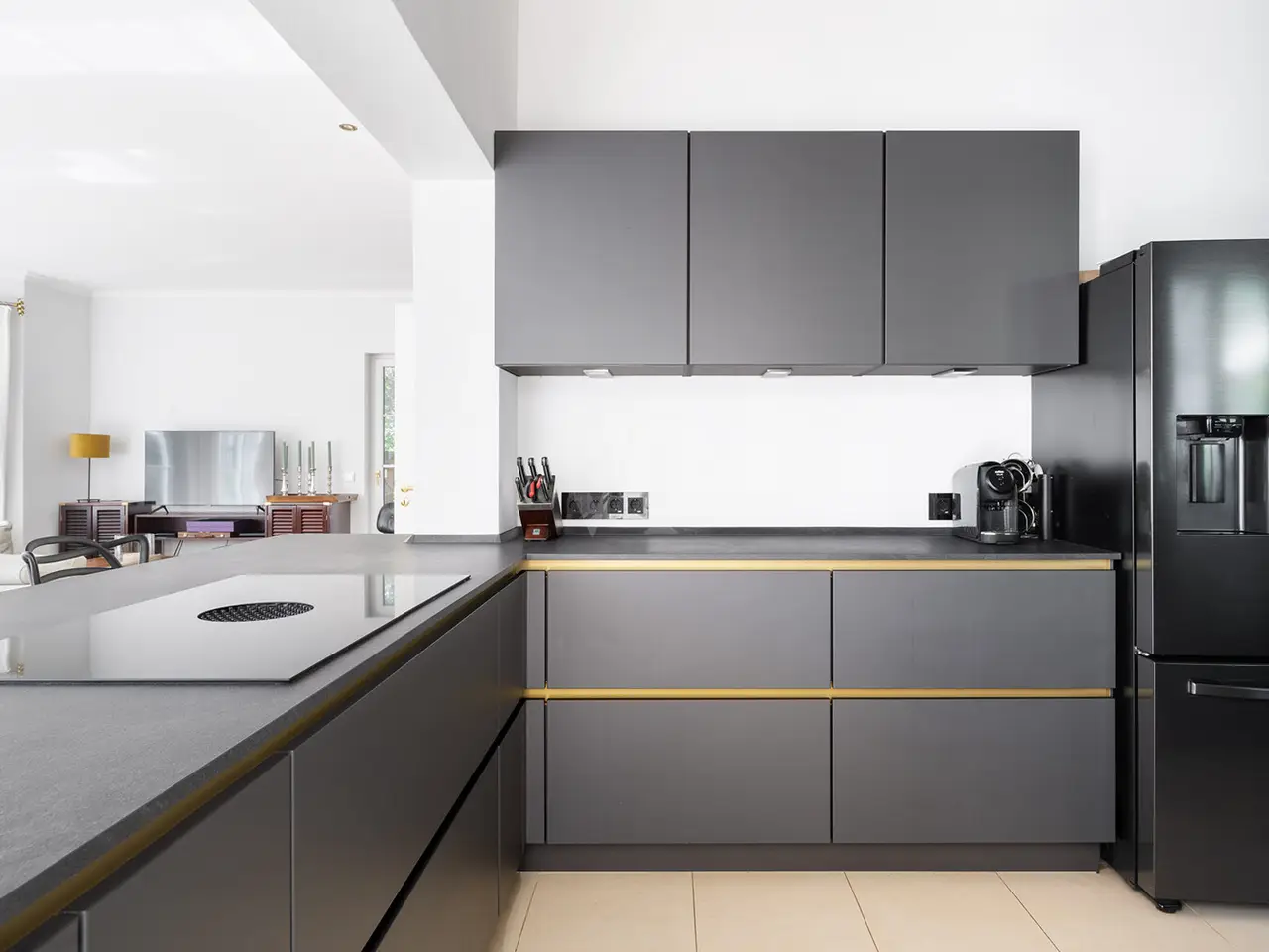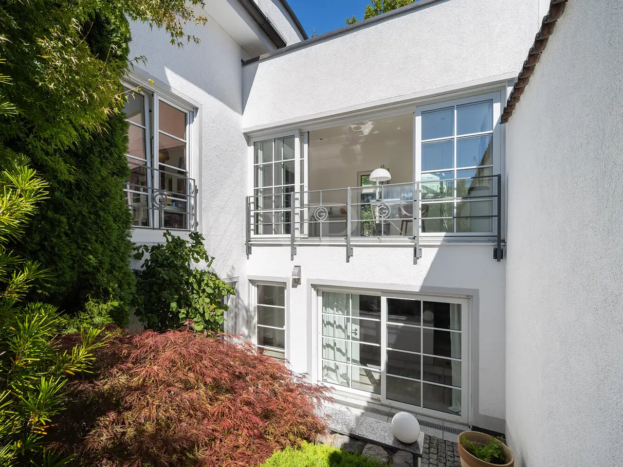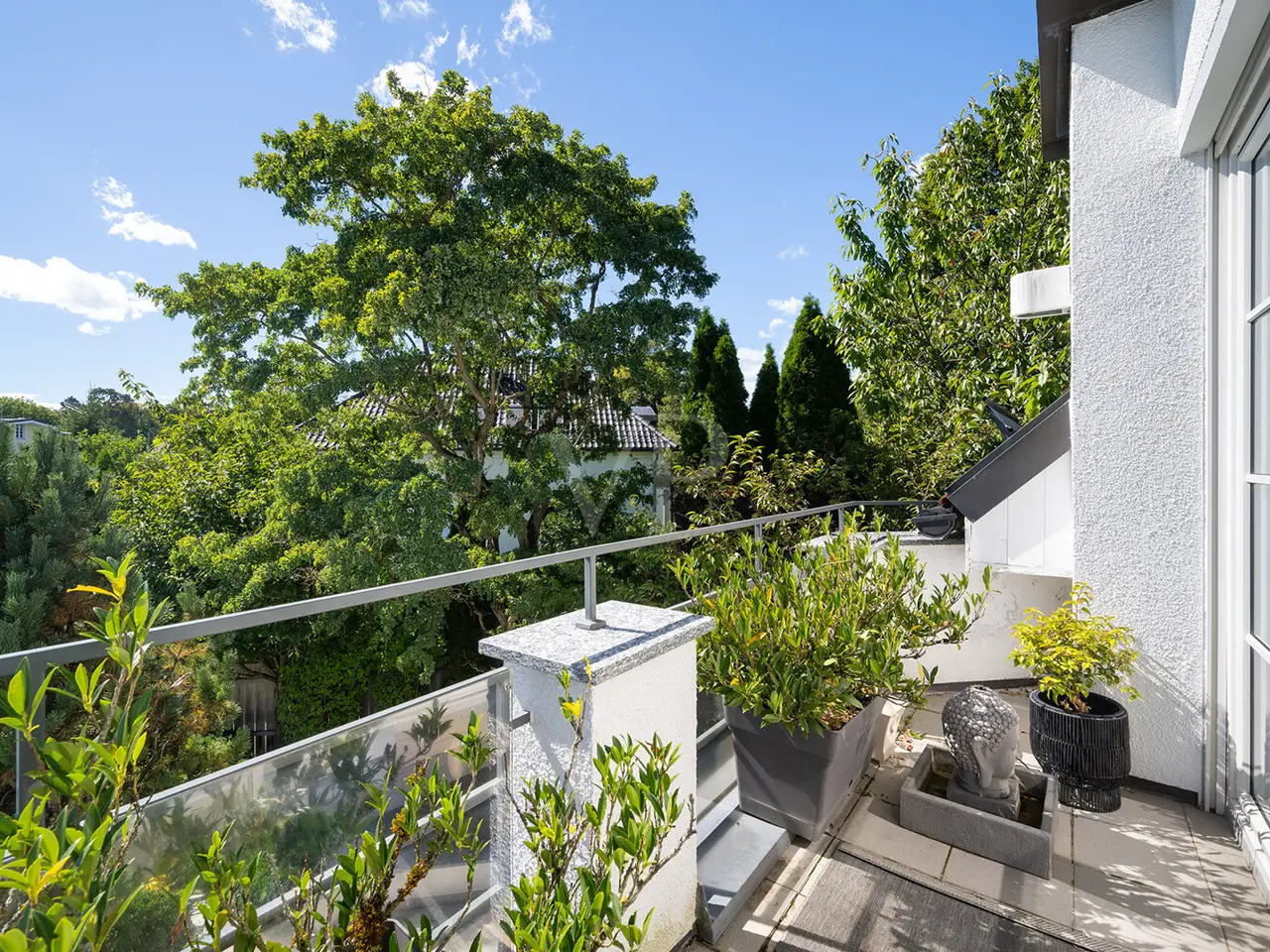 Welcome to your new home! A very well-maintained detached house built in 2002 that combines modern living in a quiet location with high-quality furnishings. The living space of approx. 257 m² is distributed over a well thought-out room concept that allows for many living ideas and offers a high level of comfort. The house is situated on a plot of approx. 628 m² and impresses with maximum privacy. Thanks to the secluded garden area and the well-tended south-facing garden, you can relax here without disturbance and enjoy absolute seclusion. The detached house, completed in 2002, impresses with its high-quality fittings and is in a very well-kept condition. As soon as you enter, the spacious hallway conveys an inviting feeling of living. The first floor is characterized by the spacious living/dining area, which receives plenty of natural light thanks to large windows and is equipped with a fireplace. The fireplace creates a cozy atmosphere in the colder months of the year. There is direct access to the spacious south-facing terrace with awning, which is ideal for socializing outdoors. The stylish, newly designed kitchen is equipped with high-quality BORA built-in appliances and meets the highest standards of functionality. The open-plan design makes this area a meeting place for family and guests. An additional room is currently used as an office and is seamlessly connected to the kitchen and living/dining area. From here you have access to the covered outdoor area on the north side. A guest WC and two checkrooms are also available on the first floor. The upper floor currently has a bedroom, a spacious bathroom with bathtub and shower, a bright and friendly living/dining area and an open kitchen. A use with two or three bedrooms and/or one or two bathrooms is also conceivable and possible - so there are a variety of possible uses. The artium in the basement also provides additional, fully usable living space. Two bedrooms with floor-to-ceiling windows as well as a bathroom and guest WC are available here. There is also an individually usable hobby room. You will also find plenty of storage space and the heating and laundry cellar. The successful room layout offers every generation enough space to retreat and develop. Further features include modern central heating, an alarm system and a spacious double garage. The well-tended south-facing garden was laid out according to Feng Shui and creates a natural living atmosphere with mature trees and plenty of space. The use of the two terraces also opens up numerous possibilities, for example for barbecues or quiet hours in the countryside. The quiet location makes this house a retreat from everyday life, without having to forego good connections to infrastructure and local amenities. The neighborhood is characterized by detached houses in a mature environment. Here you benefit from a familiar, friendly atmosphere. This detached house not only impresses with its size and location, but also with its high-quality and well thought-out fittings. See for yourself and arrange a viewing appointment to get to know your future home in person. This offer provides numerous prospects for couples, families and all those who value a well-kept environment with a wide range of possible uses.