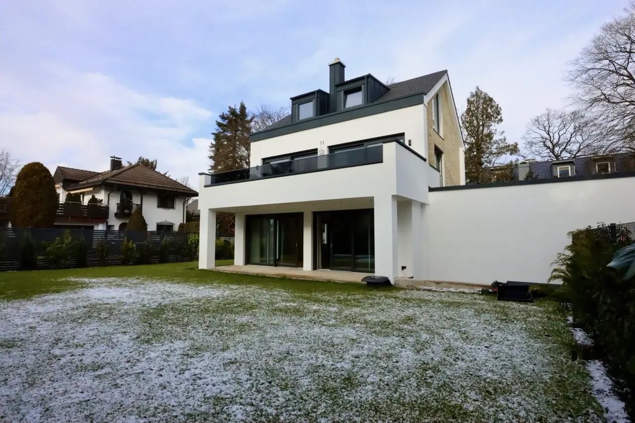 This villa in Grünwald is a home to feel at home in - a successful combination of stylish architecture, high-quality materials and a first-class location. The spacious south-facing terrace is a place of peace and relaxation, perfect for sociable evenings or relaxing moments with a view of the lovingly landscaped garden. Thanks to its ideal south-facing orientation, the sun floods the property throughout the day, creating a pleasant atmosphere. The interior reflects the harmony of the design: warm oak parquet floors, elegant tiles and an open fireplace create a cozy living atmosphere. The custom-made fitted kitchen with state-of-the-art technology leaves nothing to be desired and invites you to enjoy culinary experiences together. The bathrooms, equipped with high-quality fittings from Marina and Gessi, offer a private oasis of well-being with a spacious full bath and separate shower room. A tasteful guest WC on the first floor provides additional comfort. The well thought-out construction with energy-efficient brickwork guarantees a balanced indoor climate at any time of year. Large aluminum windows let in plenty of natural light and give the rooms an open, bright atmosphere. The top floor in particular benefits from the large window areas and creates an inviting feeling of living. The high-quality basement with natural light and separate access offers a variety of uses - whether as a granny apartment, studio or private workspace. These flexible rooms add an individual touch to the living comfort. The technical equipment also meets the highest standards: efficient district heating ensures a reliable heat supply, while the intelligent LED lighting concept adds stylish accents. Electric external blinds on the windows on the ground and upper floors allow flexible light regulation and ensure privacy. For additional security, modern video surveillance can be integrated as an option. This extraordinary villa is more than just a home - it is a place to arrive, enjoy and experience. Nestled in one of the most sought-after locations in Grünwald, it offers an exclusive living experience for people who are looking for something special. Arrange a viewing and let yourself be enchanted by this unique property.