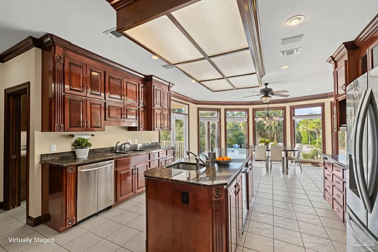Experience the best of Gulf Breeze living in this stunning home located in the heart of Gulf Breeze Proper. Natural light pours through two levels of windows, illuminating the grand living room with its soaring ceilings, gas fireplace, and impressive grand staircase. The open-concept design creates a seamless flow into the expansive kitchen, an ideal space for family gatherings and entertaining. The kitchen boasts an abundance of cabinetry, stainless steel appliances, granite countertops, an island with breakfast bar, and a charming dining area framed by a large window offering serene water views. The first floor also features a spacious guest bedroom with a private bathroom, perfect for visitors. Upstairs, the luxurious primary suite offers a generous sitting area with a view of the water. The primary bath is outfitted with a walk-in closet, dual vanities, a jetted tub, and a separate shower. An additional upstairs bedroom, complete with an en-suite bath and water views, provides comfort and privacy. Additional highlights include an elevator, 2020 roof, security system, and a massive 4+ car garage with a workshop area. Situated just moments from Shoreline Waterfront Park, boat launch facilities, and a recreation center with a children's waterpark, and only a short drive to the pristine beaches of Pensacola, this home perfectly blends luxury, convenience, and coastal living.