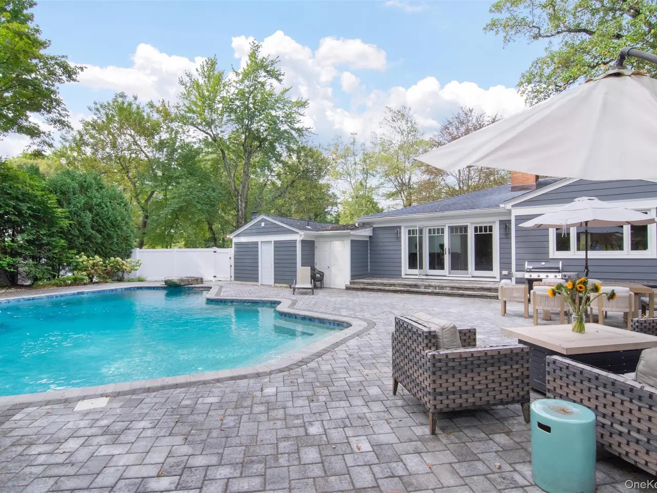 Your dream home in Hartsdale Estates is fully available. This beautifully reimagined and completely rebuilt modern Ranch offers the perfect blend of luxury, comfort, and everyday functionality. Set on nearly an acre in the sought-after Hartsdale Estates neighborhood, this home was thoughtfully designed for easy single-level living and exceptional entertaining. The bright and airy open floor plan features gleaming white oak floors, while oversized windows fill the spaces with natural light. At the heart of the home, a striking three-sided gas fireplace connects the spacious living and dining areas to a true chefs kitchen, complete with high-end Thermador and Fisher & Paykel appliances, ideal for hosting family and friends. The private bedroom wing includes three large bedrooms, two full bathrooms, and a convenient laundry area. The spacious primary suite feels like a personal retreat, featuring a spa-like bath with a soaking tub and walk-in shower, a custom walk-in closet, a cozy sitting area or home office, and even room for your own gym. The finished lower level offers a great bonus space for a family room, playroom, or media lounge, with plenty of storage and the option to add a fifth bedroom and bath. Enjoy your own backyard oasis with a heated Gunite pool, a full outdoor bath/dressing room, and a fully fenced yard that is perfect for entertaining, and making memories all year round. A spacious attached three-car garage completes this exceptional home. This move-in-ready gem has it all.