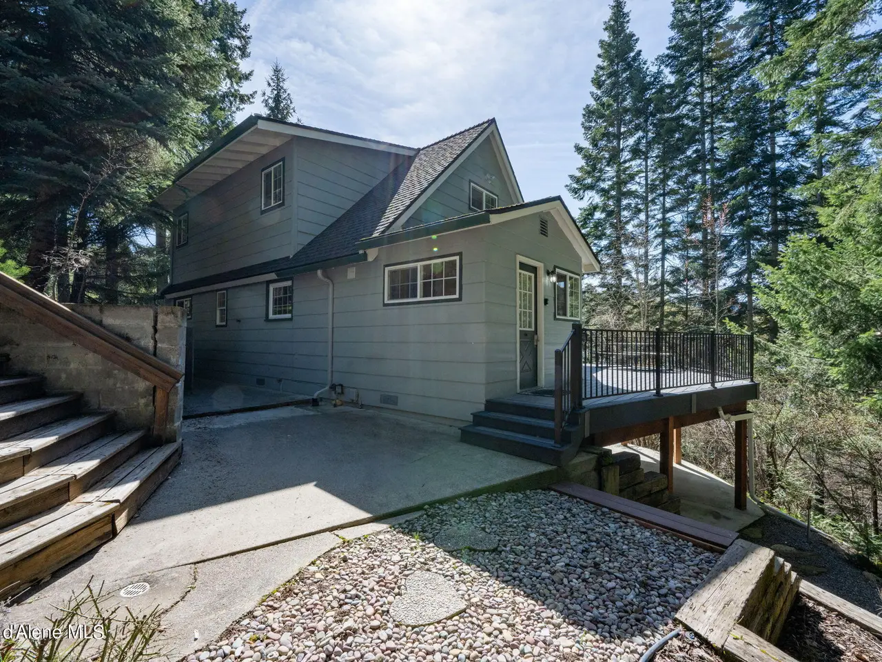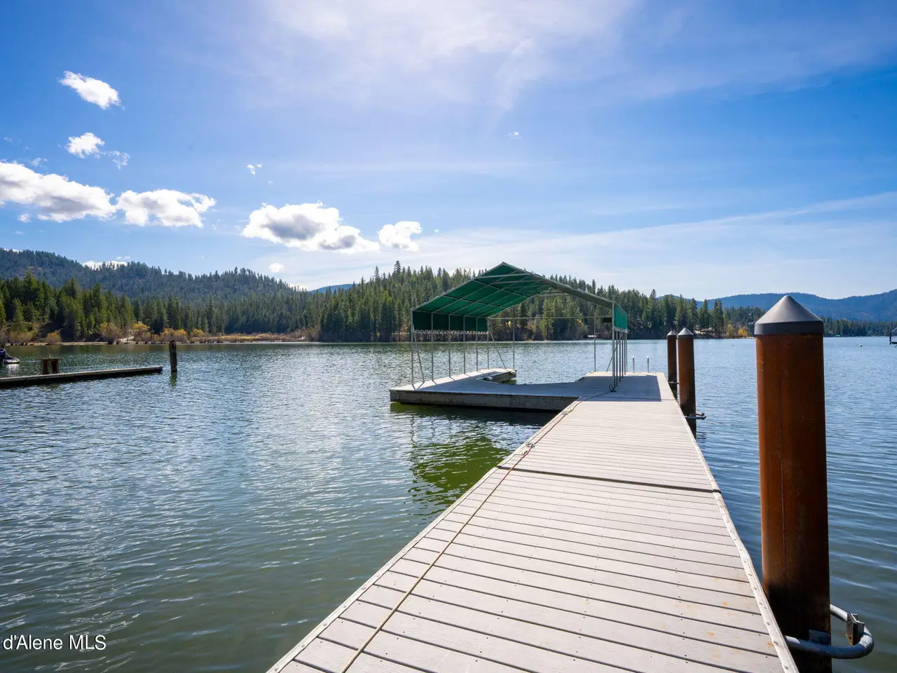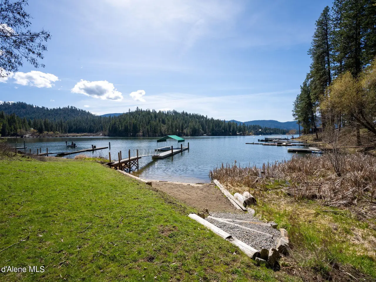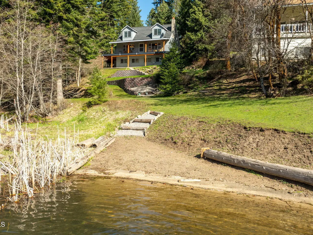 Nestled on Hayden Lake's coveted Mokins Bay, this waterfront retreat offers tranquility and recreation. Walk down to the covered dock and enjoy boating, kayaking, canoeing or fishing in the deep scenic bay that features a no wake zone. With 172 feet of waterfrontage and a sandy beach, the property spans 1.17 acres, comprising two lots, with a year-round creek running between the lots. The terraced landscaping has been thoughtfully designed to blend with the natural surroundings, creating a serene and inviting atmosphere. Originally built as a cozy lake cabin, this home has undergone a complete transformation to offer modern comforts and conveniences while retaining its rustic charm. Step inside to discover a beautifully remodeled interior, featuring updated kitchen and bathrooms, new flooring, and fresh paint throughout. With ample natural light, the home offers a warm and inviting ambiance, perfect for gatherings. Updated plumbing ensures worry-free living, allowing you to fully embrace the lakefront lifestyle. Whether you're seeking a private retreat for your family or an investment opportunity in the vacation rental market, this property offers endless possibilities. Previously, it operated as a successful vacation rental, the home comfortably accommodates 10+ guests. The detached garage provides convenient storage for all your lake toys and equipment, ensuring that you have everything you need to make the most of your time on the water. With its unbeatable combination of natural beauty, recreational amenities, and modern comforts, this Hayden Lake waterfront retreat offers a truly unparalleled living experience.