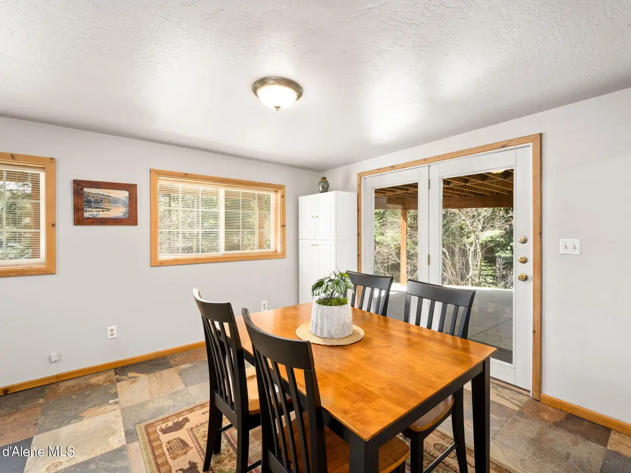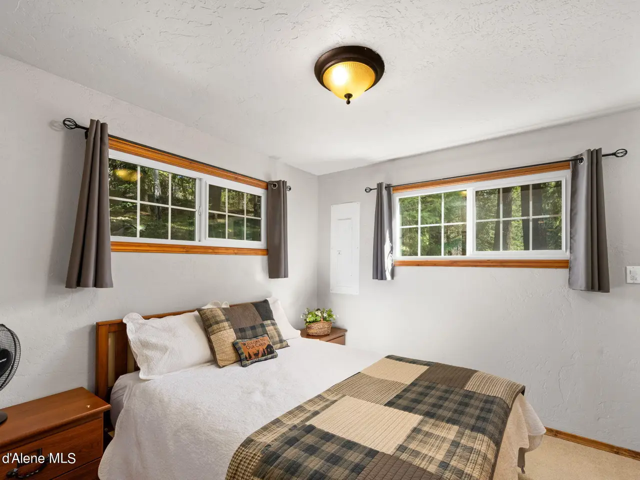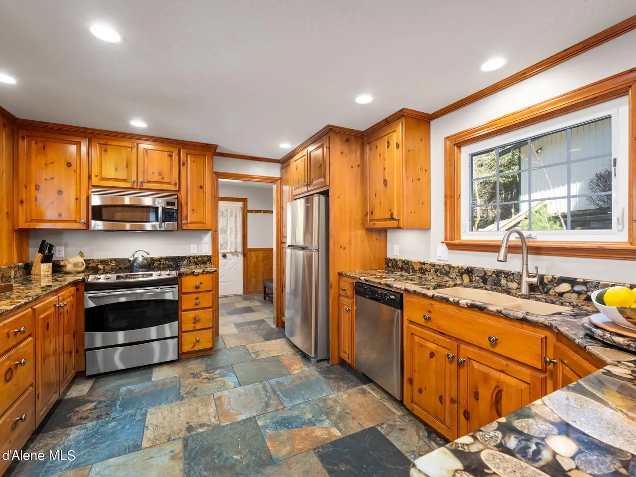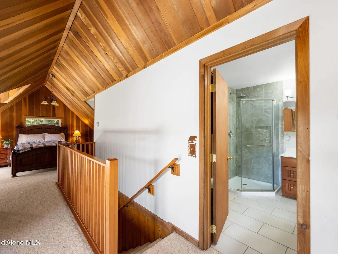 Nestled on Hayden Lake's coveted Mokins Bay, this waterfront retreat offers tranquility and recreation. Walk down to the covered dock and enjoy boating, kayaking, canoeing or fishing in the deep scenic bay that features a no wake zone. With 172 feet of waterfrontage and a sandy beach, the property spans 1.17 acres, comprising two lots, with a year-round creek running between the lots. The terraced landscaping has been thoughtfully designed to blend with the natural surroundings, creating a serene and inviting atmosphere. Originally built as a cozy lake cabin, this home has undergone a complete transformation to offer modern comforts and conveniences while retaining its rustic charm. Step inside to discover a beautifully remodeled interior, featuring updated kitchen and bathrooms, new flooring, and fresh paint throughout. With ample natural light, the home offers a warm and inviting ambiance, perfect for gatherings. Updated plumbing ensures worry-free living, allowing you to fully embrace the lakefront lifestyle. Whether you're seeking a private retreat for your family or an investment opportunity in the vacation rental market, this property offers endless possibilities. Previously, it operated as a successful vacation rental, the home comfortably accommodates 10+ guests. The detached garage provides convenient storage for all your lake toys and equipment, ensuring that you have everything you need to make the most of your time on the water. With its unbeatable combination of natural beauty, recreational amenities, and modern comforts, this Hayden Lake waterfront retreat offers a truly unparalleled living experience.