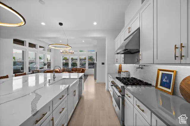 *Seller offering a $25,000 concession for Buyer's closing costs and/or interest rate buydown.* Inside the privacy of a well-maintained and gated community, thoughtful design and acute attention to detail are few of the many qualities that set his home apart. As you enter the main level, an entertainer's kitchen with ample storage, top-tier appliances and an expansive island create a joyful environment to gather in. Custom cabinetry elevates the kitchen along with other thoughtful locations of the home and is further exemplified in the open and bright family room, home office, and master closet. An island and en-suite washer and dryer bring class and convenience to the master suite, and the large primary bathroom's standalone soaking tub and beautifully tiled shower create a luxurious atmosphere. Upstairs, three bedrooms, two full baths, and an additional family and laundry room await, all with an abundance of natural light and high-end finishes. The basement adds more use and functionality with a home gym, large entertainment room, two more bedrooms with private bathrooms, a wet bar, laundry hook-ups, and more. A robust whole-house water filtration system, interior and exterior surround sound, heated deck, and Control4 Home Automation to streamline sound, lighting, and security take the space even further. The fully landscaped and low-maintenance yard with a custom waterfall, putting green, fire pit, Bullfrog Spa, and consistently beautiful turf lawn make the outside spaces equally as pleasing as the home's interior. All of these features and many others come together to create a space to be experienced. All furniture is also available for purchase.