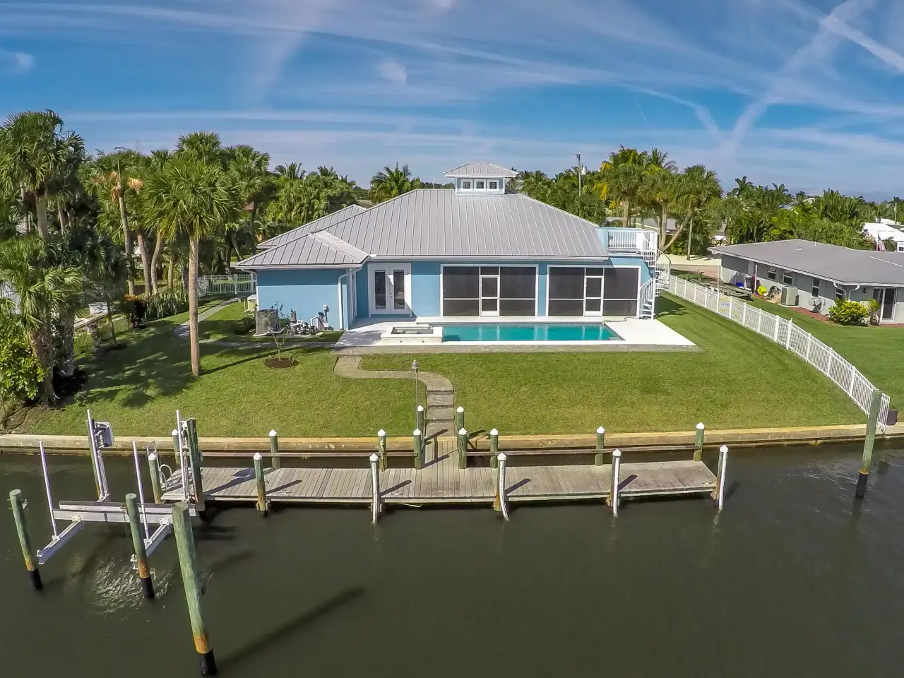 INCREDIBLE WATER VIEWS COME STANDARD! New (2016) waterfront home in search of big boat to share sunsets and the Salt Life! Finding a newly constructed home on the water in this area is like discovering a hidden treasure!! This gem showcases an exceptional open floor plan, upgrades galore, four bedrooms, 3.5 baths, oversized two-car garage and a pool with spa overlooking the water. This thoughtfully designed home has left nothing to the imagination! Its timeless Key West design and prominent Cupola providing additional interior light features a kitchen that is the home's hub for entertaining. The Stainless Steel GE Café Series appliances include a Gas Range (rare in this area). You will also have the convenience of kitchen-side dining at the expansive granite topped island or convening to the More...to the more formal dining area. Both offer incredible views of the water. From there you may adjourn to the living area with fireplace overlooking the pool, dock and waterfront. Actually, you have water views from most of the rooms in this incredible home! You may also decide to take advantage of the Summer Kitchen and gas grill for your outdoor BBQs by the pool! If first impressions matter, your guests will be amazed at the water views as they step into the voluminous entry way with 14-foot ceiling, 10-foot double-stepped coffered ceilings (with crown molding) throughout the rest of the house, three-zone air conditioner, impact windows and doors, Graber vertical and pull-down cellular shades, wood Cabana Shutters, LED Lighting throughout, tankless gas hot water heater and many more energy-saving features. You will be pleased with the low cost to maintain and insure this solidly constructed home. So many incredible upgrades and features to this home! So, here's just a few: 250 gallon propane tank (owned) Heated Salt Water Pool and Raised Spa Whole House Gas Generator 22 KV (2 Years Left on Warranty) Navien Tankless Gas Hot Water Heater Gas Fireplace Gas Range (GE Cafe Series Stainless Steel Appliances) Summer Kitchen with Refrigerator and Gas Grill Sundeck and Spiral Staircase off pool with view of Jupiter Island and ICW Recessed LED lights throughout Coffered Ceilings Central Vac 3 Zoned Air Conditioner Current Standards Impact Glass and Windows Security System with 8 Cameras Irrigation Well with Rust Filter Your home will have: 4 Bedrooms with Master on Split Floor Plan 3.5 Baths (Bidet In Master Bath) Oversized 2 Car Garage with Plenty of cabinets and overhead storage 2,675 square feet under air - 3,875 square feet total 100' of waterfront with Concrete Seawall on 1/3 Acre 50' Dock with 50 Amp Power and water 10,000 LB Boat Lift 14.7 x 28.6 Covered Patio with No Seeum's Screen Master Bath has Dual Head Walk-in Sports Shower and Soaker Tub Pull down ironing board, lots of storage in large laundry room Desirable North Exposure