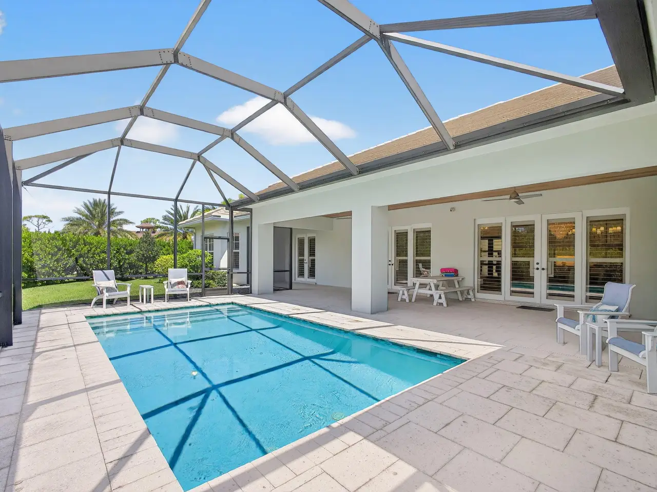 Stunning One-Story Modern Residence In Hobe Sound Golf Club! Built In 2020, This Impressive 5 BR, 5 BA Home w/3 Car Garage, Corner Lot on .43 acres Features An Open-Concept Split Floor Plan Designed For Both Comfort & Entertaining w/Generator, All Impact Windows & Doors, Porcelain Tile Floors & Plantation Shutters Throughout. The Light-Filled Living Spaces Flow Seamlessly to the Gourmet Kitchen & Spacious Great Room, Showcasing Contemporary Finishes, Great Rm has Tray Ceiling w/Tongue & Groove Shiplap. Chef's Kitchen is Appointed w/Oversized Island, Quartz Countertops, Walk-In Pantry, Thermador Appliances, & Gas Range. The Luxurious Primary Suite Opens to Lanai & Pool Area & Includes Spa-Inspired Bath w/Soaking Tub, Frameless Glass Walk-In Shower, Custom Walk-In Closet w/Built-Ins, 4..... Oversized Guest Bedrooms Provide Comfort & Privacy, While Large Laundry Room Features Sink, Counters & Extensive Storage Cabinets. The Generator Adds to The Home's Quality & Peace Of Mind. Step Outside to A Screened-In Lanai Overlooking the Heated Saltwater Pool & Expansive Corner Lot Perfect For Enjoying Florida Living At its Finest. Ample Storage Complete This Exceptional Home In The Serene And Secure Hobe Sound Golf Club Community.