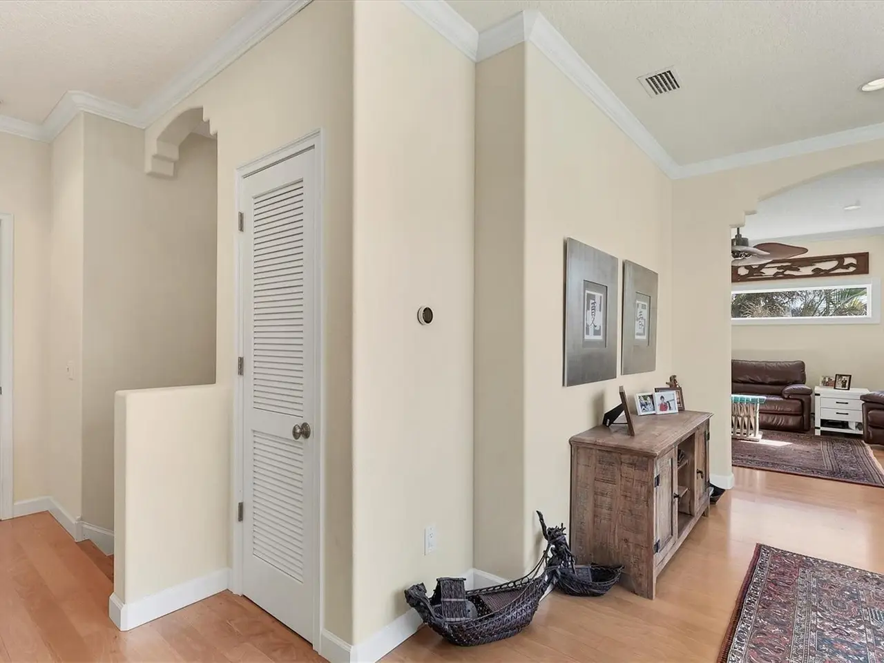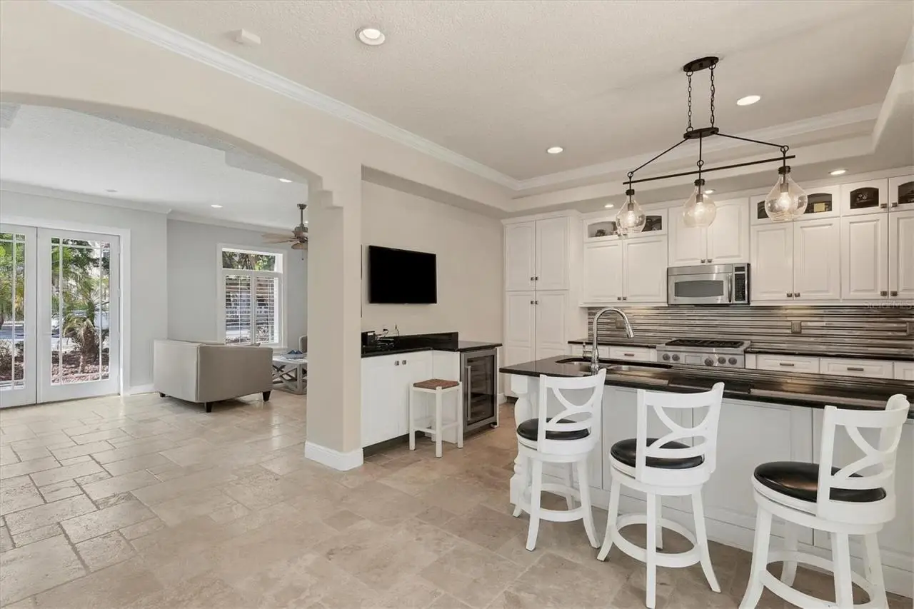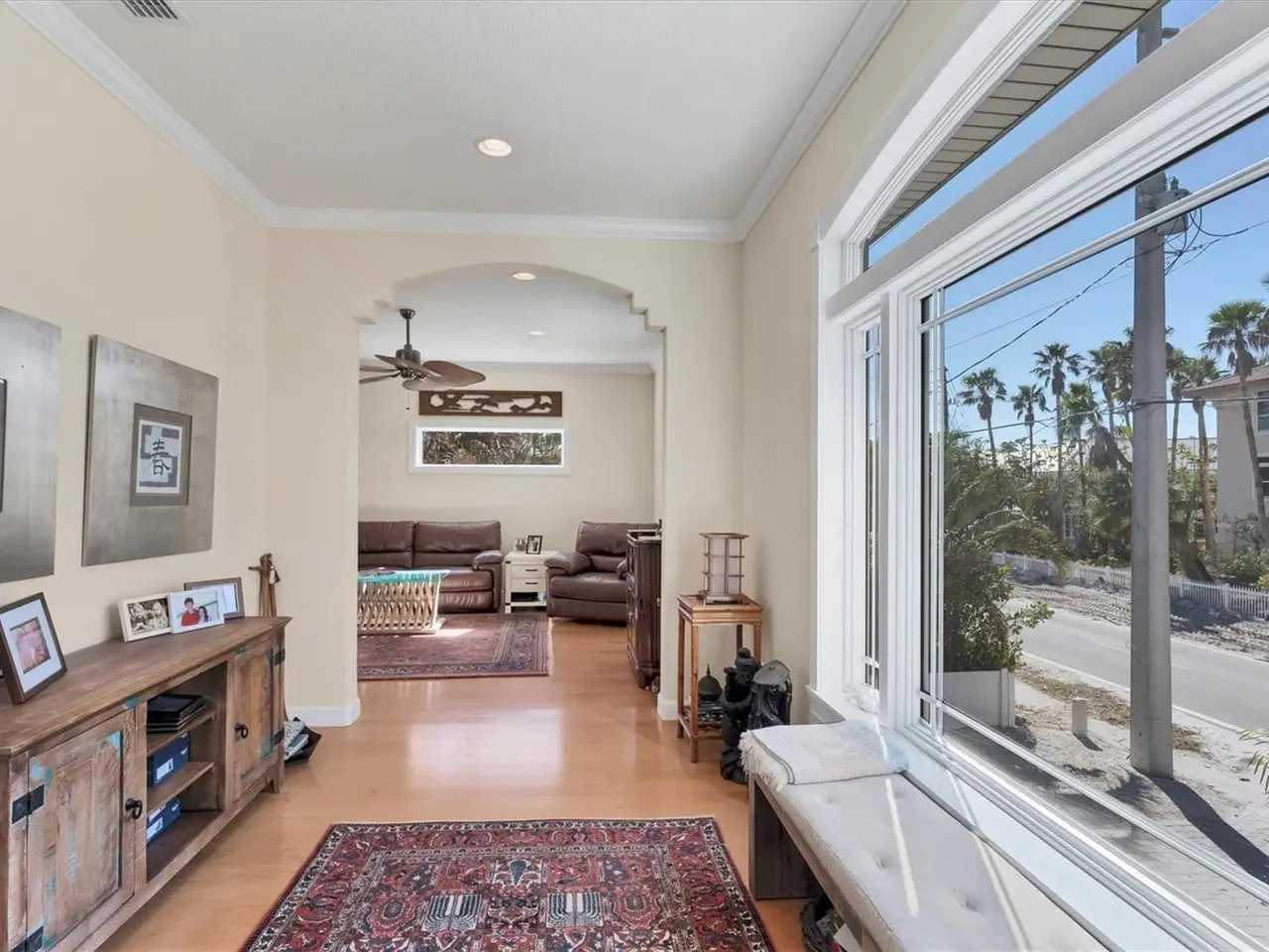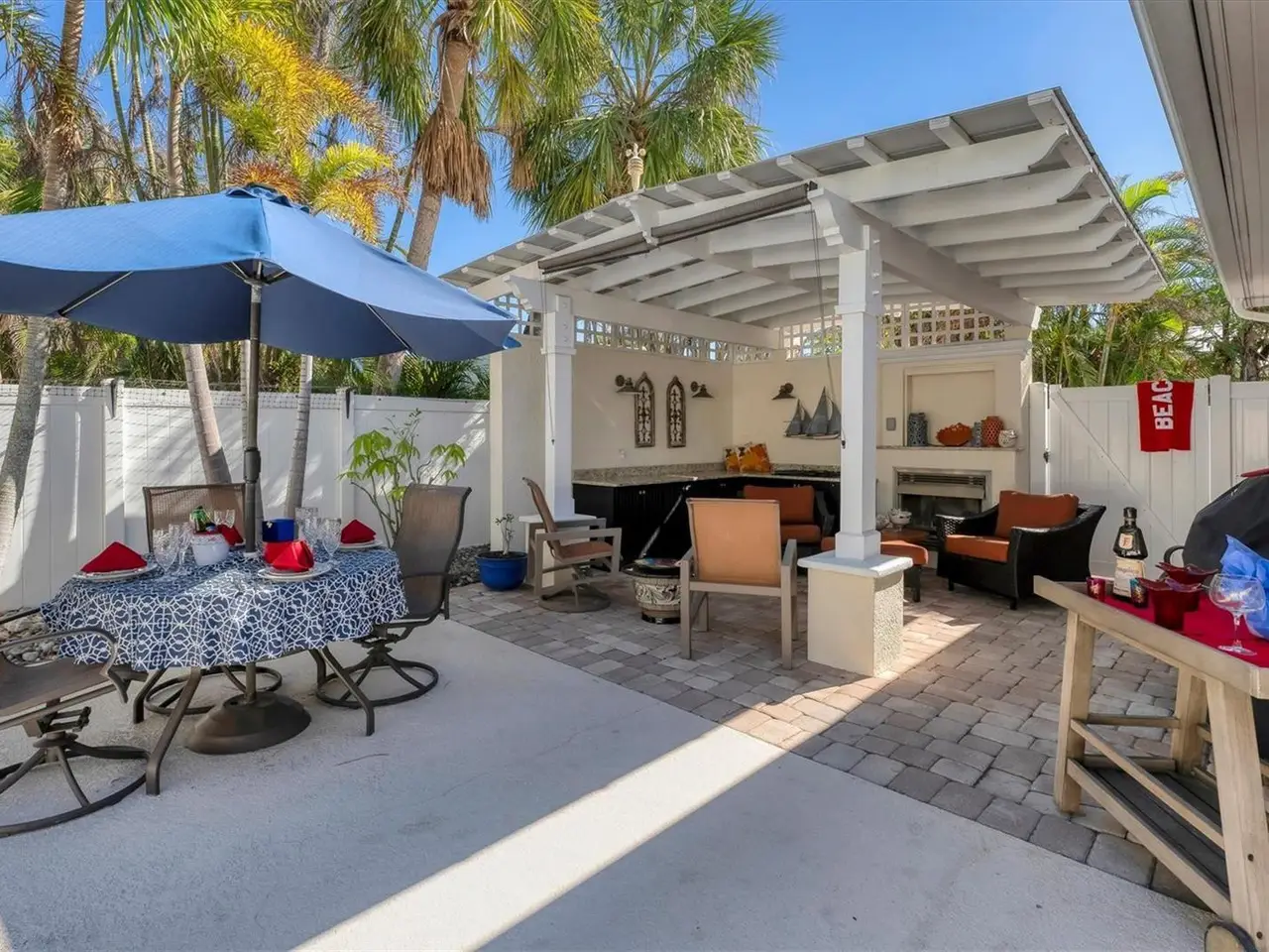 Location, location, location! This beautiful custom home in West Wind Shores is just across the street from the beach and minutes from Anna Maria Island. With an oasis-like backyard and swimming pool, this property offers the ultimate coastal lifestyle. Custom features abound, including high ceilings, arched entryways, travertine flooring, plantation shutters, 5-inch baseboards, recessed lighting, and large walk-in closets. As you enter through the front French doors, you're greeted by a cozy main living area complete with a gas fireplace. To the right, a versatile bonus space awaits, ideal for a dining area or hobby room. The thoughtfully designed split floor plan flows seamlessly, offering two primary bedrooms-one on each floor. The kitchen is a chef's delight, featuring granite countertops, custom cabinetry, newer Bosch appliances, including a Wolf gas stovetop with electric Wolf oven (rare on the island), a breakfast bar with pendant lighting, a glass-tiled backsplash, a wine refrigerator, and elegant travertine flooring. The downstairs primary suite overlooks the pool and offers ample space and luxurious details, including an oversized marble-tiled shower with a glass enclosure, dual sinks, extra storage, and a makeup/dressing table. Upstairs, the second primary suite boasts a large walk-in closet, an ensuite bath, and double doors leading to a loft area with large, picturesque windows that invite you to relax with a book in the afternoon light. The third bedroom is currently being used as an office, complete with built-in bookshelves and a Murphy bed for added flexibility. Sliding glass doors lead to a backyard oasis featuring palm trees, a pergola, a partially covered paver patio, and a completely fenced-in yard. The heated pool and outdoor kitchen, complete with a gas fireplace, create the perfect setting for entertaining. The space is wired for cable, allowing you to enjoy your favorite games while lounging or barbecuing. For pet lovers, there is a separate fenced area and a convenient storage shed. This custom home combines luxury, comfort, and an unbeatable location near the beach and Anna Maria Island. Convenient and complimentary trolley across the street. Walk across the street for sunset every night on the other side of a tall building complex. Don't miss your chance to own this coastal retreat