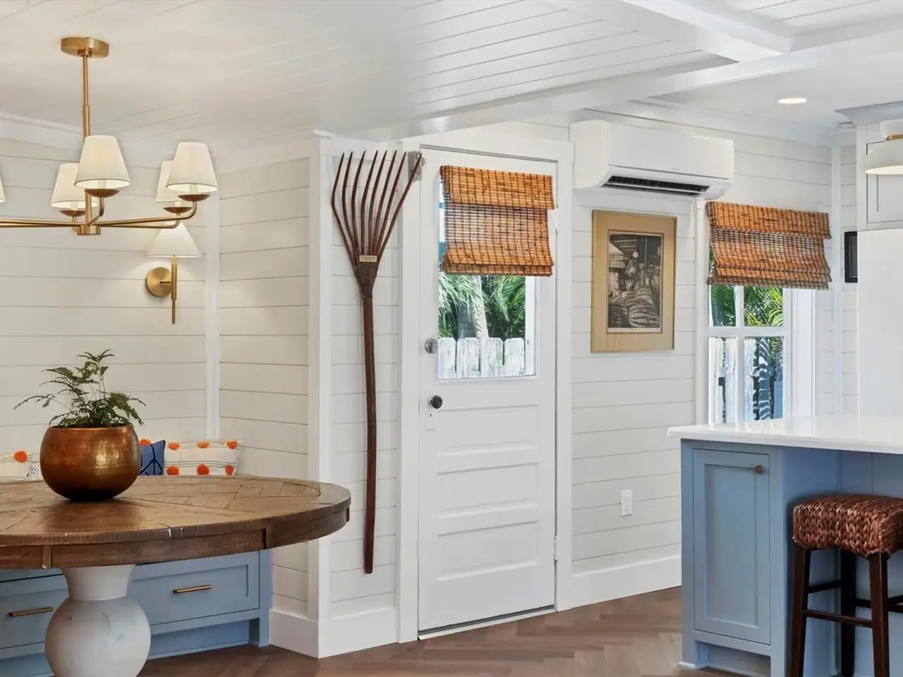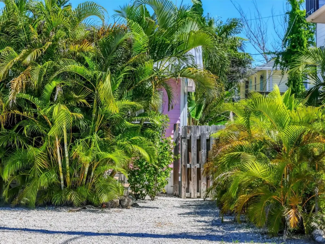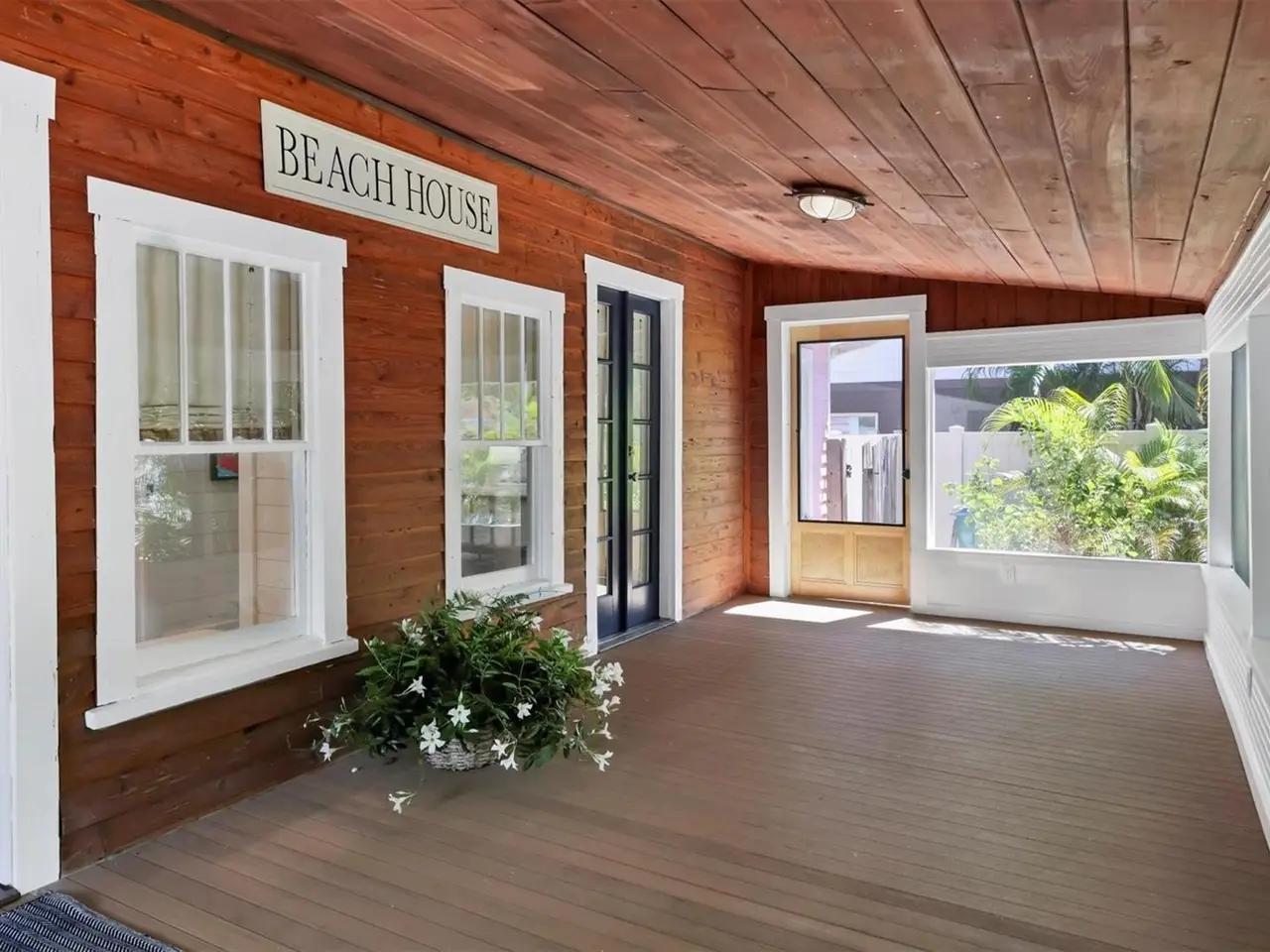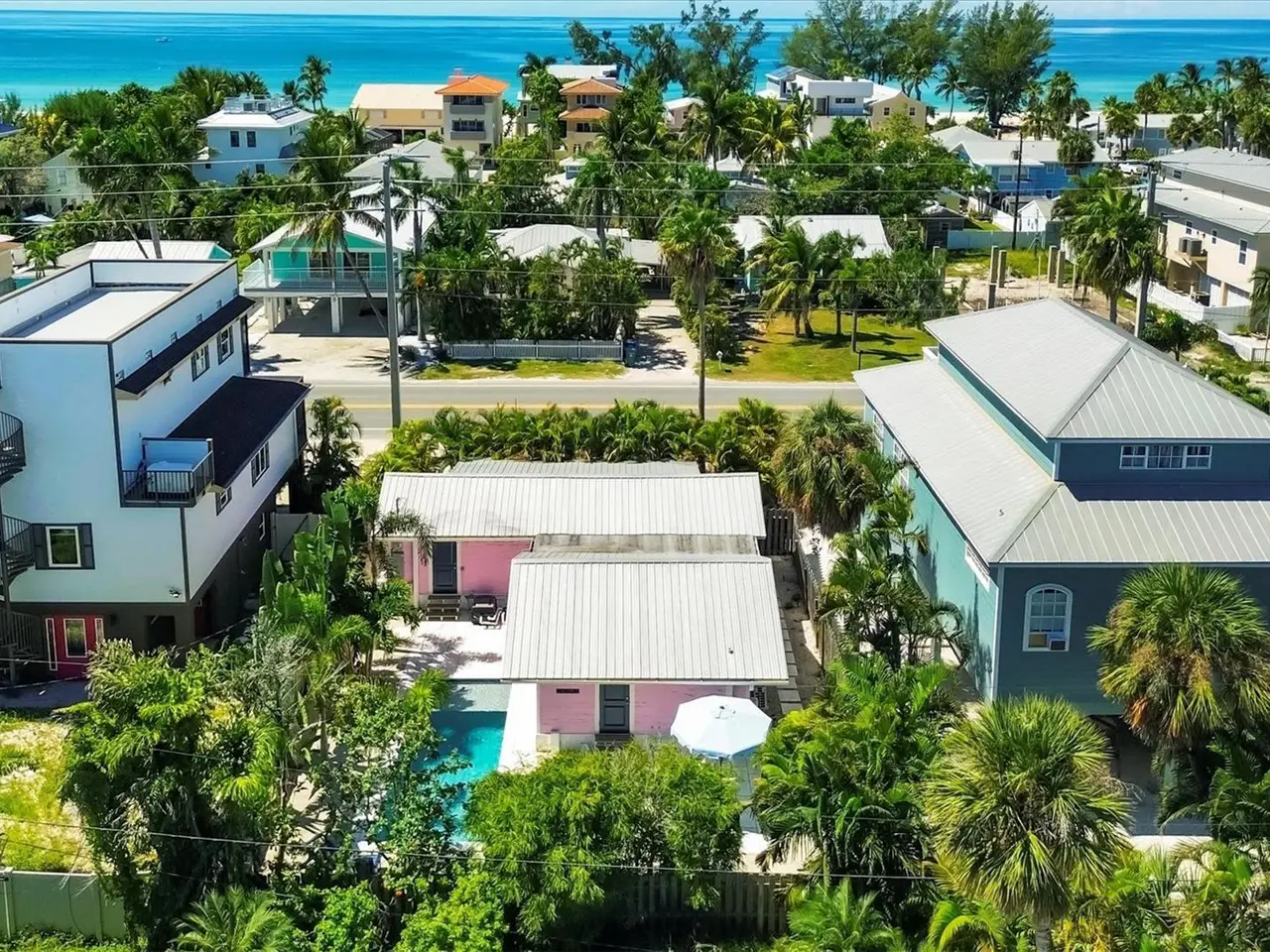 Step onto the spacious screened front porch, now featuring Timber Tech by Azek Porch Collection decking, framed by original Pecky Cypress siding, and enjoy the timeless charm of this lovingly restored 1940s 2 bed / 2 bath craftsman beach cottage just steps from the Gulf. This home blends Old Florida character with today’s comfort. Inside, new shiplap walls pair with Daltile’s Asher Bend luxury vinyl flooring in a herringbone pattern over a brand-new subfloor. This waterproof, scratch resistant surface combines the warmth of wood with the resilient vinyl, perfect for beachside living. The open kitchen boasts custom floor-to-ceiling cabinetry handcrafted in Pennsylvania, a built-in breakfast nook with matching benches, a Café Series appliance package in matte white, brushed bronze hardware, and Carrara. Emporio acrylic solid surface countertops for beauty and practicality. Both bathrooms feature spa-inspired tilework, one with a custom glass shower enclosure. The primary suite opens directly to the pool, while the guest bedroom provides its own private layout. A newly designed laundry suite adds everyday convenience with an Electrolux washer and dryer plus a high built-in countertop for organization. Outdoors, enjoy a fenced backyard oasis with an Agnelli-installed, custom-designed saltwater pool completed in 2022, surrounded by palm-lined landscaping for a private retreat. Behind the scenes are new plumbing and light fixtures throughout, spray foam insulation under the floors, new batt insulation in the walls, and carefully sourced finishes, all completed in 2025. With proven rental income managed by the owner and even stronger potential under professional management, the Pink Palm is an iconic island cottage reimagined for today.