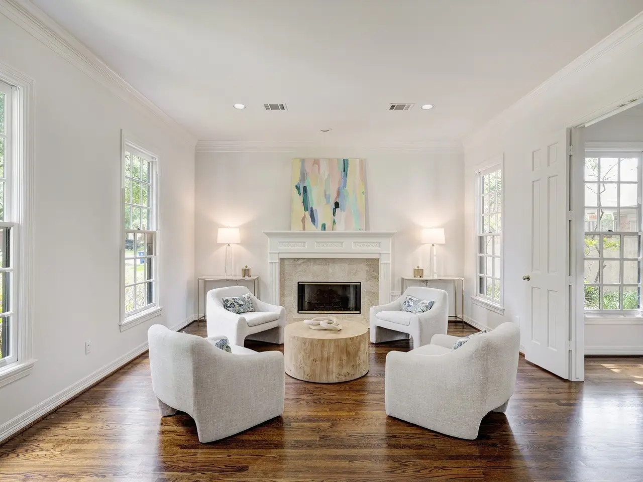 Formal living area with fireplace and wet bar