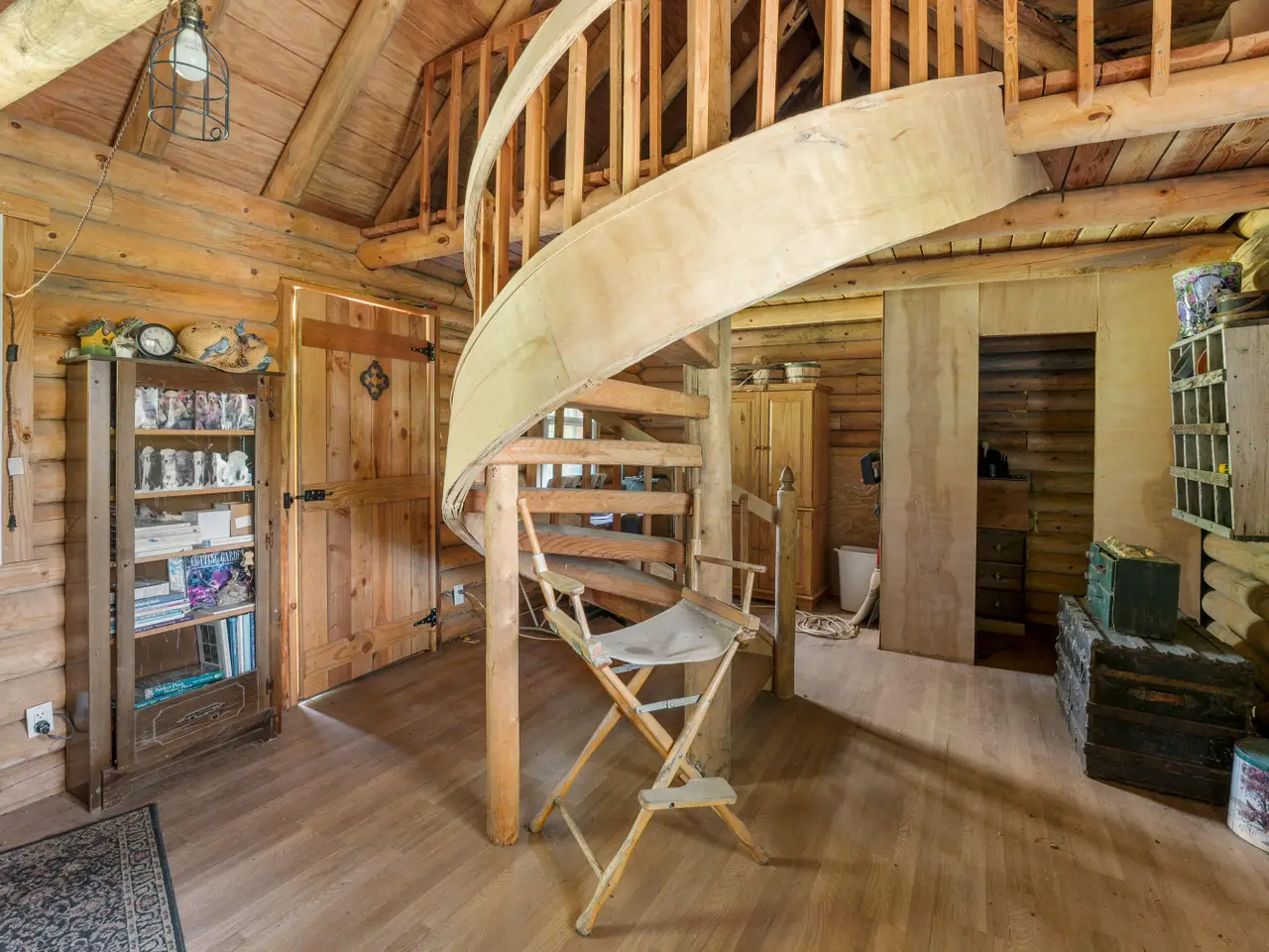 Log cabin hobby room with spiral staircase