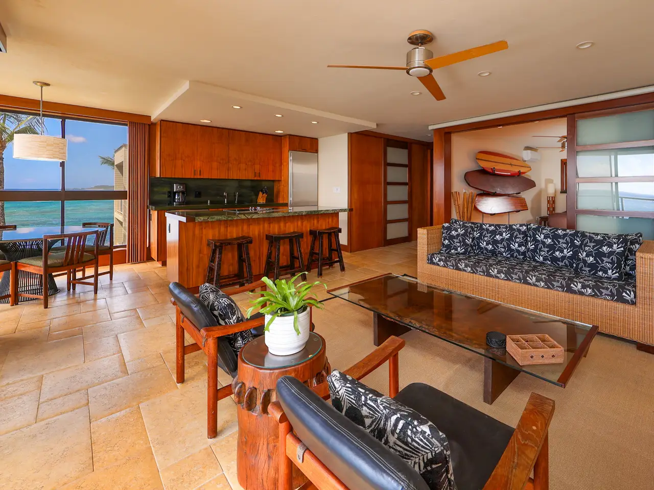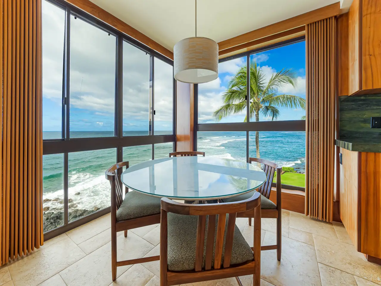 Iconic, rare and meticulously crafted, Kuhio Shores 413 is the most remarkable oceanfront condominium listed on Kauai. Located on the top floor of the four-story Kuhio Shores, its floor-to-ceiling windows and lanai overlook Kauai's pristine Poipu coastline and three renowned surf breaks, inspiring the designer's unique blend of mid-century & Asian surf vibe. Kuhio Shores 413 interiors feature custom Koa cabinetry and Brazilian Cherrywood shoji doors, Egyptian tile flooring, recessed lighting, split air conditioning, modern appliances, vintage mid-century and custom-designed furnishings, and a collection of Hawaiiana objet d'art. To discover a residence on Kauai of this caliber in a location of this quality is highly uncommon. Well-maintained by the owners who enjoy their home for 4 months annually, Kuhio Shores 413 is a sought-after vacation rental and is being offered for sale fully furnished. Residents of Kuhio Shores enjoy surf breaks and sunsets, whales and sea turtles, snorkel spots, coastal bike rides and walks, in addition to maintained grounds, barbecue facilities, and elevators. Lawai Beach, Poipu's Baby Beach, and The Shops at Kukui'ula are nearby. FACTS AND FEATURES Interior SF: 953 SF Lanai SF: 106 SF Location & Access: Top Floor Access by Elevators Views: Unobstructed Ocean, Ocean Horizon, Coastline Orientation: South Cooling: Split Air Conditioning System Living: Brazilian Cherrywood featured walls and shoji privacy doors, vintage mid-century and custom-designed furnishings. Kitchen: Custom Koa & Ipe wood cabinetry, SubZero refrigerator, macauba and Rain Forest marble counters in a custom green. Primary Bedroom Suite: Custom built-in platform bed and bamboo cabinetry. Its ensuite features Rain Forest floor-to-ceiling marble-slab shower, macauba vanity top. 2nd Bedroom: Custom built-in platform bed and bamboo cabinetry. 2nd Bathroom: Rain Forest marble-slab shower, macauba vanity top.