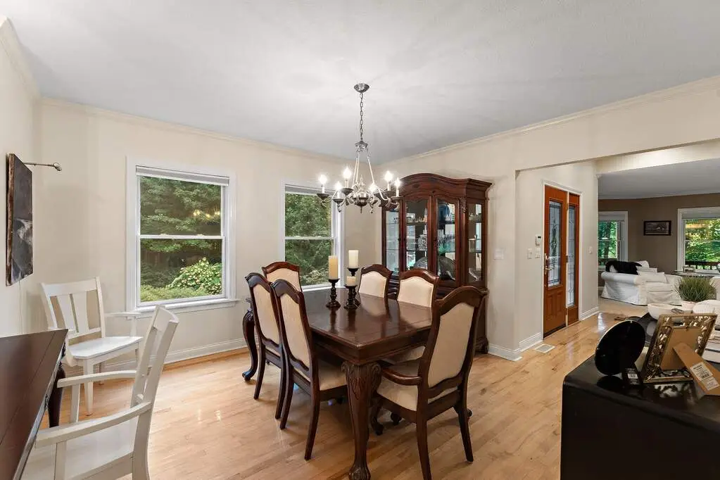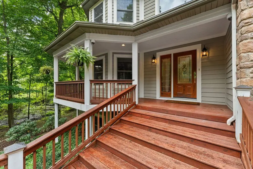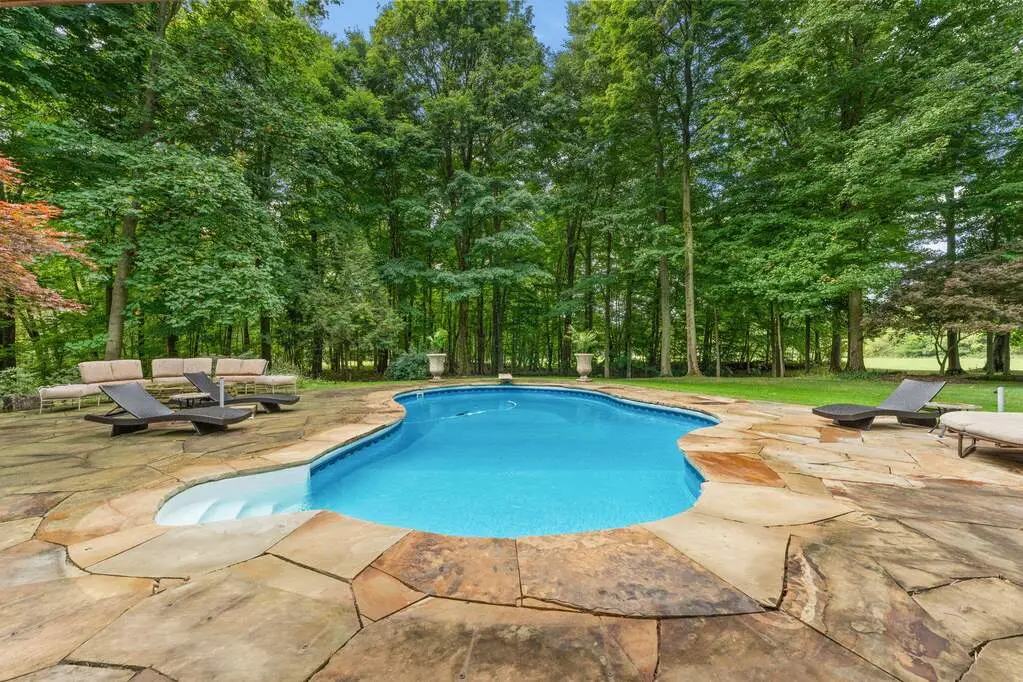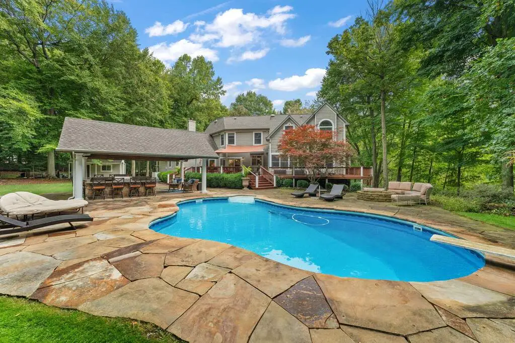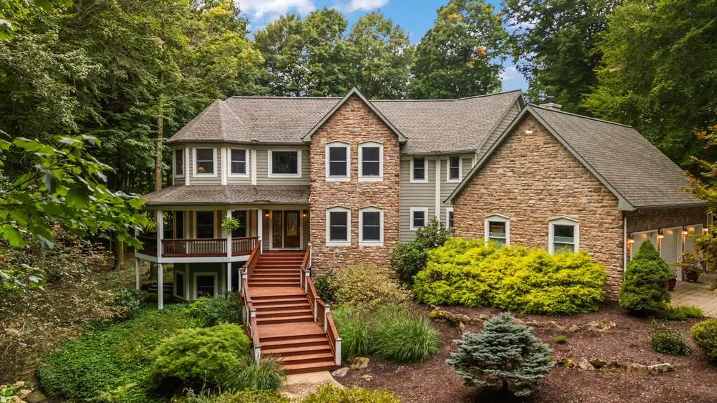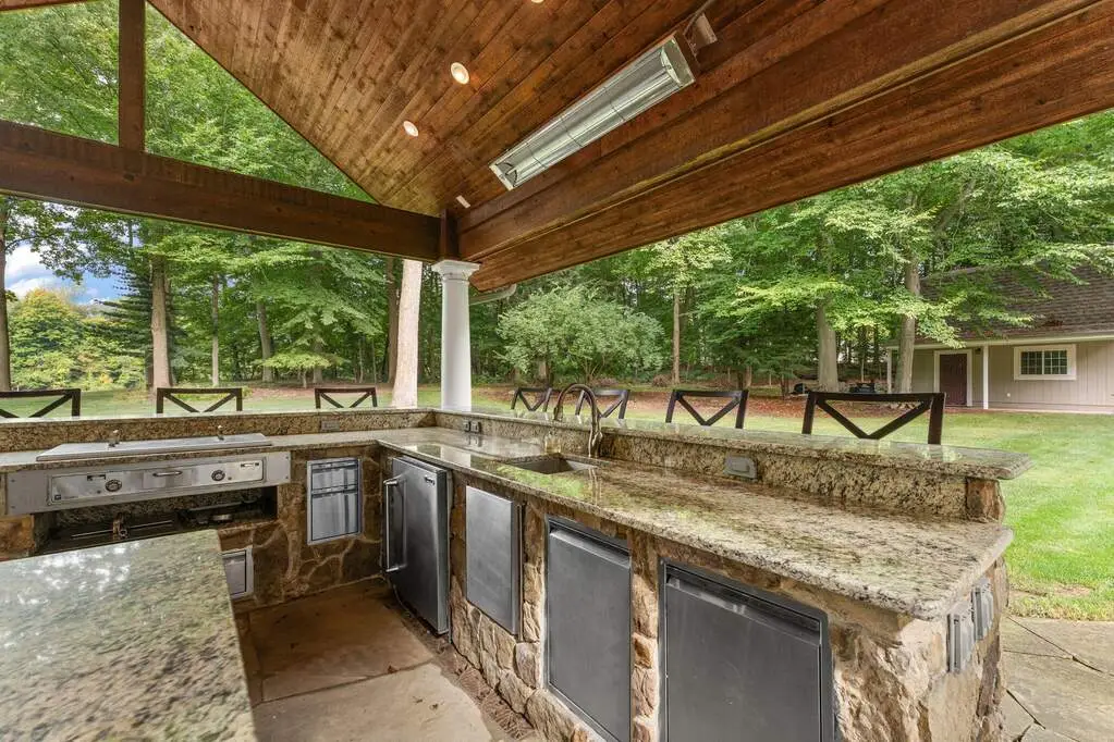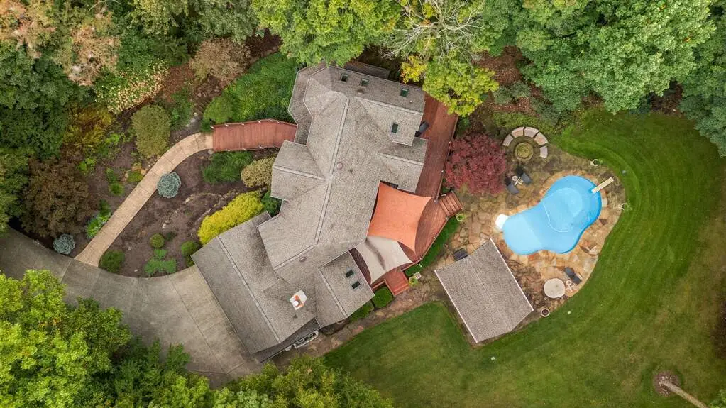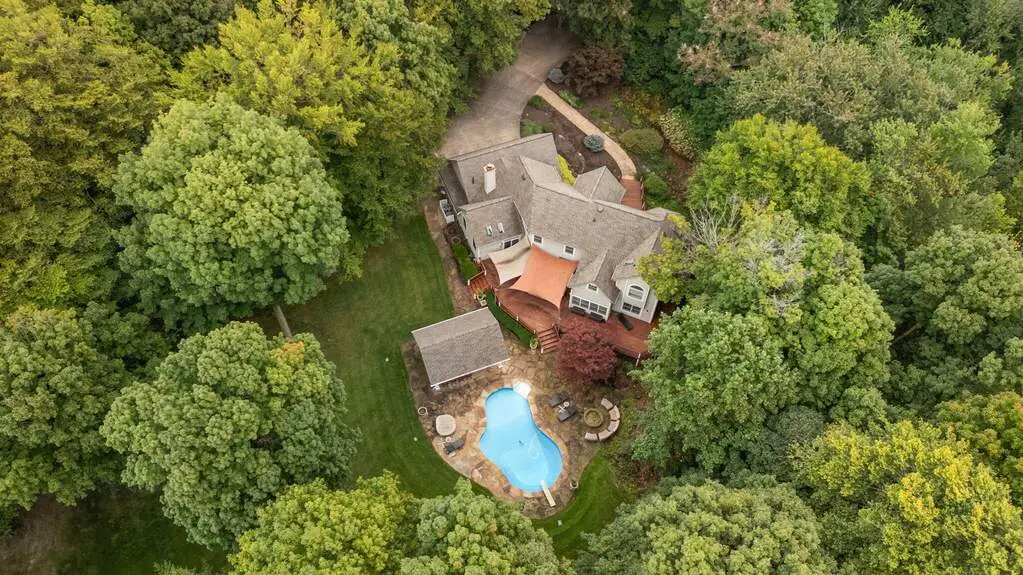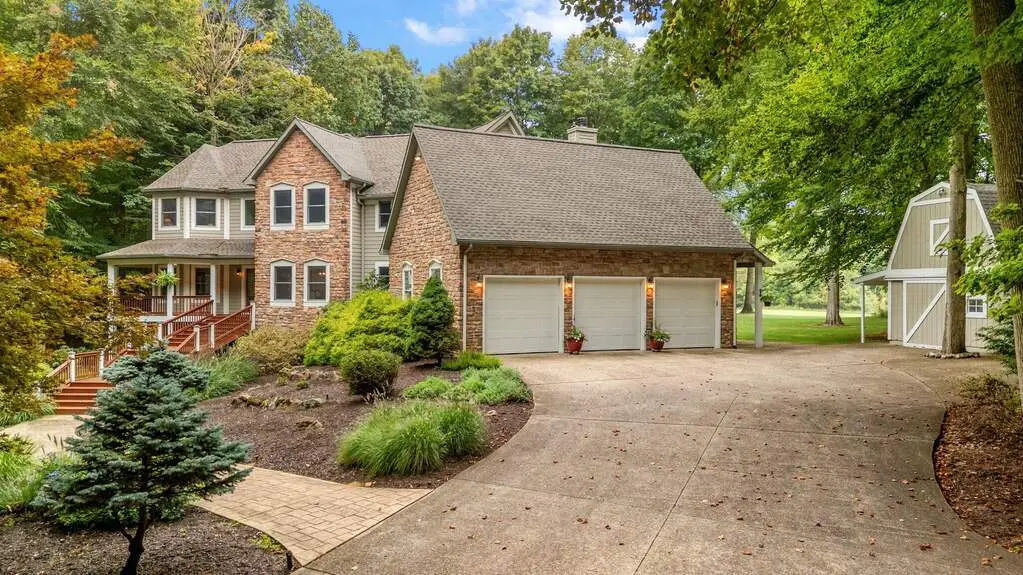 Nestled on six wooded acres, this stunning 5-bedroom, 3.5-bath home offers 4,500 sq. ft. of refined living space and exceptional privacy via a long, 800-foot winding driveway. Meticulously maintained since it was built in 2000, the home features a massive primary suite with a spa-like bathroom and an incredible walk-in closet. The kitchen offers ample counter space, high-end appliances, and a separate wet bar with beverage refrigerator, all flowing seamlessly into the main living areas. A spacious walk-out basement includes a bedroom, full bathroom, and a large entertainment area with a second wet bar--perfect for hosting. In addition, the basement offers over 900 sq. ft. of unfinished space, ideal for storage. The stone and cedar exterior complements the professionally landscaped and fully irrigated yard, surrounded by mature forest, creating a serene and picturesque setting. The oversized, heated 3-car garage offers year-round comfort and ample storage. Outdoor living is a true highlight, featuring a heated in-ground pool surrounded by an expansive stone patio, a gas fire pit, and a vaulted pavilion. The pavilion includes a full outdoor kitchen with granite countertops, a large grill, surface cooktop, beverage refrigerator, two burners, ceiling-mounted electric heaters, and is wired for TVs and a sound system. A separate barn provides two bays and attic storage, offering flexible space for hobbies, equipment, or a workshop. The property is equipped with a full-home Generac generator for peace of mind. Recent updates include two new HVAC systems (2022) and a new roof (2024) on the home, pavilion, and barn. An additional 15+ acres are available to expand the property. Please see MLS number 828377 for information regarding this exceptional property.