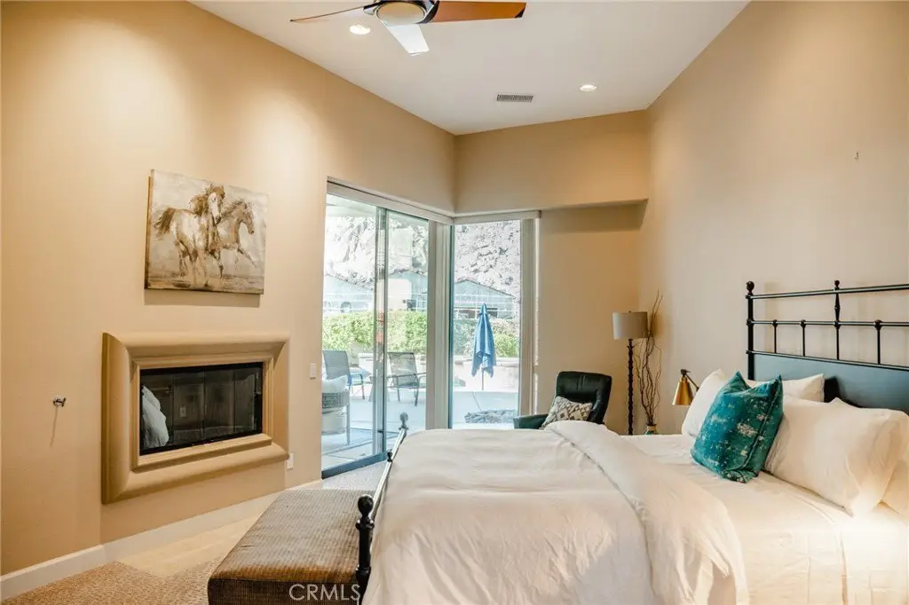 Experience the epitome of luxury living with unparalleled views and a prime location in the esteemed Point Happy Estates of La Quinta. This FULLY FURNISHED TURN KEY retreat is nestled against the majestic mountains in a tranquil neighborhood, this rare opportunity offers a secluded retreat within walking distance to exquisite dining, shopping, and coffee shops. Perfectly positioned for outdoor enthusiasts, it's just minutes away from exceptional hiking trails. Step inside to discover a home adorned with exquisite upgrades, including a Thermidor gas range, built-in stainless steel refrigerator, and luxurious travertine tile floors complemented by lofty 12' ceilings. Recent upgrades include a new 2-zone A/C system, garage A/C, patio misters, and a retractable awning, ensuring comfort and convenience year-round. Wake up to breathtaking mountain vistas from your primary suite, complete with a cozy fireplace for added ambiance. Indulge in the spa-like primary bathroom featuring a walk-in shower and spacious dual sinks. Two additional generously sized guest bedrooms offer private en-suite bathrooms, providing the perfect accommodations for visitors. Entertain in style in the open-concept living room, seamlessly flowing onto the poolside patio, where the awe-inspiring mountain views serve as a stunning backdrop. Enjoy the serenity of your own private oasis amidst meticulously manicured grounds on an oversized lot. Discover the ultimate blend of luxury, comfort, and natural beauty in this extraordinary La Quinta retreat.