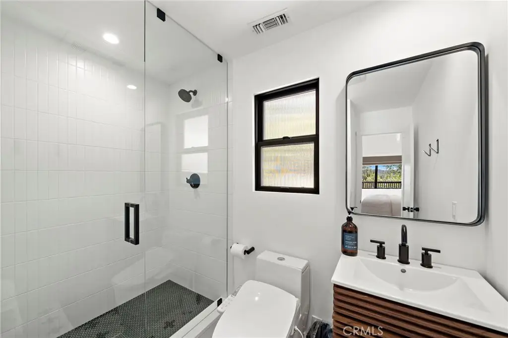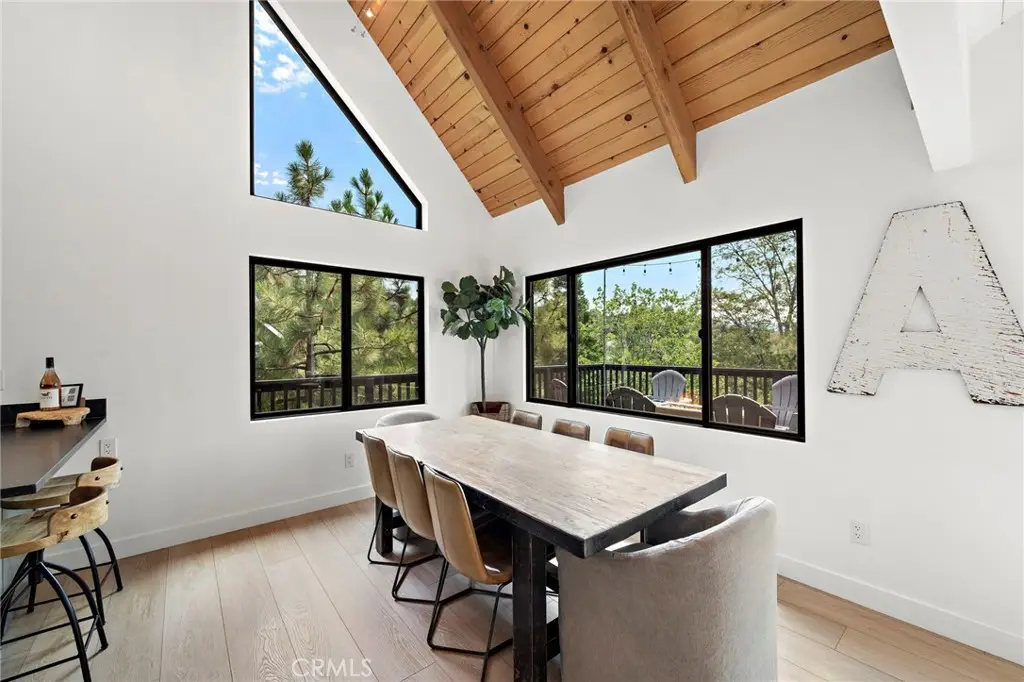 This stunning 4-bedroom, 3.5-bath mountain retreat combines modern upgrades with timeless lodge-style charm, offering captivating lake views from nearly every window. Thoughtfully remodeled in 2020-2021, the home features a bright open floor plan perfect for both comfort and entertaining. The main level showcases a dramatic great room with vaulted ceilings, expansive windows, recessed lighting, and a cozy gas fireplace that opens to a large entertainer's deck. The remodeled kitchen is a chef's dream with stainless steel appliances including a refrigerator, shaker-style cabinetry, pantry with pullout shelves, granite counters, peninsula with seating, and large windows framing the view. Two primary suites with spa-inspired baths--one on the main level and another on the lower level--provide privacy and flexibility, while two additional bedrooms and a spacious family room with a second fireplace and walk-out access to the lower deck with a swinging bench create the perfect retreat for family and guests. Outdoor living shines with two expansive decks crafted in durable Trek decking, ideal for gatherings, dining, or simply enjoying the mountain air and lake views. Additional highlights include dual HVAC and A/C systems with split thermostats, vinyl flooring throughout, inside laundry with washer and dryer, a finished pull-through two-car garage with automatic doors on both sides, and ample guest parking. Sold mostly furnished for a true move-in ready experience, this home is ideally located just above the trails of North Bay Cove with lake rights, peaceful morning walks, sunset strolls, and easy access off Bay Road with level parking. Just minutes from Blue Jay and Lake Arrowhead Village shops and dining, this exceptional property offers the perfect blend of modern amenities, mountain appeal, and lake lifestyle--whether as a primary residence, weekend escape.