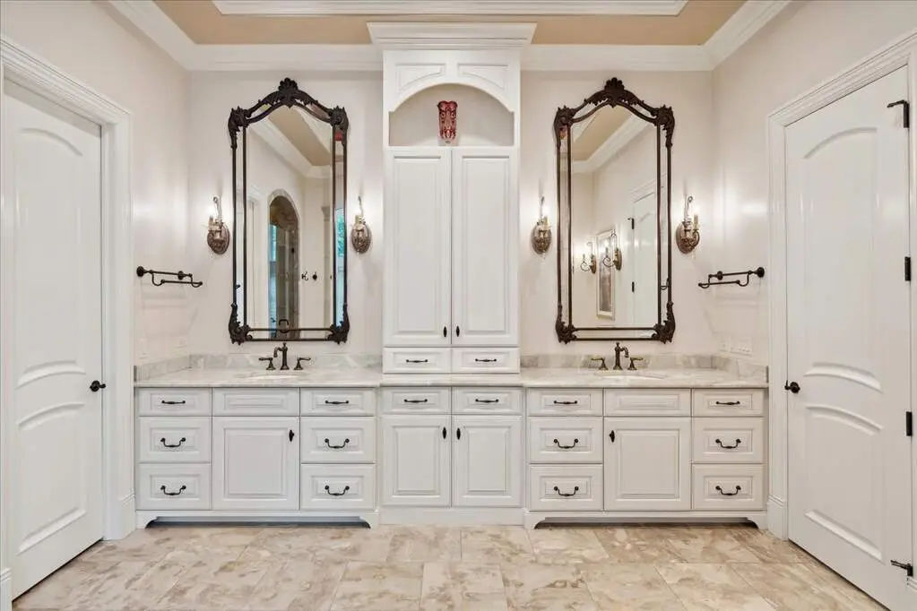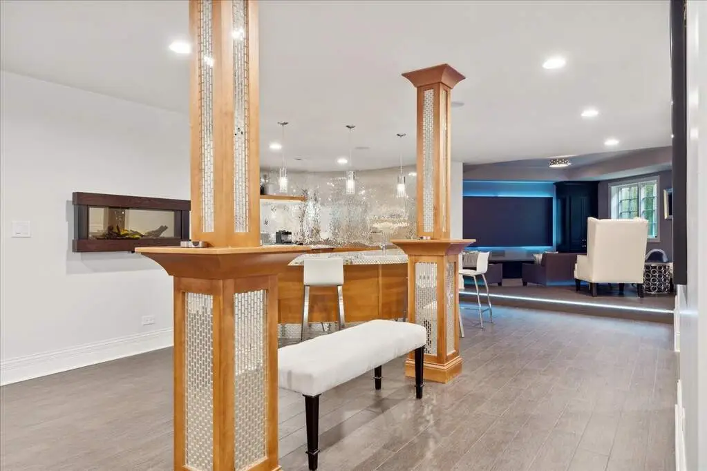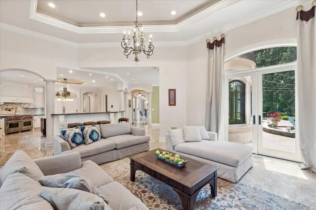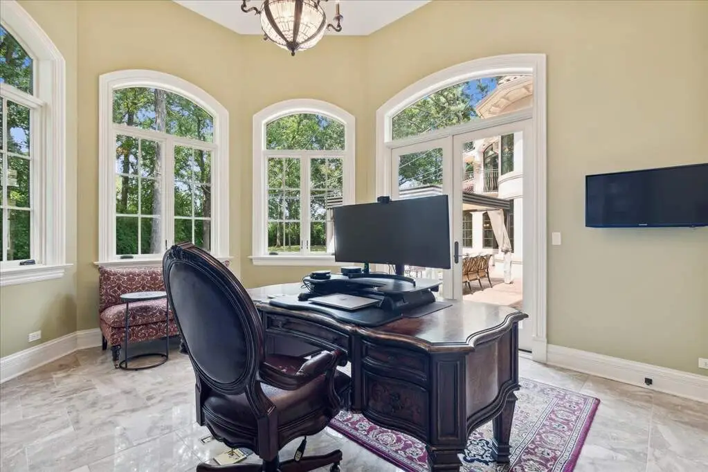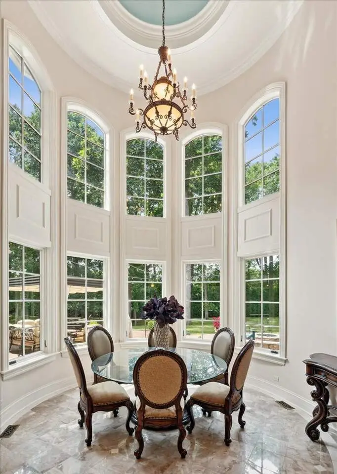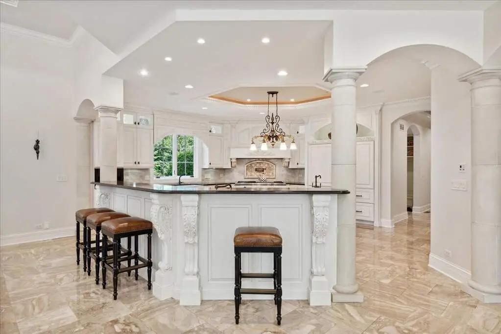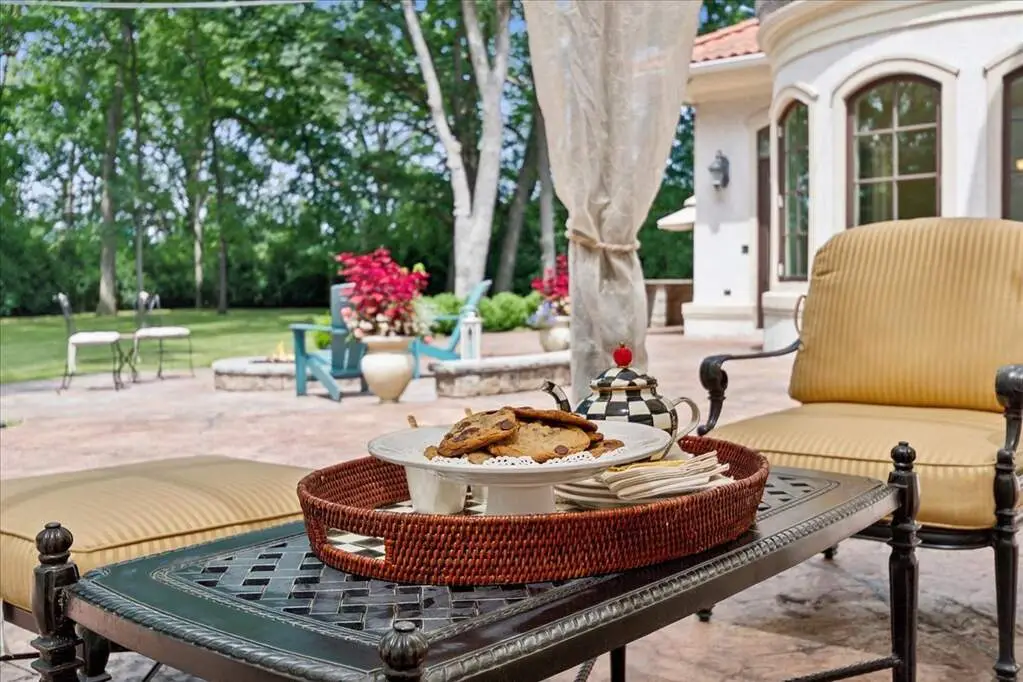 This exceptional 5,700 SF Mediterranean-style villa, crafted with stucco and stone and crowned with a clay tile roof, was meticulously designed and built by the current owners in 2012. The home boasts soaring ceilings and expansive windows that frame views of the beautifully manicured grounds and gardens. Distinctive architectural details and millwork enhance its elegance, while heated marble floors throughout add a touch of luxury. Guests are welcomed into a grand foyer that overlooks a two-story living room featuring a coffered ceiling, a stone fireplace, and three sets of glass doors leading to the patio. The formal dining room, with its stunning domed ceiling and adjacent bar area, is perfect for entertaining. The chef's kitchen, complete with a breakfast room, showcases granite and Taj Mahal quartzite countertops, a spacious breakfast bar with seating for four, two walk-in pantries, a Wolf double oven with a six-burner stove, oversized Subzero refrigerator with freezer and frig drawers, and two Miele dishwashers. This space flows seamlessly into the family room, which opens to an outdoor patio equipped with a built-in grill, serving space, and a gas-start fire pit, all overlooking the meticulously landscaped 1.63-acre property. The first-floor primary suite is a retreat in itself, featuring a tray ceiling, two custom-designed walk-in closets, built-in cabinetry, and an opulent bath with a unique copper-pounded tub, a separate shower, a double vanity, and an adjacent private office. A wrought iron bridal staircase leads to the upper level, where you'll find four large bedrooms, four luxurious bathrooms, plus a spacious loft. The English basement exceeds expectations with its deep window wells allowing natural sunlight to illuminate the space. This extraordinary level includes a fitness room with five lockers, a sauna and steam shower, a game room with a billiard area, a dance floor with a disco ball, a fully equipped wet bar with a mirrored backsplash, a wine beverage center, and a theater room. Exceptional in every way-this home is a must-see!