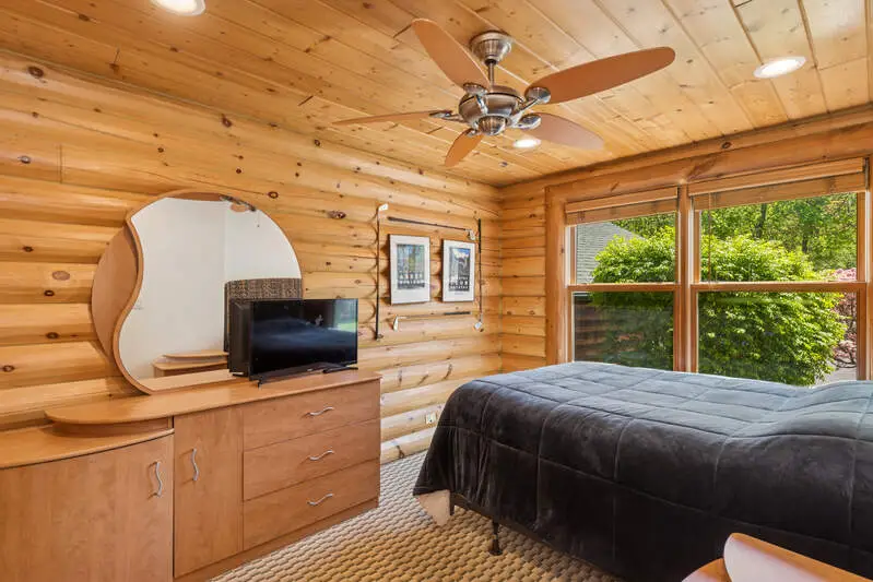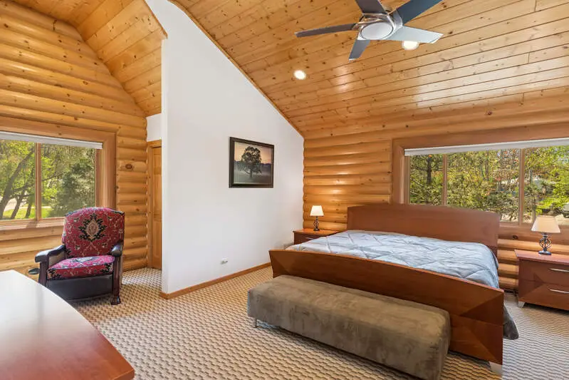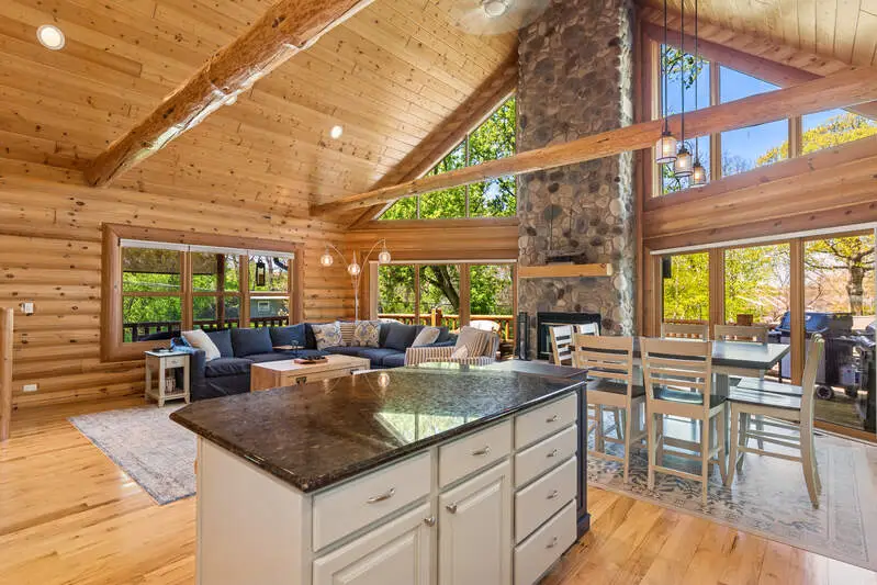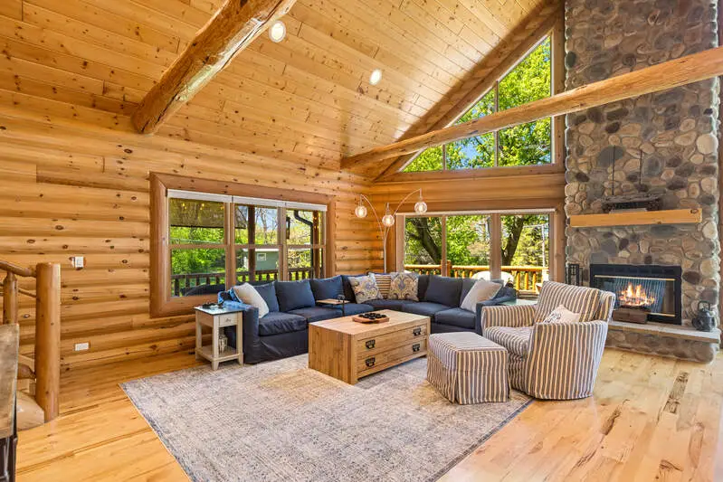 Discover refined luxury in this exceptional log home, nestled in the sought-after Lake Geneva Beach Association community with exclusive lake access. Perfectly designed for upscale living and effortless entertaining. This beautifully crafted retreat offers the ideal balance of sophistication, comfort, and outdoor adventure. The expansive open-concept features rich wood finishes, soaring ceilings, and panoramic views that bring the outdoors in. Downstairs, a spacious rec room provides a versatile area for games, movies, or quiet family time. Step outside to enjoy the beautifully landscaped grounds with a built-in firepit. Offering swimming and boating access, this home is your family's getaway to lakeside luxury.