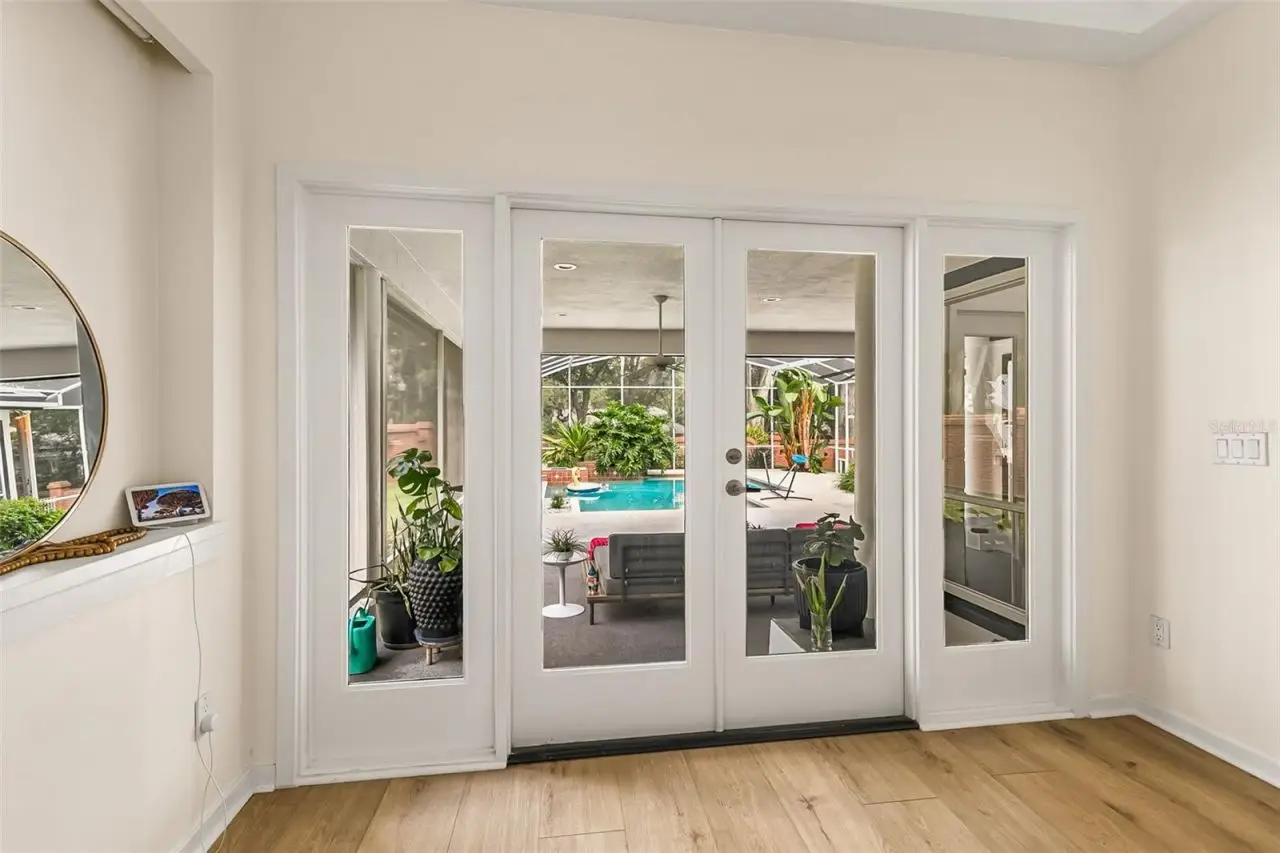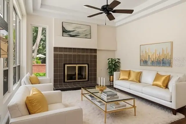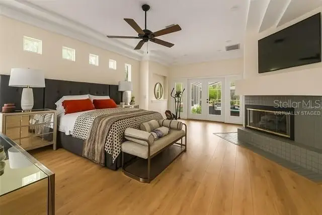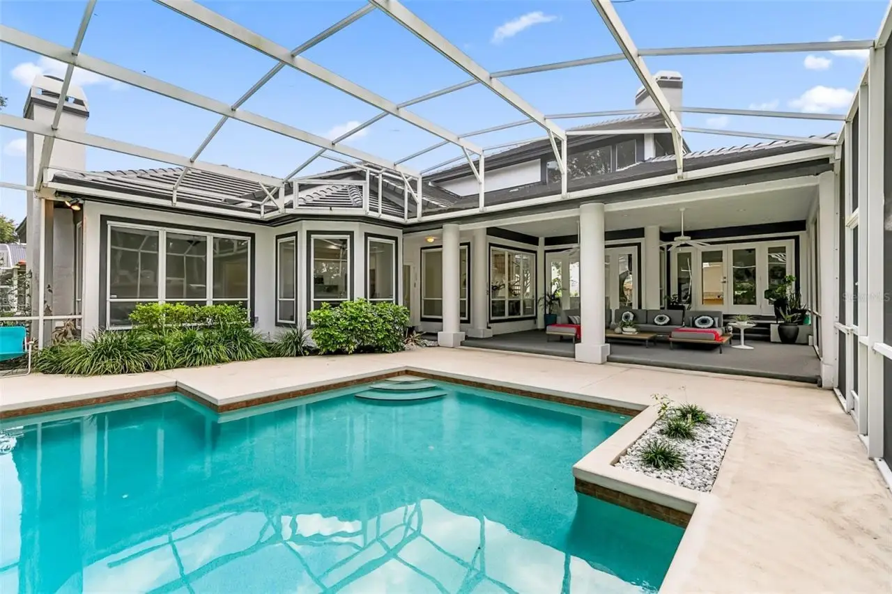 One or more photo(s) has been virtually staged. Experience refined living in Regency Green at Heathrow, one of Central Florida's most prestigious gated golf communities. This distinguished 3-bedroom, 2.5-bath residence with an upstairs bonus room showcases soaring ceilings, rich hardwood floors, and a thoughtfully designed split floor plan. The elegant primary suite offers a cozy fireplace, private lanai access, and a spa-inspired bath with dual vanities, soaking tub, walk-in shower, and expansive closet. A chef's kitchen with crisp white cabinetry flows seamlessly into the inviting family room with fireplace, while a sophisticated bar area off the foyer enhances the home's entertaining appeal. Recently painted inside and out and featuring a brand-new tile roof, this home is move-in ready with timeless style. Outdoors, the screened lanai frames a sparkling pool and a beautifully fenced yard with brick and wrought iron details, creating both charm and privacy. With three fireplaces and an enviable location just minutes from Heathrow Country Club, fine dining, and upscale shopping, this residence offers a rare opportunity to own in one of the area's most coveted enclaves.