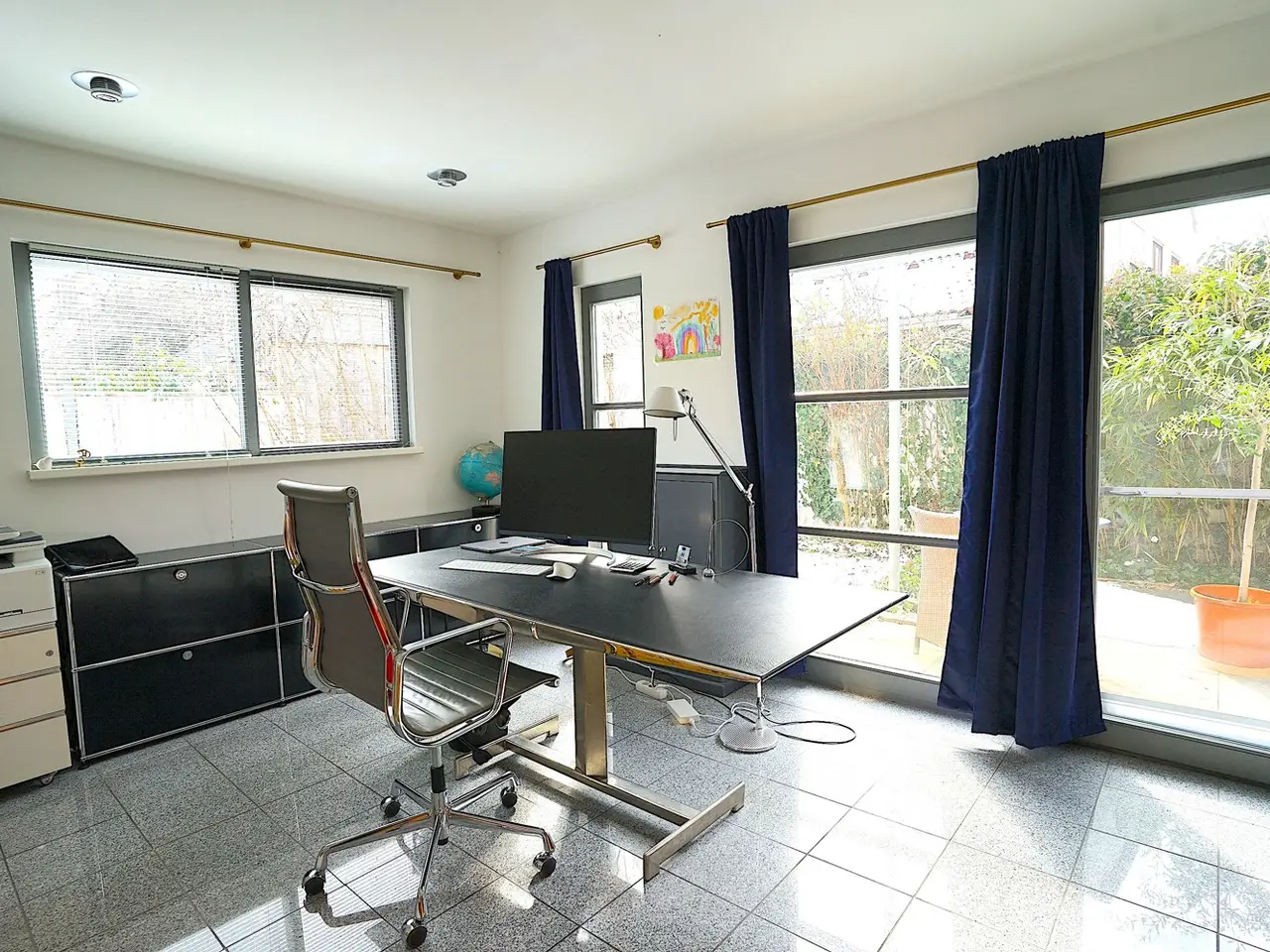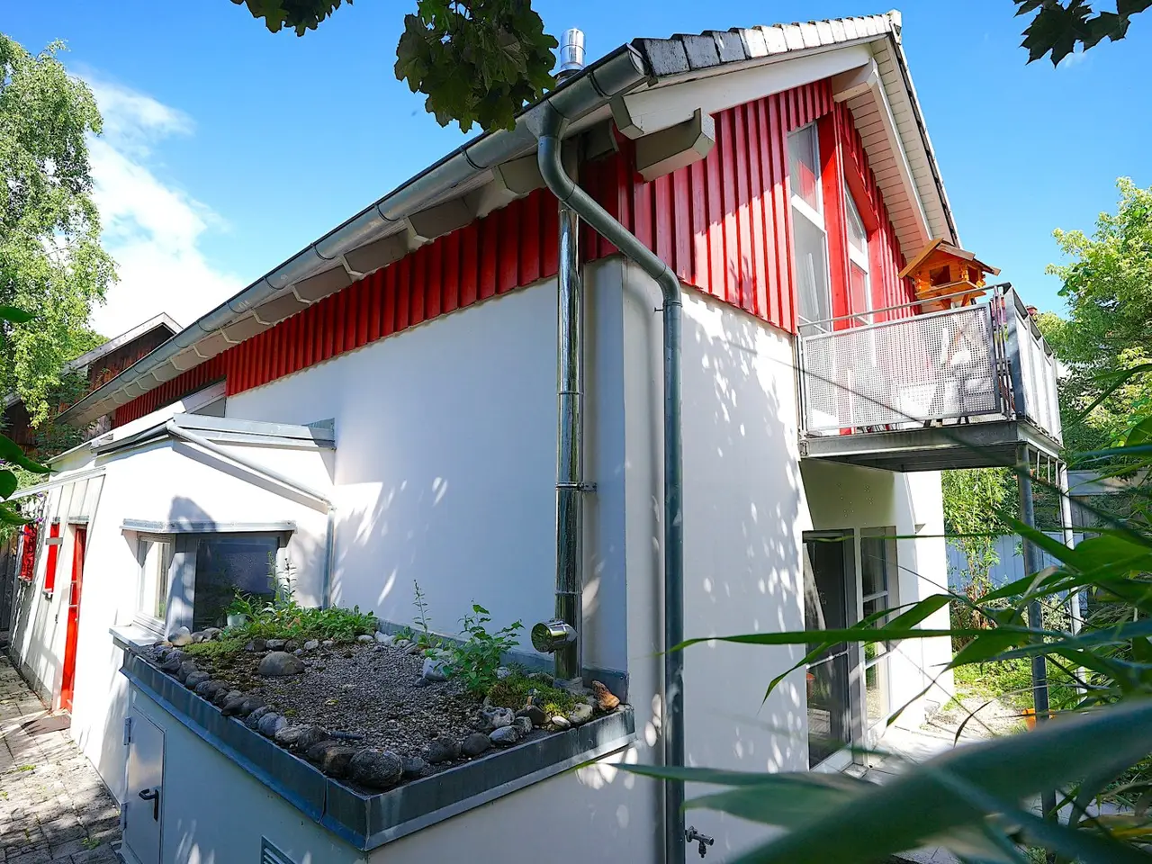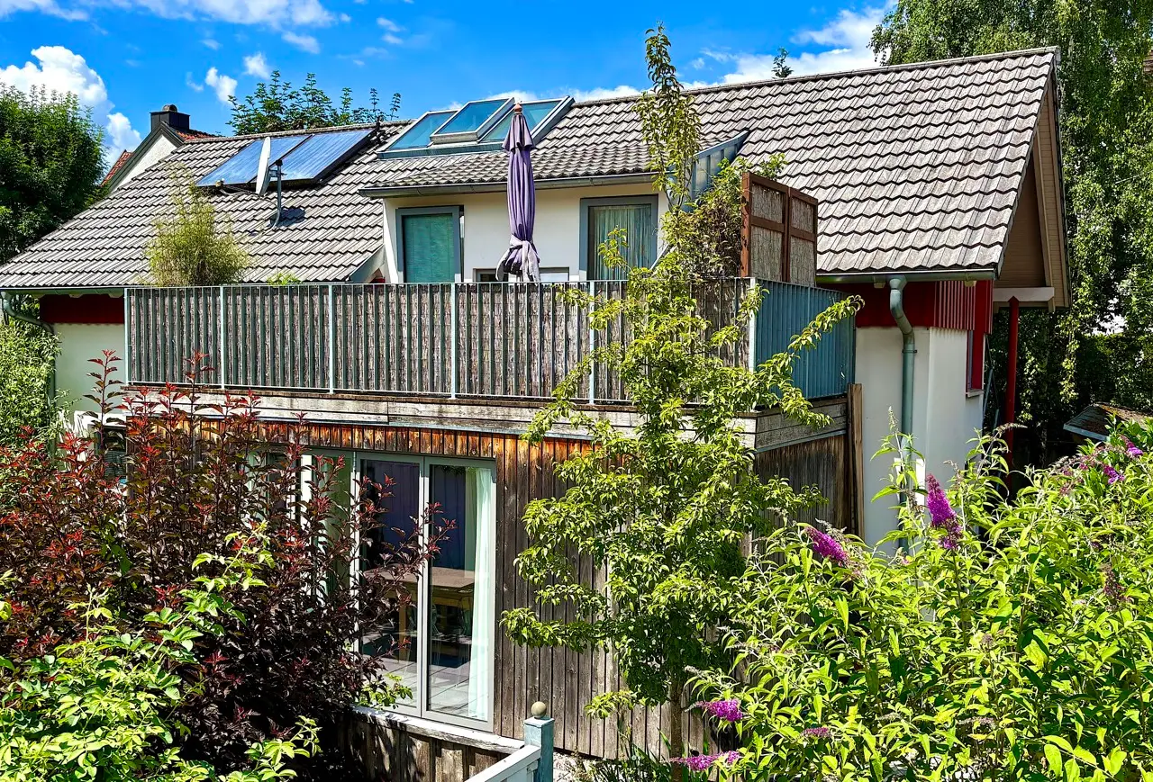 The energy-efficient house was built in 2005 in timber frame construction and extended in 2010 with an attractive living space and a roof terrace. With approx. 168 square meters of living space, there is enough room for one or two families. Thanks to the intelligent arrangement of the individual rooms, the house can be lived in entirely on the first floor in old age. The top floor apartment is accessed internally via the hallway, but can also be reached via the additional external staircase. This means that both residential units can be used independently. On the first floor, there are two connected living rooms and two bedrooms/study rooms. The spacious entrance area has room for a checkroom as well as a washing machine and dryer. Straight ahead is the very bright living/dining room with an open kitchen and another living room with a conservatory. The bedroom on the east side is quiet and protected from the sun. The bathroom has a double washbasin, WC, bath and shower. From both living rooms, you can access the south-facing terrace, which can also be extended to the west side if required. From the study, you also have direct access to the beautiful west-facing terrace. On the upper floor there is a spacious and bright living room with a west-facing balcony and two bedrooms, both with direct access to the roof terrace. The upper floor also has a practically equipped kitchen, a hallway with storage niche and a bathroom with bathtub and towel radiator. The low-maintenance and barely visible garden offers both sufficient space and enough design options to enjoy sunny days barbecuing with friends or relaxing. The largely enclosed carport has light, a power connection and an electric roller shutter. One or two additional vehicles can be parked in the area in front of the carport. The purchase price includes both kitchens, two outdoor sheds, the bathroom furniture, the carport and the outdoor parking space, with a total new value of around € 55,000. The house will impress you with its high-quality fittings and low consumption costs. You have been looking for such an exciting town house with flexible usage options for a long time. If you are interested, we look forward to hearing from you.