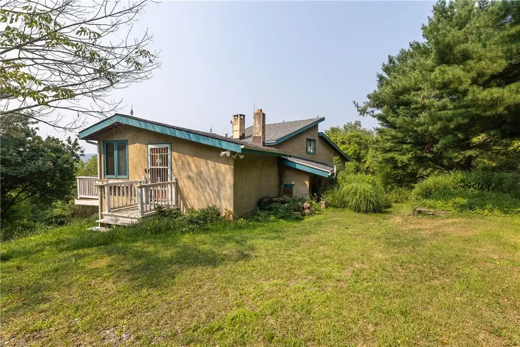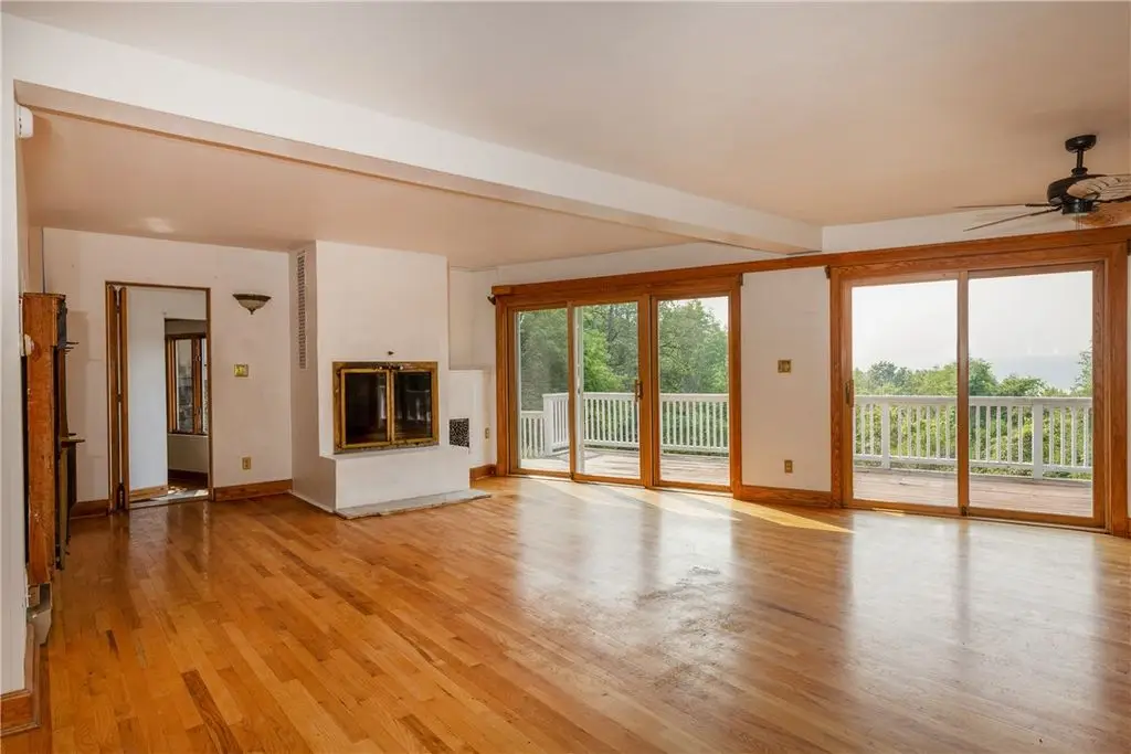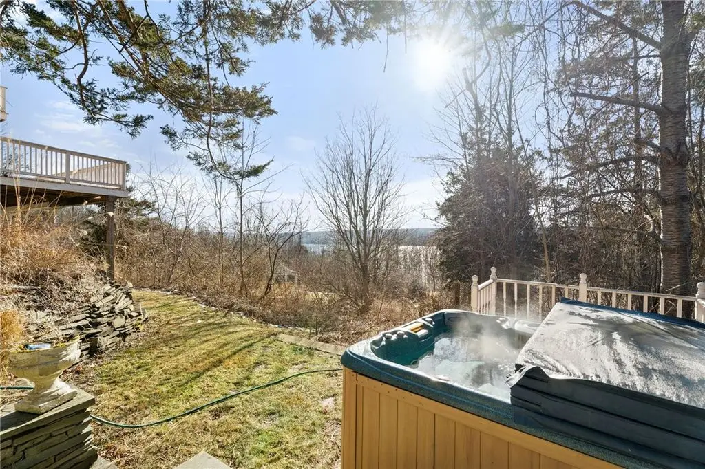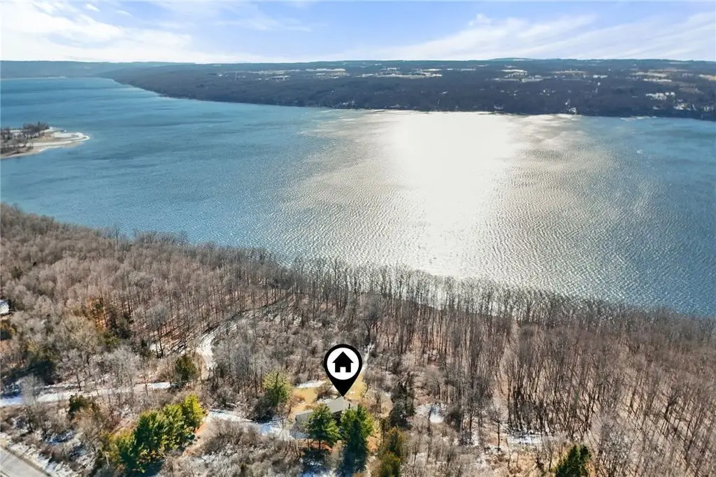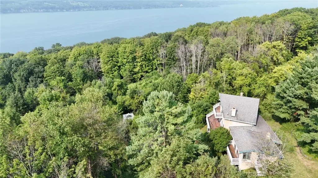 Perched on 1.82 acres with stunning views of Cayuga Lake, this 4-bedroom, 4-bath contemporary home offers space, versatility, and breathtaking scenery. The open-concept main living area features a spacious living/dining room and kitchen, anchored by a cozy wood-burning fireplace and opening to an expansive deck overlooking the lake. Gleaming hardwood floors flow throughout, leading to two distinct private bedroom suites one with a wood stove, full bath, and office space, and the other with its own bath and loft. The lower level offers even more possibilities with a generous walk-out living area, kitchenette, full bath, and gas fireplace. Sliding glass doors open to a separate studio space complete with another full bath ideal for guests, an office, or creative pursuits. Recent updates include a new forced-air furnace. Outside, multiple decks and patios provide the perfect spots to take in the views, while a private hot tub offers the ultimate place to relax and unwind.