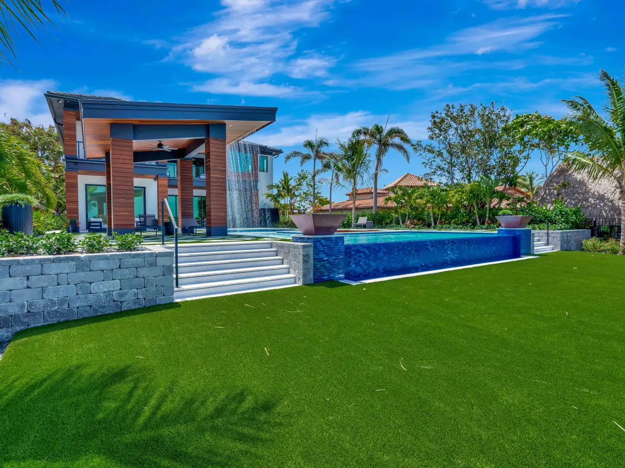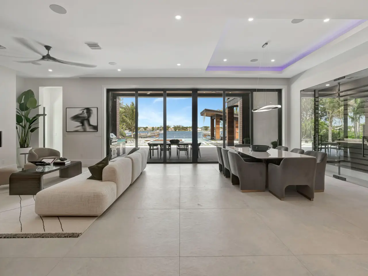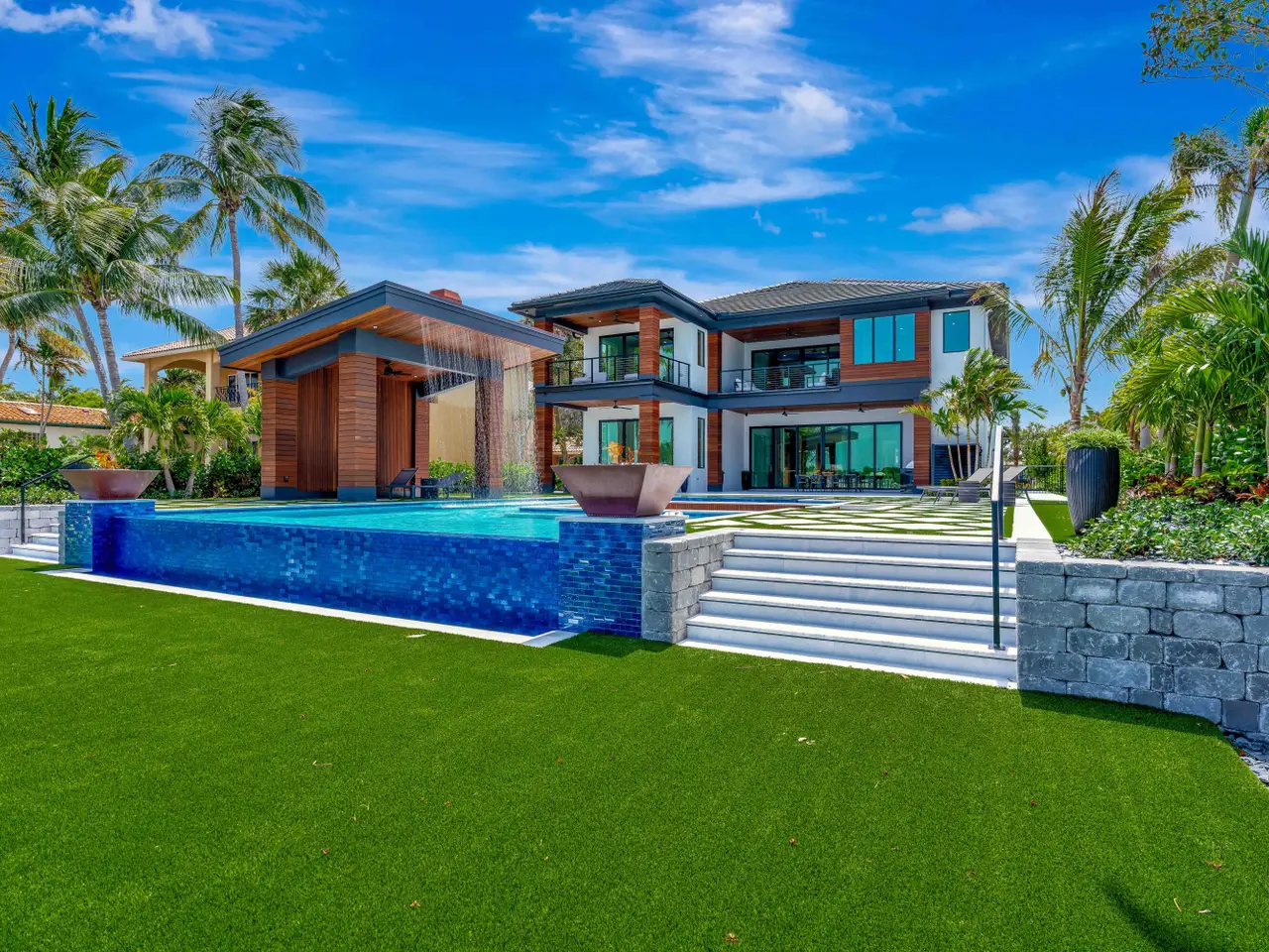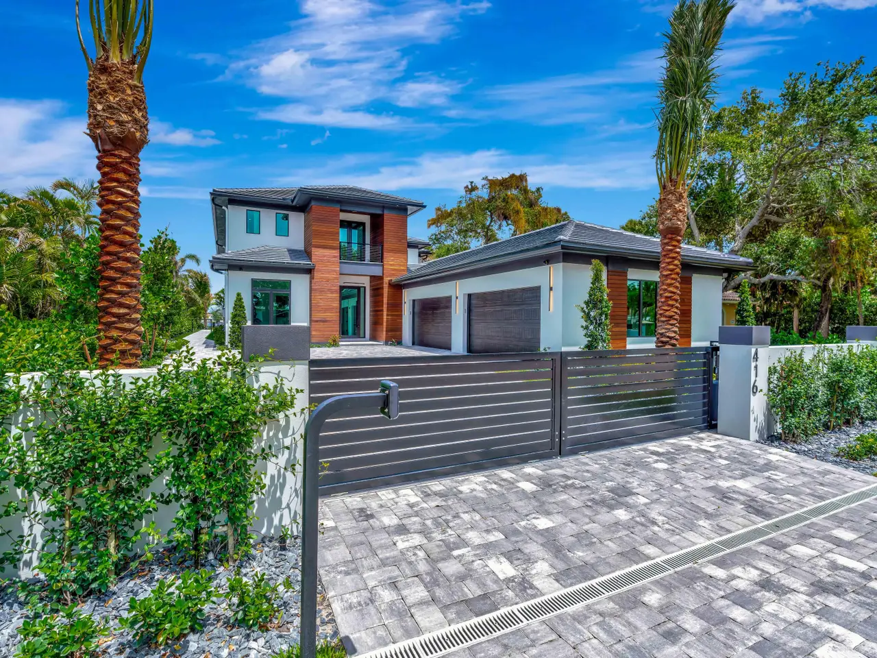 Brand-new gated intracoastal estate in prime Lantana location! Walk to the beach, Eau Resort & Spa, and top dining spots. Just 1.5 mi to I-95, minutes to PBI & private jet access. This smart, energy-efficient compound offers ultimate privacy with unobstructed water views, upstairs/downstairs living rooms & master suites. Loaded with upgrades: Sonos, security, landscape lighting. Backyard is a showstopper--$500K+ resort-style pool, sunken firepit, waterfall gazebo w/ 10 stools, and multiple fire features. Luxury living at its finest!