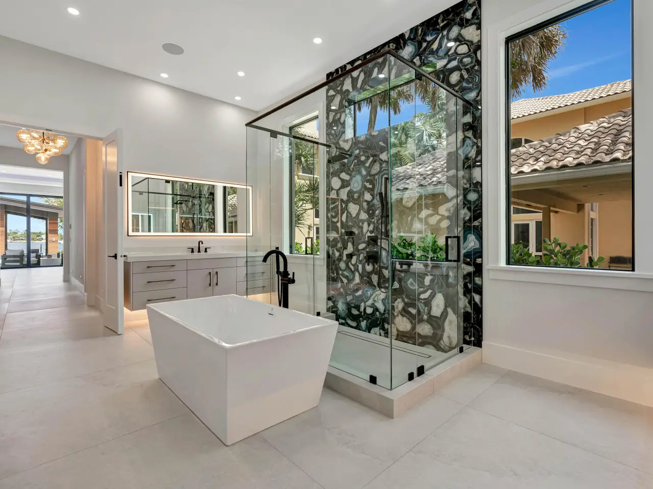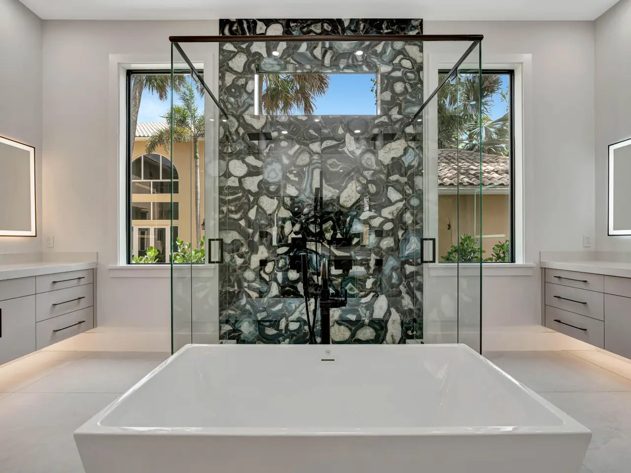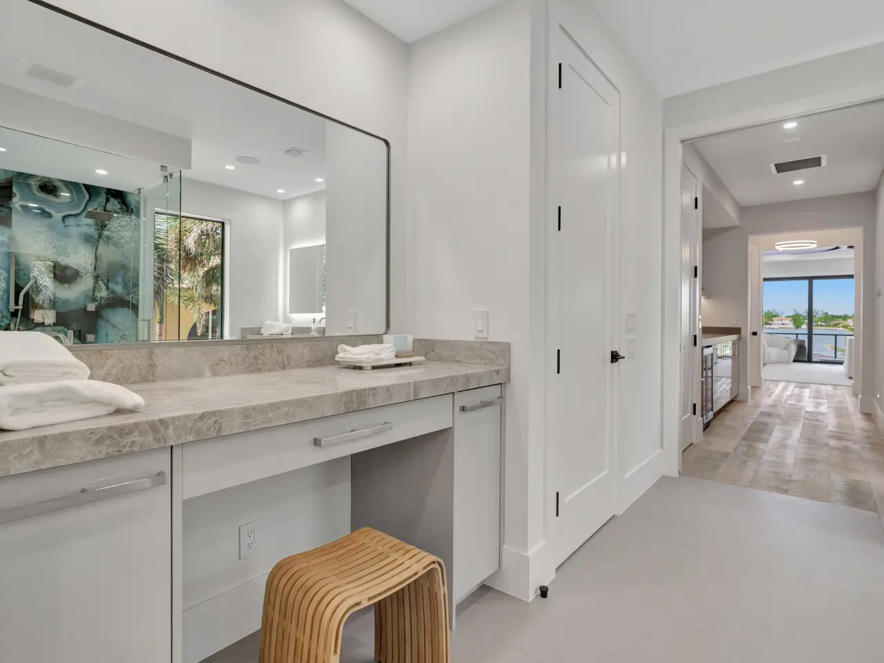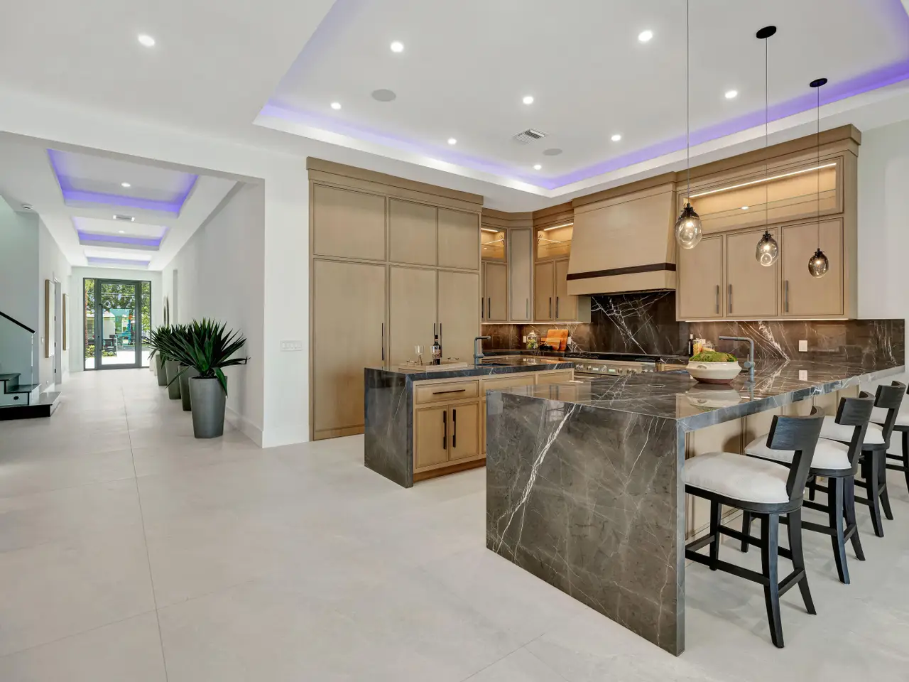 Brand-new gated intracoastal estate in prime Lantana location! Walk to the beach, Eau Resort & Spa, and top dining spots. Just 1.5 mi to I-95, minutes to PBI & private jet access. This smart, energy-efficient compound offers ultimate privacy with unobstructed water views, upstairs/downstairs living rooms & master suites. Loaded with upgrades: Sonos, security, landscape lighting. Backyard is a showstopper--$500K+ resort-style pool, sunken firepit, waterfall gazebo w/ 10 stools, and multiple fire features. Luxury living at its finest!