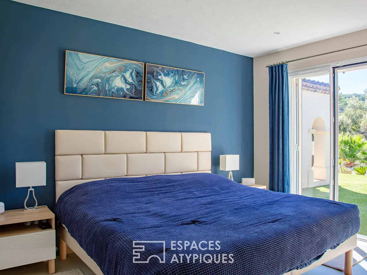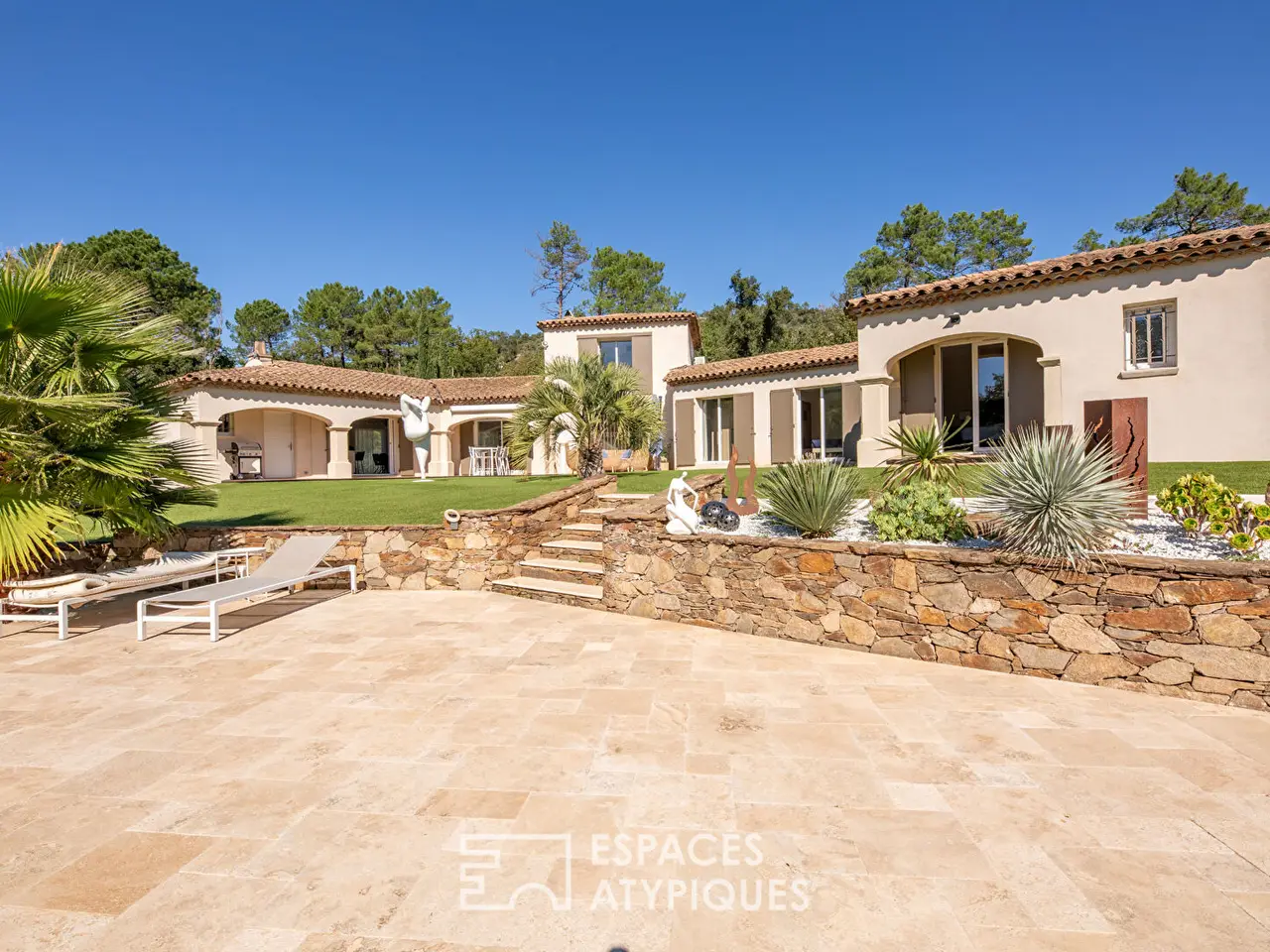 Villa in its green setting and its xxl swimming pool Located in a prestigious and secure estate in the commune of Le Muy, this exceptional property, completely renovated, extends over 11,540 m2 of fenced land in a natural area. Nestled in a green setting, it benefits from a peaceful and authentic environment, enhanced by Mediterranean species such as oaks, palm trees, fig trees, pines, olive trees, rosemary and mimosas. This idyllic setting, where an atmosphere of serenity reigns, makes this property a true haven of peace, in perfect harmony with the surrounding nature. The main house, with a surface area of approximately 120 m2, is spread over two levels, benefiting from a South/South-West exposure that floods the spaces with natural light. The entrance, on the garden level, leads to a spacious cathedral living room with insert fireplace which extends into a dining room and a modern open kitchen fully equipped with central island. A practical laundry room adjoining the kitchen is also accessible from the large composite wood terrace and completes this space. The ground floor also houses a large bedroom on one level, a dressing room (which can be converted into a second bedroom), as well as a shower room and guest toilet. Upstairs, an additional bedroom has its own bathroom with toilet, offering comfort and privacy. Adjoining the main house, an independent studio of approximately 20 m2 is perfectly designed to accommodate guests or serve as a work space, equipped with air conditioning and an elegant shower room with toilet. For guests or family, an independent air-conditioned apartment of 46m2 offers two bedrooms, a fitted and equipped kitchen, a shower room and separate toilet, ensuring everyone a private and comfortable space. The exterior is the real asset of this property with a luxuriously furnished pool house, equipped with a bioclimatic pergola, a complete summer kitchen and a concrete bar, all with a travertine floor for an extra touch of elegance. The 15 x 6 m swimming pool invites you to relax under the Cote d'Azur sun. A closed garage, accompanied by a storage space and an additional laundry room, as well as numerous parking spaces, complete the high-end services of this property. Security is ensured by a high-performance alarm system. Two boreholes supply the automatic watering, guaranteeing easy maintenance of the green spaces throughout the year, adding a touch of comfort and practicality to this exceptional property. This rare property is ideal for entertaining discreetly or considering a prestigious seasonal rental. Between tranquility, comfort and authenticity, it offers an exceptional opportunity for lovers of nature and tranquility, just a few minutes from all amenities. 10 min from essential shops 5 min from the motorway 13 min from the Arcs-Draguignan TGV station 20 min from Sainte-Maxime and its beaches ENERGY CLASS: C (163 kWh/m2/year) / CLIMATE CLASS: A (5 kg CO2/m2/year). Estimated average amount of annual energy expenditure for standard use, based on 2021 energy prices: between 1160 euros and 1630 euros. REF. 12416 Additional information * 6 rooms * 5 bedrooms * 1 bathroom * 3 shower rooms * 1 floor in the building * Outdoor space : 11540 SQM * Parking : 5 parking spaces * Property tax : 4 474 € Energy Performance Certificate Primary energy consumption c : 163 kWh/m2.year High performance housing
