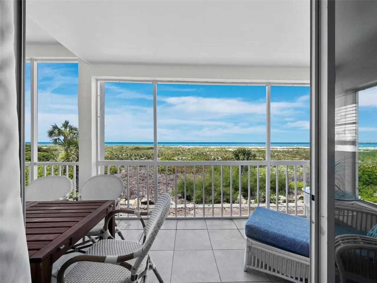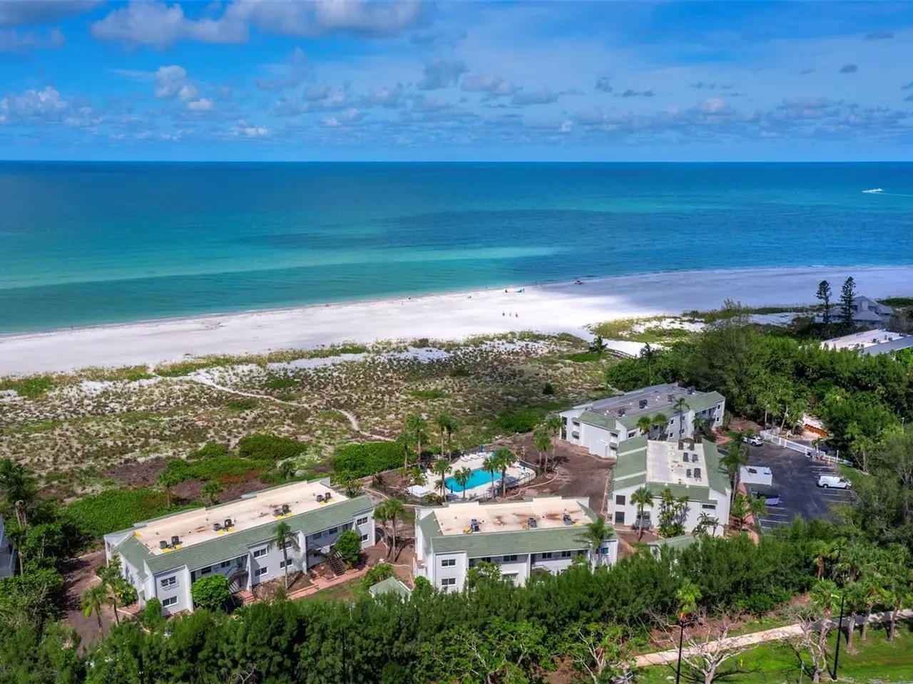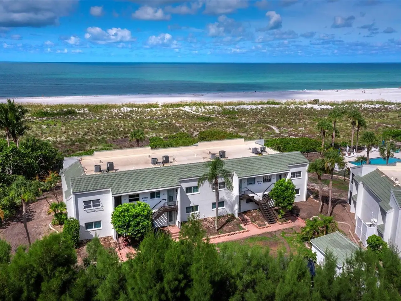 Experience elevated coastal living in this beautifully renovated, second-floor beachfront condominium, offering sweeping Gulf views and the tranquility that comes with a higher vantage point. Nestled within the intimate, gated community of Sea Pines on the serene north end of Longboat Key, this end-unit residence effortlessly blends updated sophistication with the soothing rhythm of the sea. This light and airy floor plan features two bedrooms, two full baths, and a flexible den that easily converts to a third sleeping area for guests. Designed with a relaxed, coastal aesthetic, the interior showcases neutral flooring and paint tones, stylish plumbing fixtures, updated lighting, plantation shutters, and solid surface countertops throughout. The kitchen is a true showpiece, offering Gulf views, modern cabinetry, sleek open shelving, shiplap accent walls, a statement tile backsplash, premium GE Cafe appliances, and a large pantry perfect for any home chef. The primary suite is a peaceful retreat with views of the Gulf and community pool, a generous walk-in closet, and a spa-style en-suite featuring a spacious walk-in shower. Step outside from either the living area or the primary suite onto a 26-foot screened lanai ideal for morning coffee, al fresco dining, or simply unwinding to the sound of waves and the sight of spectacular sunsets. The guest suite offers its own en-suite bath and large walk-in closet, providing comfort and privacy for visitors. A full-size, side-by-side washer and dryer add everyday convenience. Sea Pines is a boutique complex of just 28 residences, offering a relaxed and secure lifestyle with gated entry. Amenities include a heated pool with lounging and dining areas, a private beach access path, tropical landscaping, outdoor grilling stations, and a pet-friendly atmosphere with strong rental potential. Don't miss this rare opportunity.