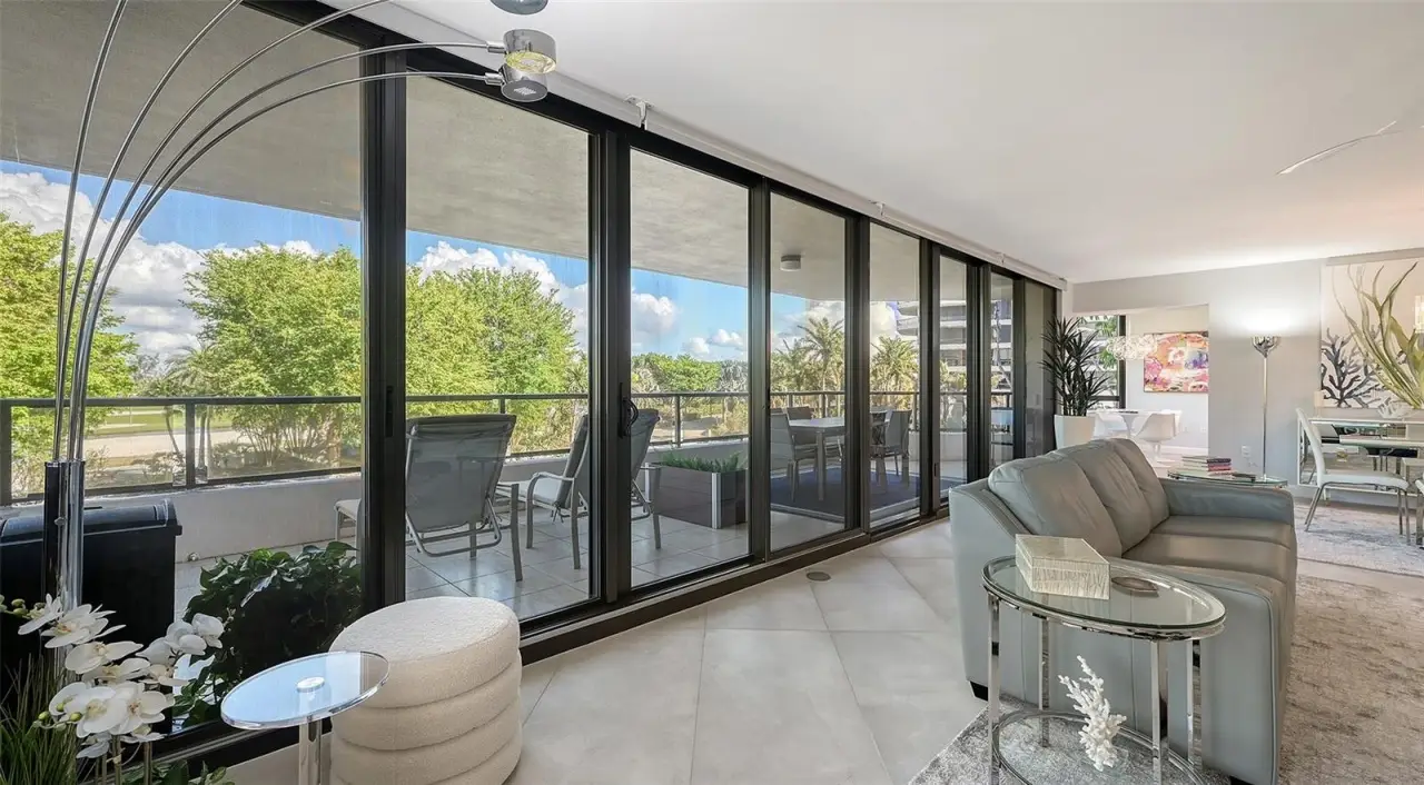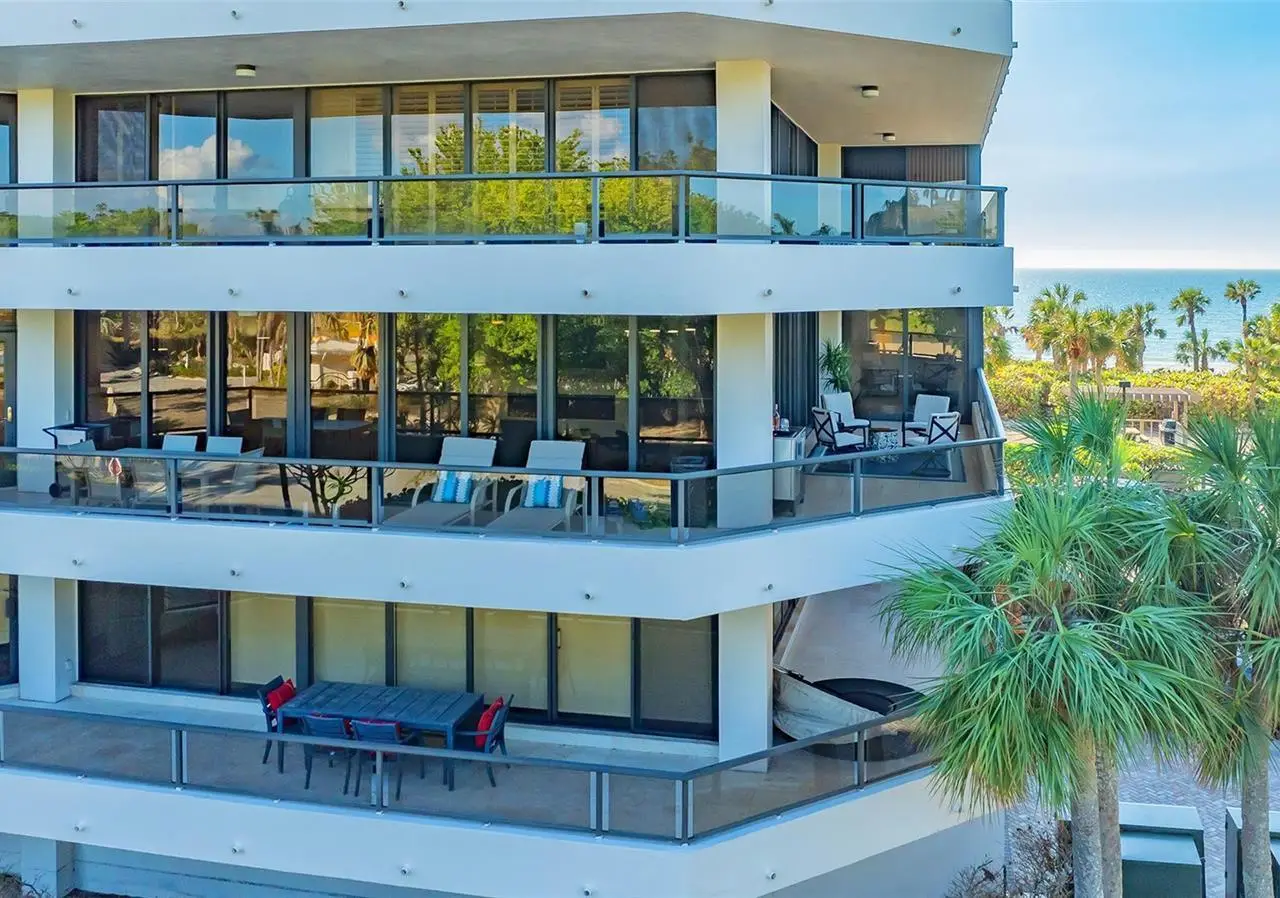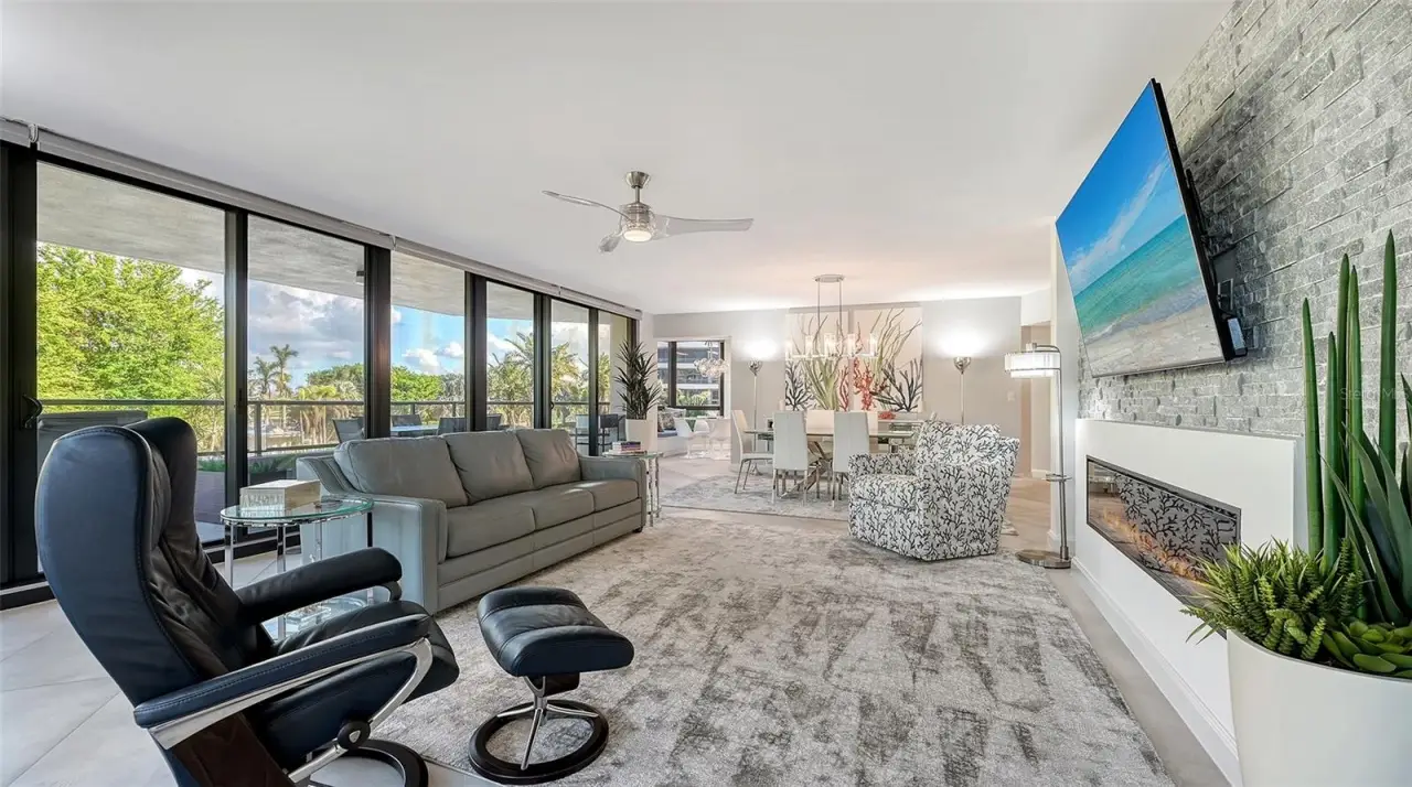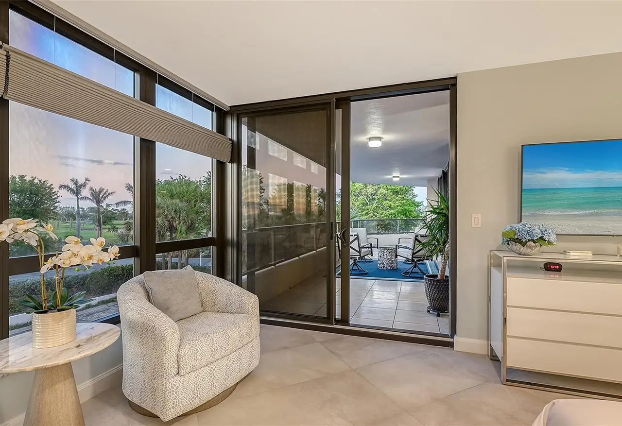 Experience the pinnacle of Gulf Coast living at The Sanctuary, nestled behind the gates of the prestigious Longboat Key Club and Resort on Longboat Key. This exquisitely remodeled three bedroom, three bath property offers a one-of-a-kind living experience with contemporary flair. Enjoy breathtaking, panoramic views of the Longboat Key Club golf course and the Gulf of Mexico from the expansive wrap-around terrace complete with updated tile and PGT impact sliding doors for added protection. The interior of this luxurious residence features neutral, large format porcelain tile floors throughout exuding a sleek, modern aesthetic. Solar screen window coverings are featured in the kitchen, living room, and 3rd bedroom while the primary and main guest bedroom enjoy the elegance of top-down, bottom-up remote controlled custom Roman shades. The expansive great room serves as the heart of the home, offering breathtaking views of the golf course and sunsets every evening. It features a striking 72-inch linear electric fireplace accompanied by a flat-screen TV mounted on a beautiful ledgestone accent wall. The room seamlessly incorporates a spacious dining and entertaining space to host large family get togethers to intimate parties! The chef's kitchen is a culinary dream featuring an integrated dinette area for casual dining and seamlessly blending style with functionality. It's equipped with high-end Monogram appliances, including a French door refrigerator with an internal water dispenser and a versatile freezer/refrigerator drawer. The Monogram oven boasts air fryer capabilities while the Advantium oven offers a range of cooking functions including microwave and convection options providing ultimate flexibility. Additional premium appliances include a Bosch dishwasher for quiet efficiency, a multi-temperature wine cooler to store your collection, and a JennAir induction cooktop for precise cooking control. This kitchen is designed to cater to both everyday meals and gourmet creations. The primary bedroom is a serene, spa-like retreat featuring stunning views of the Gulf and direct access to the expansive patio providing a seamless connection to the outdoors. The adjoining primary bathroom is designed for relaxation and luxury with custom two faucet, trough sink vanity, a separate 'dressing vanity area, a deep soaking tub, and floor-to-ceiling azure tile surrounding both the tub and the shower. This elegant design creates a soothing, indulgent environment perfect for unwinding and enjoying the tranquil atmosphere. The large custom walk-in closet has an abundance of storage & space. The second bedroom is equally stunning, offering picturesque views of the golf course. The ensuite high-end bath features dual vanities and a spacious walk-in shower adorned with wave-shaped tiles perfectly complementing the chic, beach-inspired design. The third bedroom is enjoyed also as a den. The clever seamless pocket doors create smart privacy & easy access to the 3rd bathroom for the ensuite experience but can quickly be transformed into a cozy bedroom offering both short and long-term guests a comfortable retreat. This unit has a separate garage entry and 2 'Townie' bikes to convey. Relax in the luxury and privacy of 24/7 gated security, heated pool/spa with cabanas, beach chaises and umbrellas, Fitness center, 4 Har-Tru tennis courts, Resident only clubhouse for social events or fun card games, it's all here... Perfection in Paradise, move-in ready.