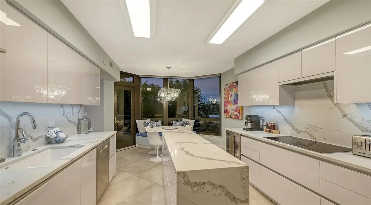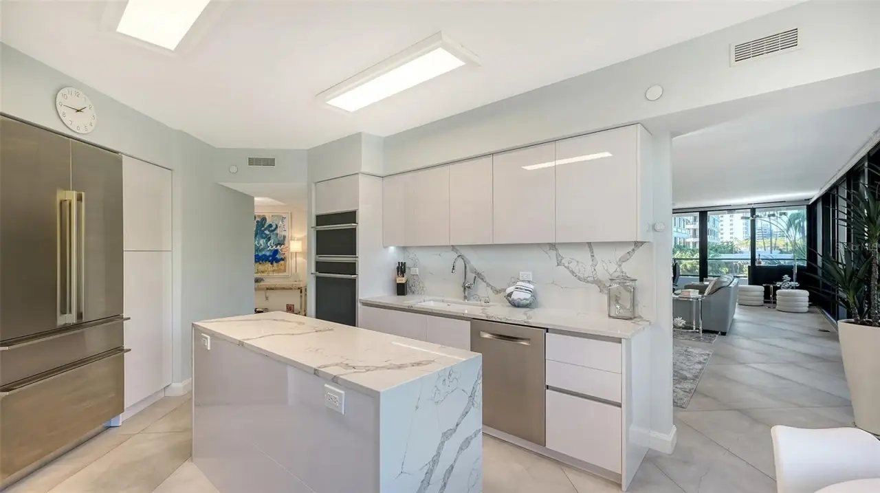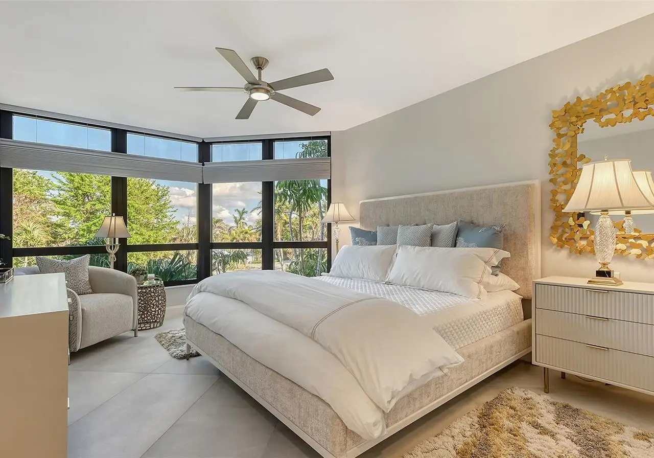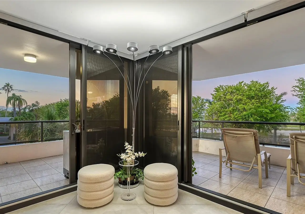 Experience the pinnacle of Gulf Coast living at The Sanctuary, nestled behind the gates of the prestigious Longboat Key Club and Resort on Longboat Key. This exquisitely remodeled three bedroom, three bath property offers a one-of-a-kind living experience with contemporary flair. Enjoy breathtaking, panoramic views of the Longboat Key Club golf course and the Gulf of Mexico from the expansive wrap-around terrace complete with updated tile and PGT impact sliding doors for added protection. The interior of this luxurious residence features neutral, large format porcelain tile floors throughout exuding a sleek, modern aesthetic. Solar screen window coverings are featured in the kitchen, living room, and 3rd bedroom while the primary and main guest bedroom enjoy the elegance of top-down, bottom-up remote controlled custom Roman shades. The expansive great room serves as the heart of the home, offering breathtaking views of the golf course and sunsets every evening. It features a striking 72-inch linear electric fireplace accompanied by a flat-screen TV mounted on a beautiful ledgestone accent wall. The room seamlessly incorporates a spacious dining and entertaining space to host large family get togethers to intimate parties! The chef's kitchen is a culinary dream featuring an integrated dinette area for casual dining and seamlessly blending style with functionality. It's equipped with high-end Monogram appliances, including a French door refrigerator with an internal water dispenser and a versatile freezer/refrigerator drawer. The Monogram oven boasts air fryer capabilities while the Advantium oven offers a range of cooking functions including microwave and convection options providing ultimate flexibility. Additional premium appliances include a Bosch dishwasher for quiet efficiency, a multi-temperature wine cooler to store your collection, and a JennAir induction cooktop for precise cooking control. This kitchen is designed to cater to both everyday meals and gourmet creations. The primary bedroom is a serene, spa-like retreat featuring stunning views of the Gulf and direct access to the expansive patio providing a seamless connection to the outdoors. The adjoining primary bathroom is designed for relaxation and luxury with custom two faucet, trough sink vanity, a separate 'dressing vanity area, a deep soaking tub, and floor-to-ceiling azure tile surrounding both the tub and the shower. This elegant design creates a soothing, indulgent environment perfect for unwinding and enjoying the tranquil atmosphere. The large custom walk-in closet has an abundance of storage & space. The second bedroom is equally stunning, offering picturesque views of the golf course. The ensuite high-end bath features dual vanities and a spacious walk-in shower adorned with wave-shaped tiles perfectly complementing the chic, beach-inspired design. The third bedroom is enjoyed also as a den. The clever seamless pocket doors create smart privacy & easy access to the 3rd bathroom for the ensuite experience but can quickly be transformed into a cozy bedroom offering both short and long-term guests a comfortable retreat. This unit has a separate garage entry and 2 'Townie' bikes to convey. Relax in the luxury and privacy of 24/7 gated security, heated pool/spa with cabanas, beach chaises and umbrellas, Fitness center, 4 Har-Tru tennis courts, Resident only clubhouse for social events or fun card games, it's all here... Perfection in Paradise, move-in ready.