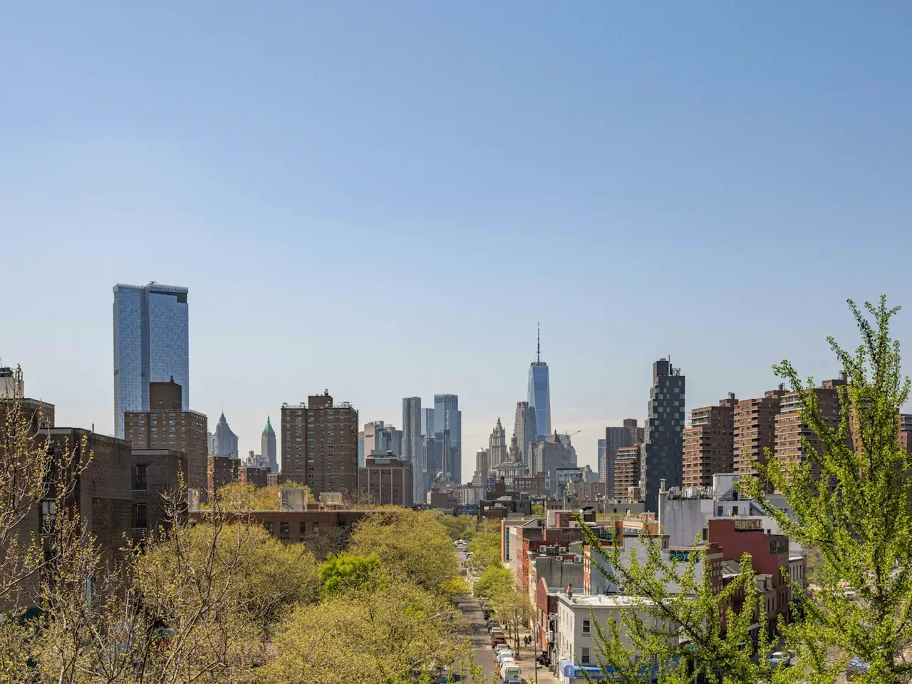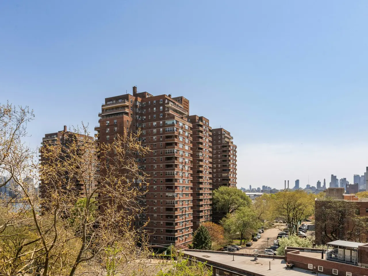 - Views of downtown skyline, trees, and sky