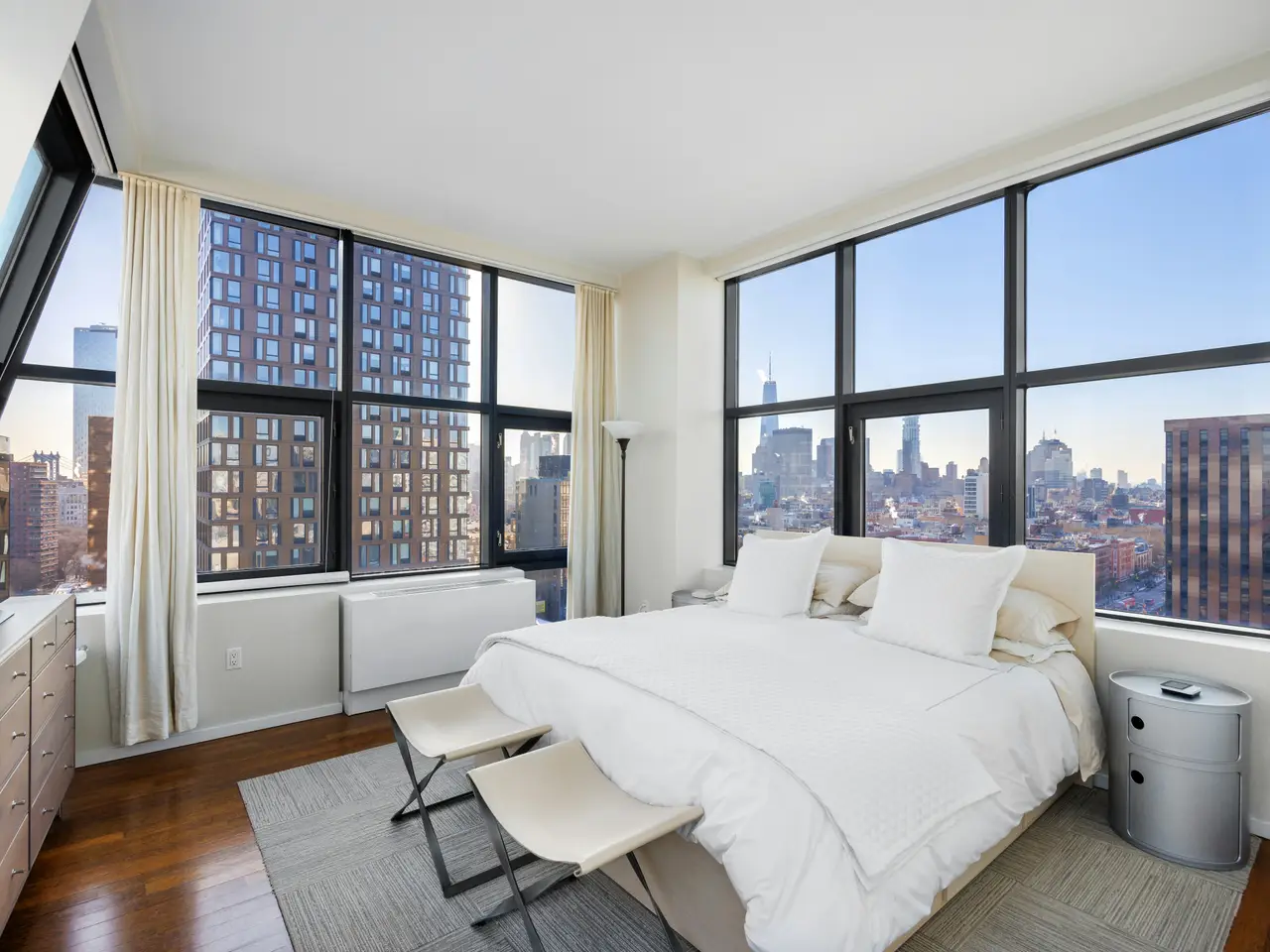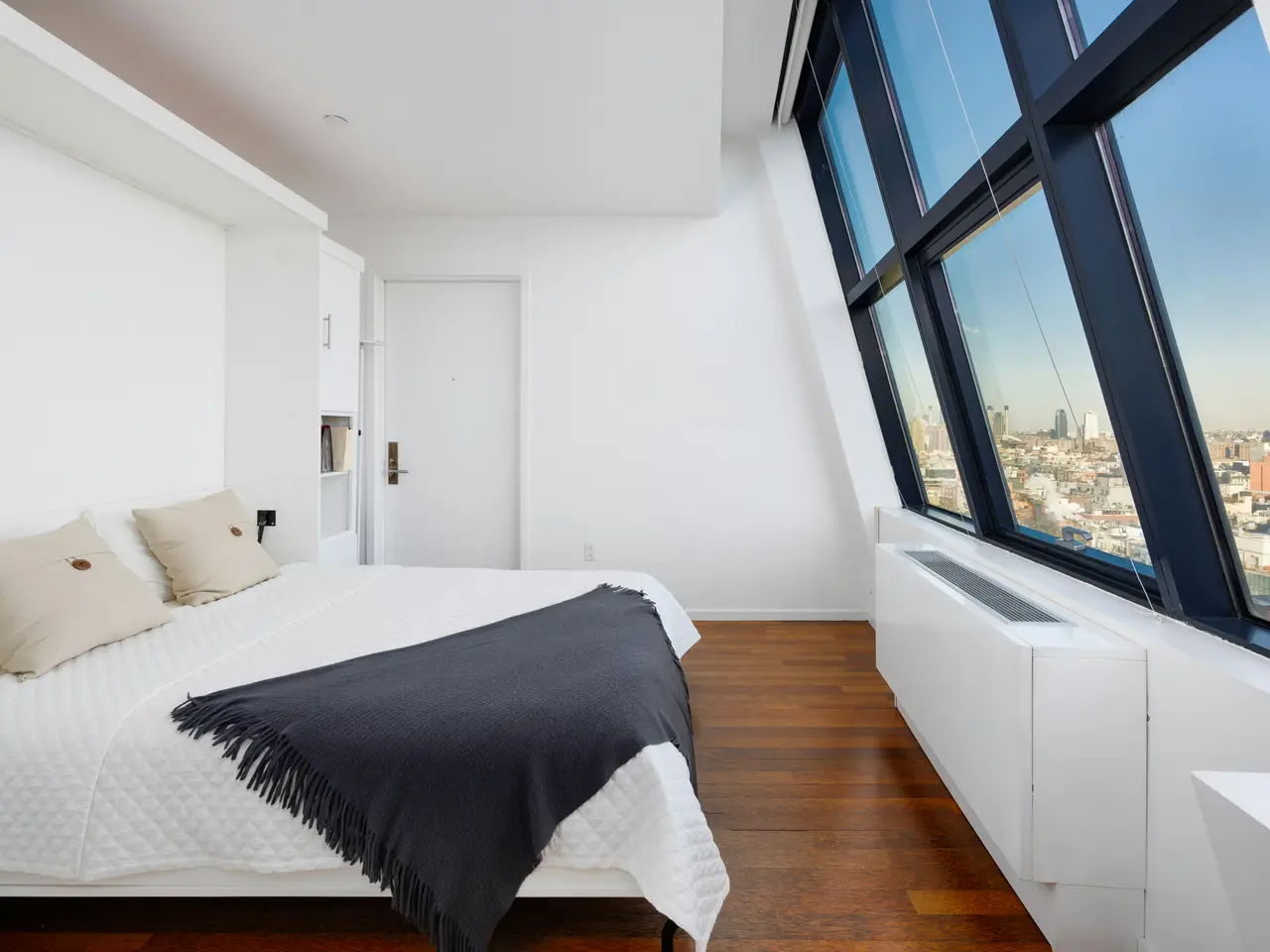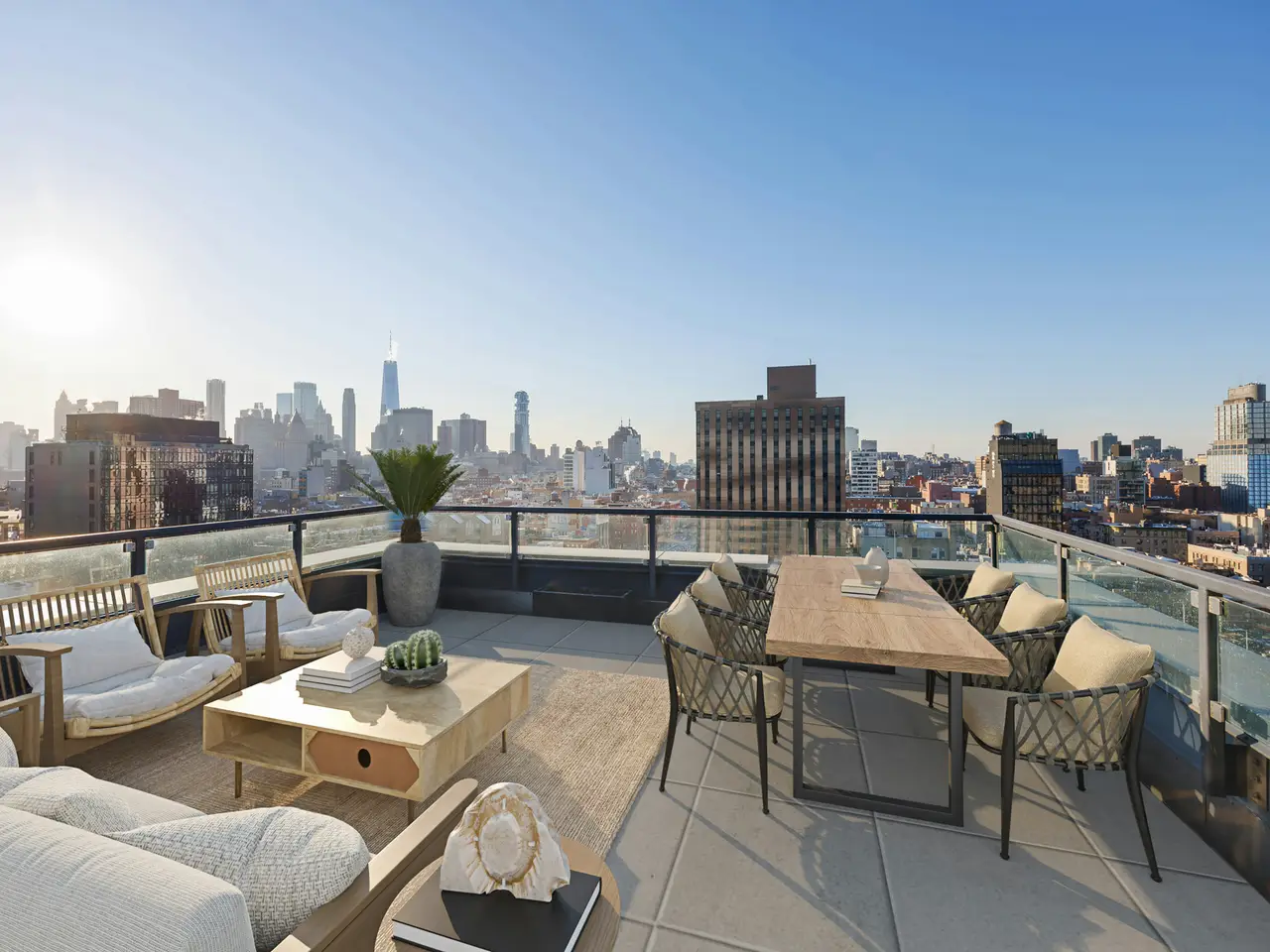 True Duplex penthouse condos (no one living above you) are rare; there are currently only 12 listed. Not only is this the least expensive, but the average cost of the other 11 is almost double that of this listing. This is not because this one is a slouch-quite the opposite. To begin with, it has the best view of all of them, but there is so much more because, at 2,500 sf, this true penthouse with two bedrooms, three baths, and an oversized Direct Living terrace is a perfect home. The lower floor is completely dedicated to the public spaces, while the upstairs is for the private areas, and the two are seamlessly separated by a windowed staircase. The key-locked elevators open on the public floor, so let's begin here. The first thing you notice is the clever flow created by opening the wall between the foyer and the kitchen. This improved both rooms. The vestibule is now a bright area with ingenious storage spaces and display shelves, ensuring that this often-forgotten spot is fully integrated, it even has a full bathroom on the north end. This bathroom's noteworthy feature is a widowed shower. (don't worry no neighboring building is high enough). The living spaces on the south side of the gallery are striking with their panoramic views (not hyperbole here. However, they need to be seen in person to be fully appreciated because the 10+ft ceiling height, full-height glass on three sides, and a slant on the east side make the room appear smaller in pictures. However, the floor plan does not lie, at 17x32, this is a very large room. One standout feature of this penthouse is the perfectly proportioned Direct Living terrace. At an almost square configuration, this terrace is perfect for entertaining. With nearly 300 degrees of open views, you have plenty to gawk at, but with no building blocking your view North, your vista of midtown is among the best I have ever seen. The kitchen is truly a study in clever design, and what you end up with is a very practical space with stunning views, plenty of storage, and commercial-grade appliancestruly a chef's dream. The aforementioned opening to the vestibule makes the kitchen feel much larger and creates a super cool dining counter. While the low storage cabinets on the slanted east wall are so clever, you can see the next owner continuing them everywhere this wall is exposed. Up the windowed staircase are two bedrooms, each with an ensuite bathroom, the smaller bedroom has a wall of windows facing east, awarding you perfect sunrise views framed by the Williamsburg Bridge, which is quite unique. The primary is a complete suite with a walk-in closet, a five-fixture bathroom, and three exposures. Regardless of the open feel these windows provide, privacy is ensured throughout, with no building on your elevation within reach. To round out the offering on the table here, the apartment has a washer and dryer. And this unit comes complete with a private storage space with its own electricity, making it a perfect wine storage. The Condo building is called BLUE; it was built in 2007 by the acclaimed architect Bernard Tschumi. It offers 8000 square feet of terraces along with Fios internet, refrigerated storage, a bike room, a full-time doorman, and concierge services. Conveniently situated fifty feet from the F-J-M-Z trains, BLUE is nestled within the vibrant heart of New York's bustling Lower East Side, with all of your favorite amenities, including the famed Essex Market, Katz' Delicatessen, Russ & Daughters, the New Museum and so much more.